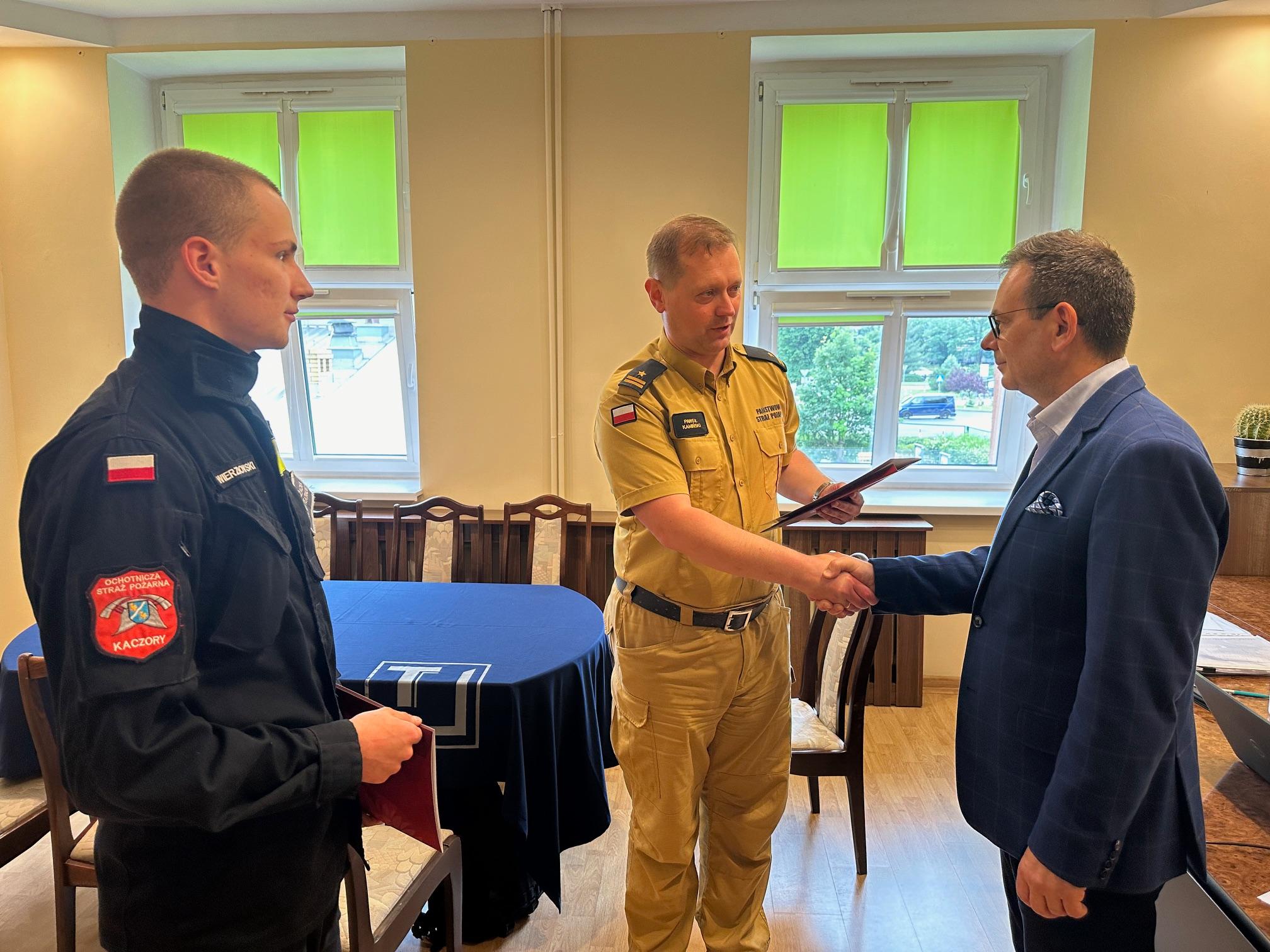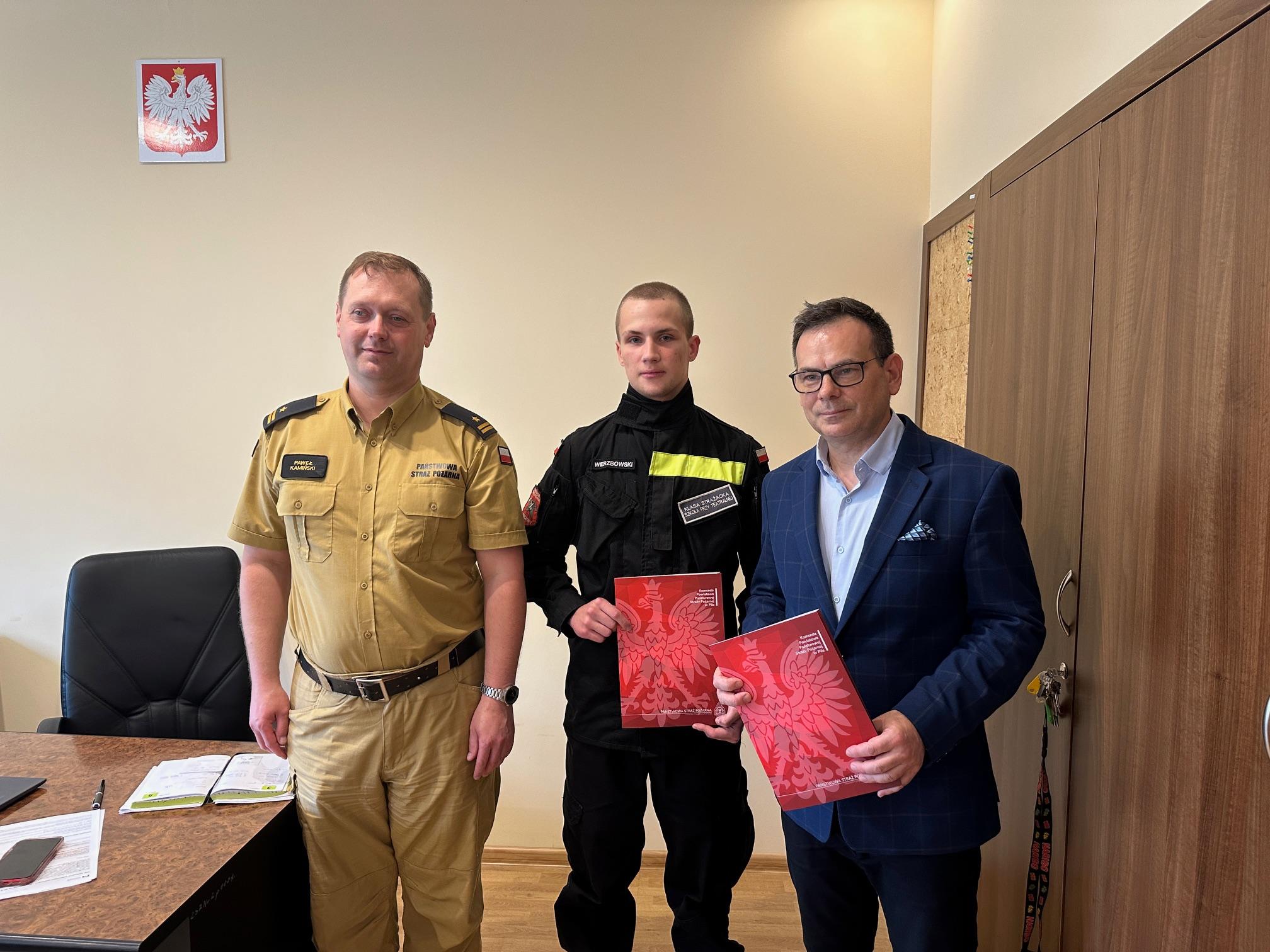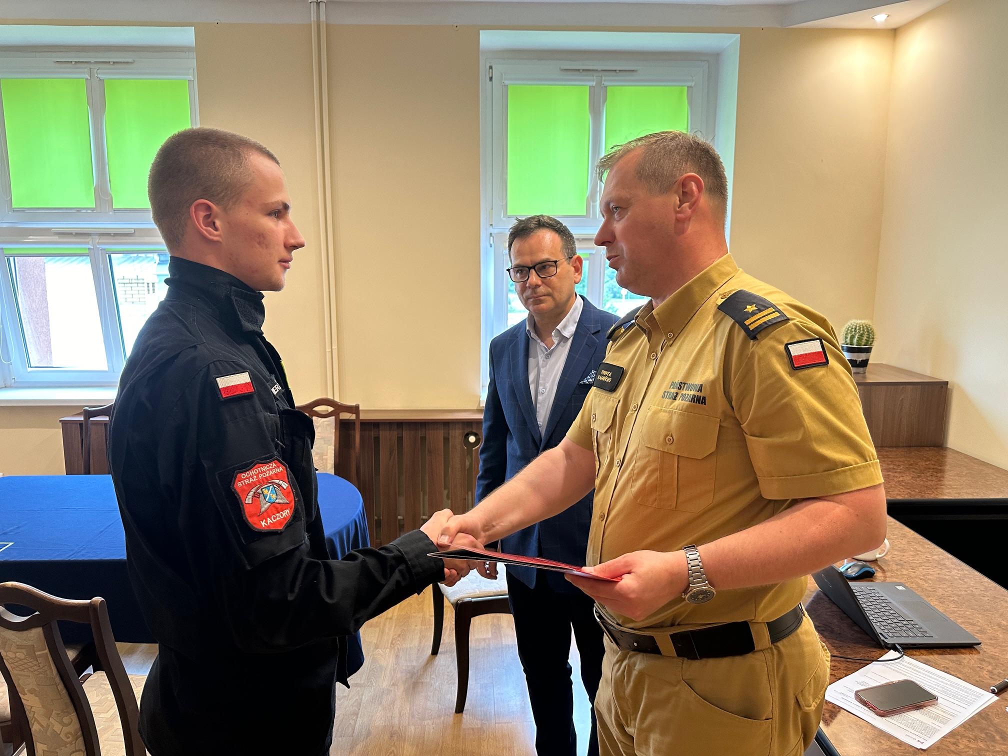 03 czerwca 2024 roku, odbyło się spotkanie w Zespole Szkół przy Teatralnej w Pile, podczas którego p.o. Komendant Powiatowy Państwowej Straży Pożarnej w Pile, mł. bryg. Paweł Kamiński podziękował Panu Maciejowi Wierzbowskemu – uczniowi klasy strażackiej Zespołu Szkół przy Teatralnej w Pile, a jednocześnie członkowi Młodzieżowej Drużyny Pożarniczej Ochotniczej Straży Pożarnej w Kaczorach, za podjęte pierwsze działania ratownicze podczas wypadku samochodu osobowego z pociągiem, do którego doszło 28 maja 2024 roku w Pile, przy ulicy Wawelskiej.