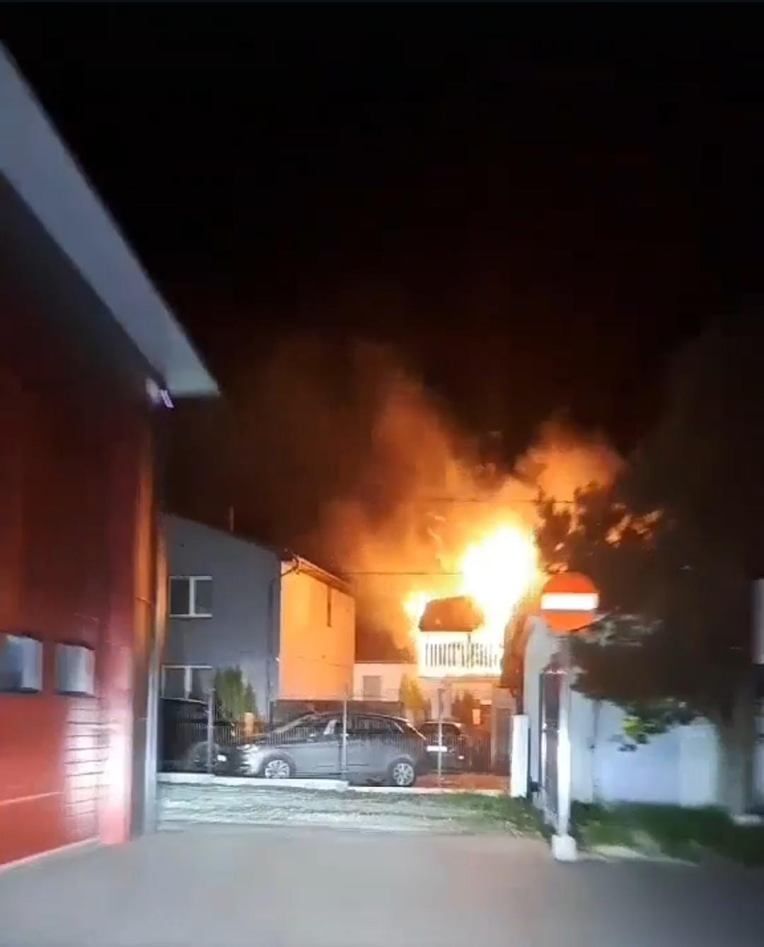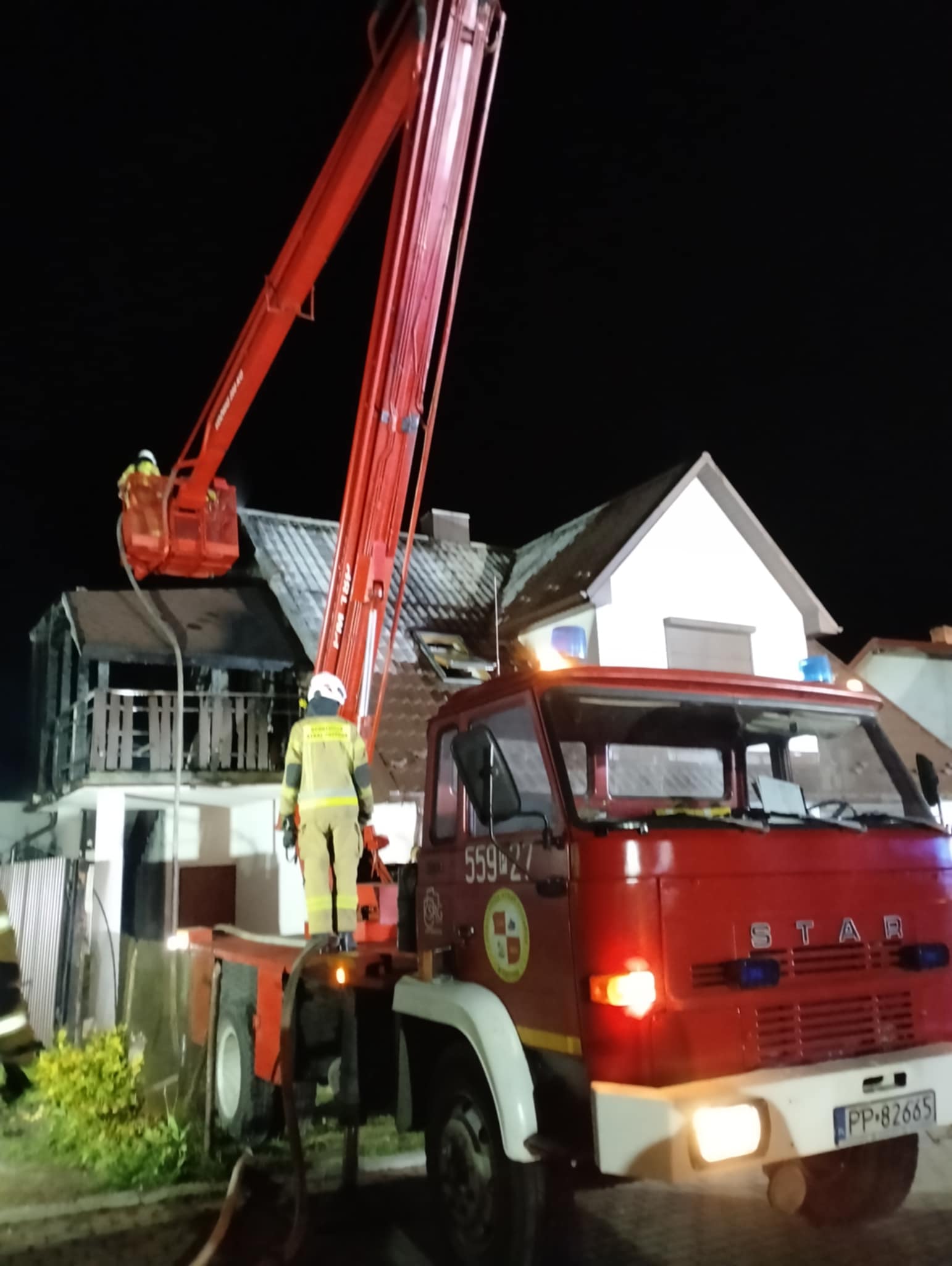 Po przybyciu pierwszych zastępów straży pożarnej na miejsce zdarzenia, stwierdzono rozwinięty pożar tarasu, części elewacji domu oraz poddasza. Natychmiast strażacy podali 2 prądy wody w natarciu na palący się obiekt oraz 1 prąd wody w obronie na sąsiedni budynek.