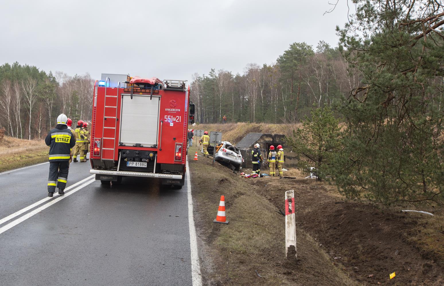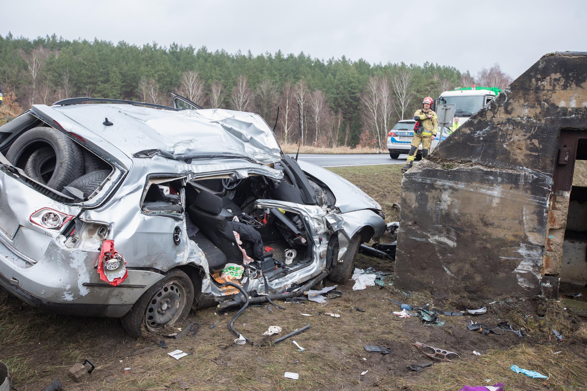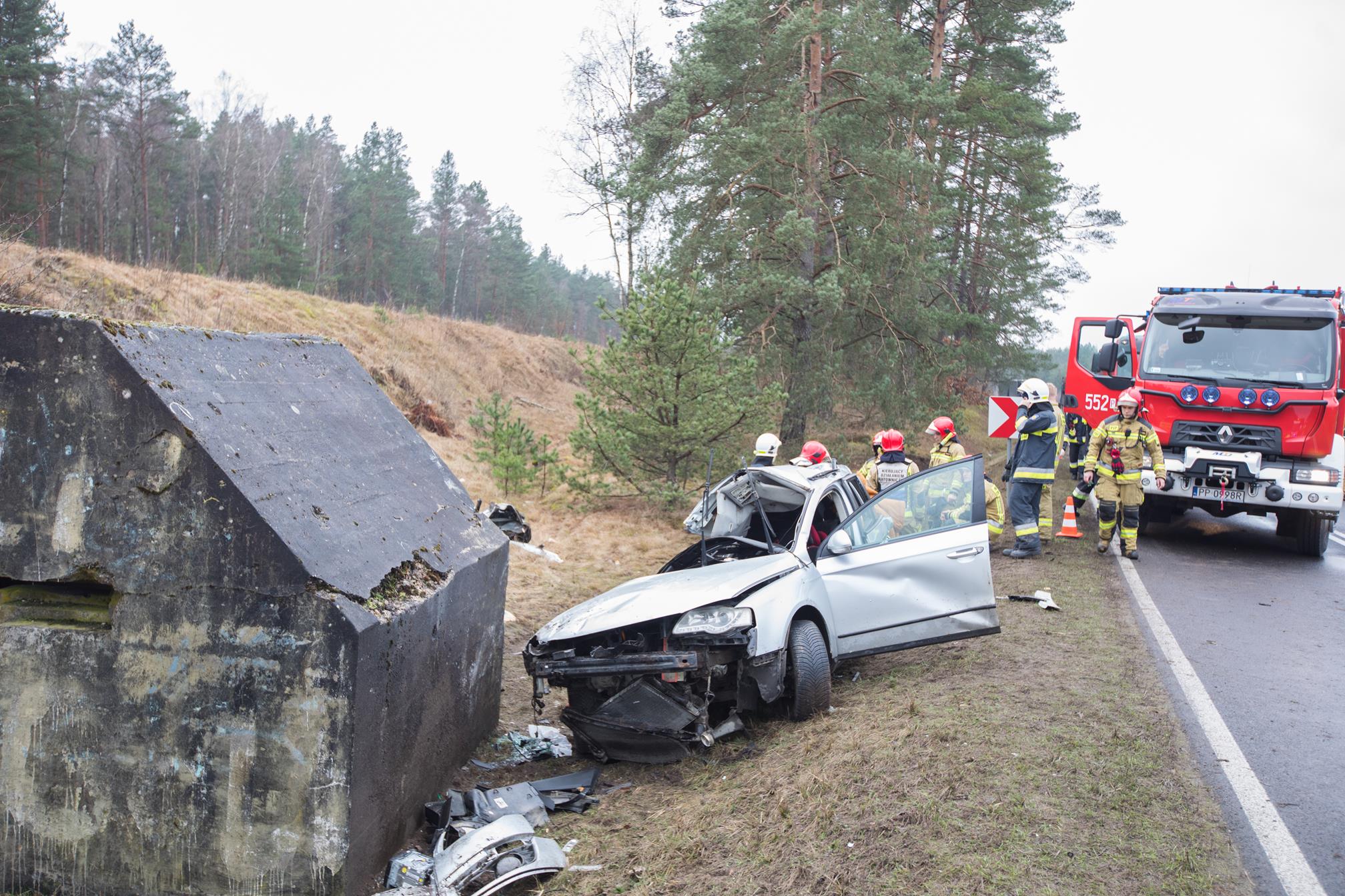 Kierujący samochodem osobowym zjechał z jezdni, a kierowany przez niego pojazd uderzył w bunkier z czasów II Wojny Światowej. W wyniku zdarzenia dwoje podróżujących zostało uwięzionych w silnie zdeformowanym aucie.
