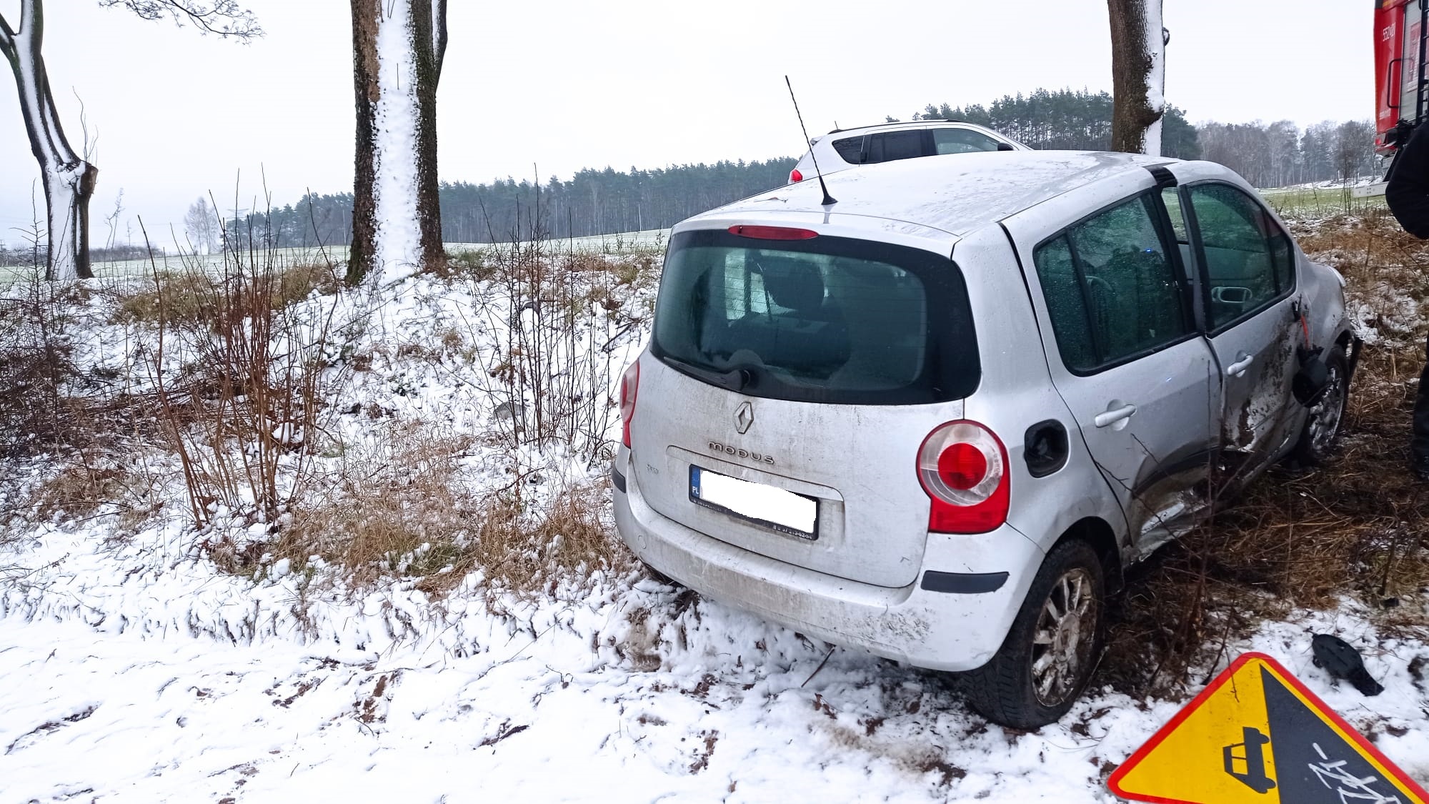 Na miejscu okazało się, że samochód wypadł z drogi, niszcząc przy tym znak drogowy. Pojazdem podróżowały 2 osoby, które opuściły go jeszcze przed przyjazdem zastępów straży pożarnej. Na szczęście w tym zdarzeniu nikt nie odniósł obrażeń.