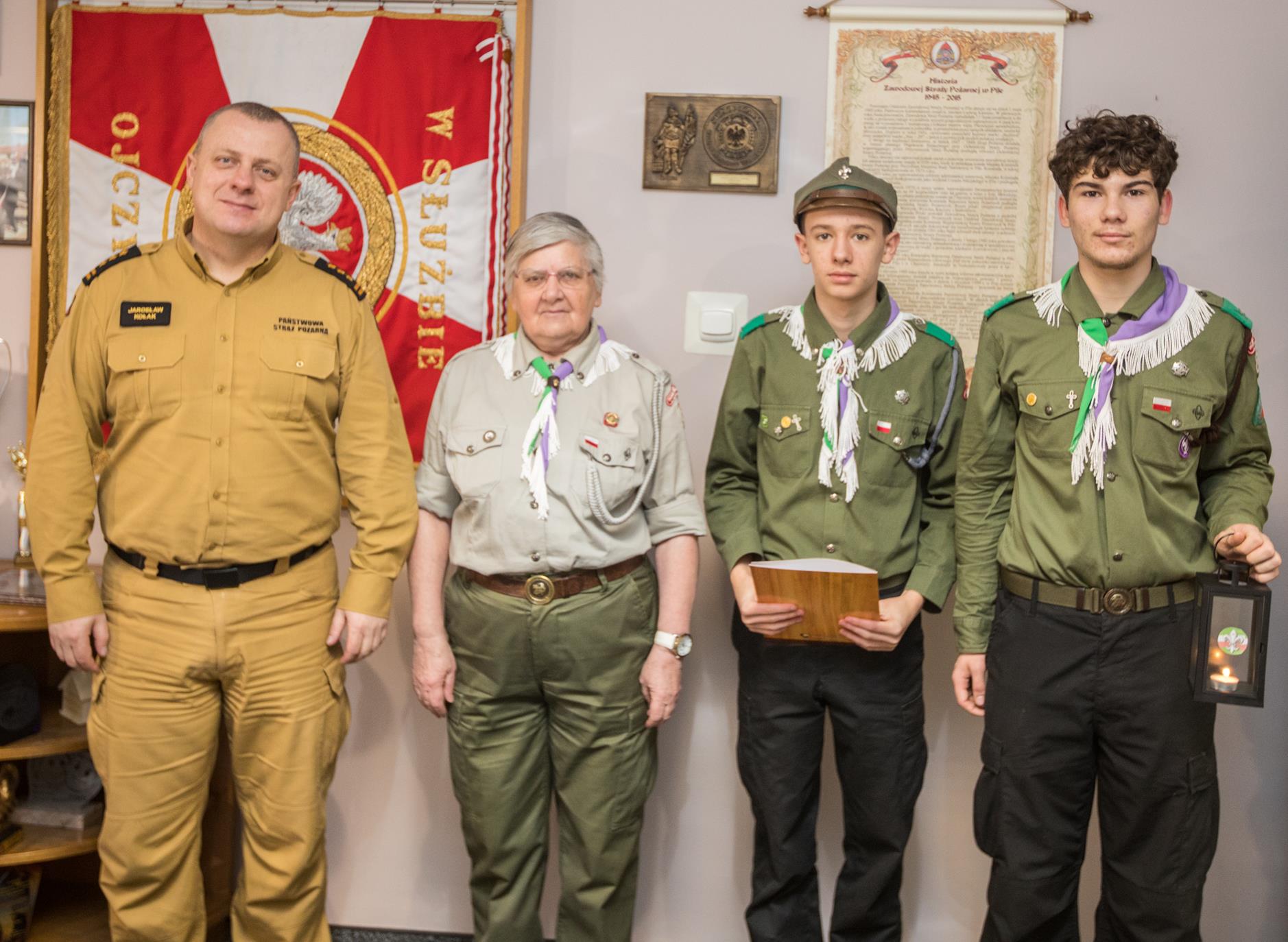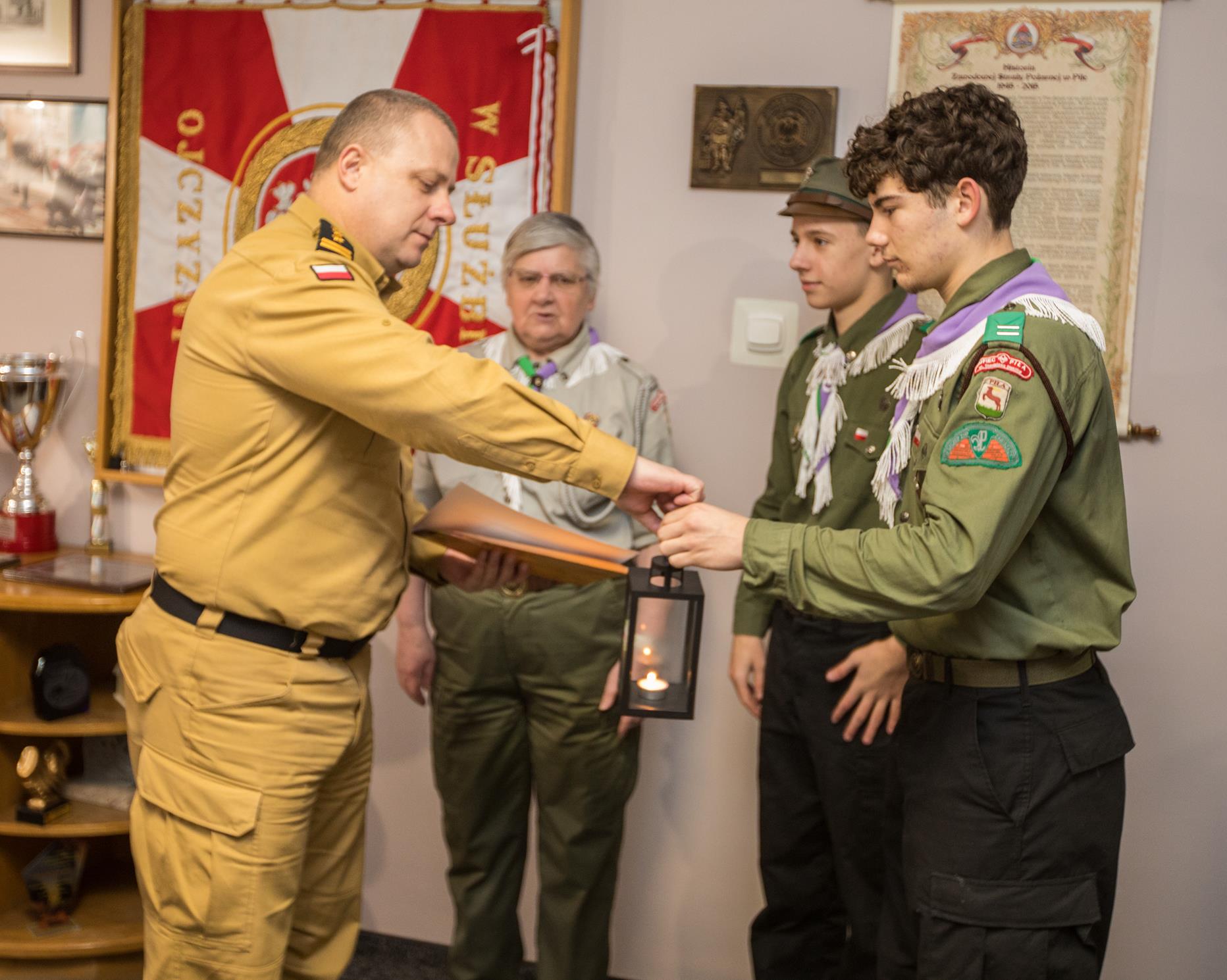 Rano na ręce st. bryg. Jarosława Kołaka – Komendanta Powiatowego PSP w Pile harcerze z miejscowego hufca ZHP przekazali Betlejemskie Światło Pokoju.