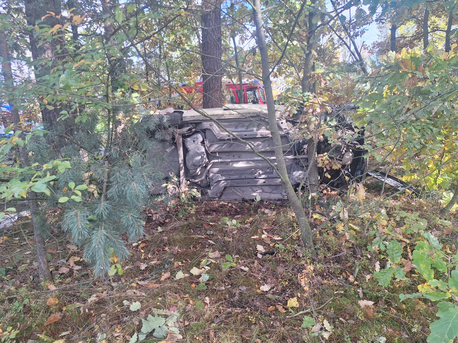 Po przybyciu na miejsce zdarzenia zadysponowanych strażaków stwierdzono, że na prostym docinku drogi, samochód osobowy znajduje się na boku w przydrożnym lesie. Wewnątrz pojazdu znajduje się przytomny 60 letni kierujący, z obrażeniami ciała.
