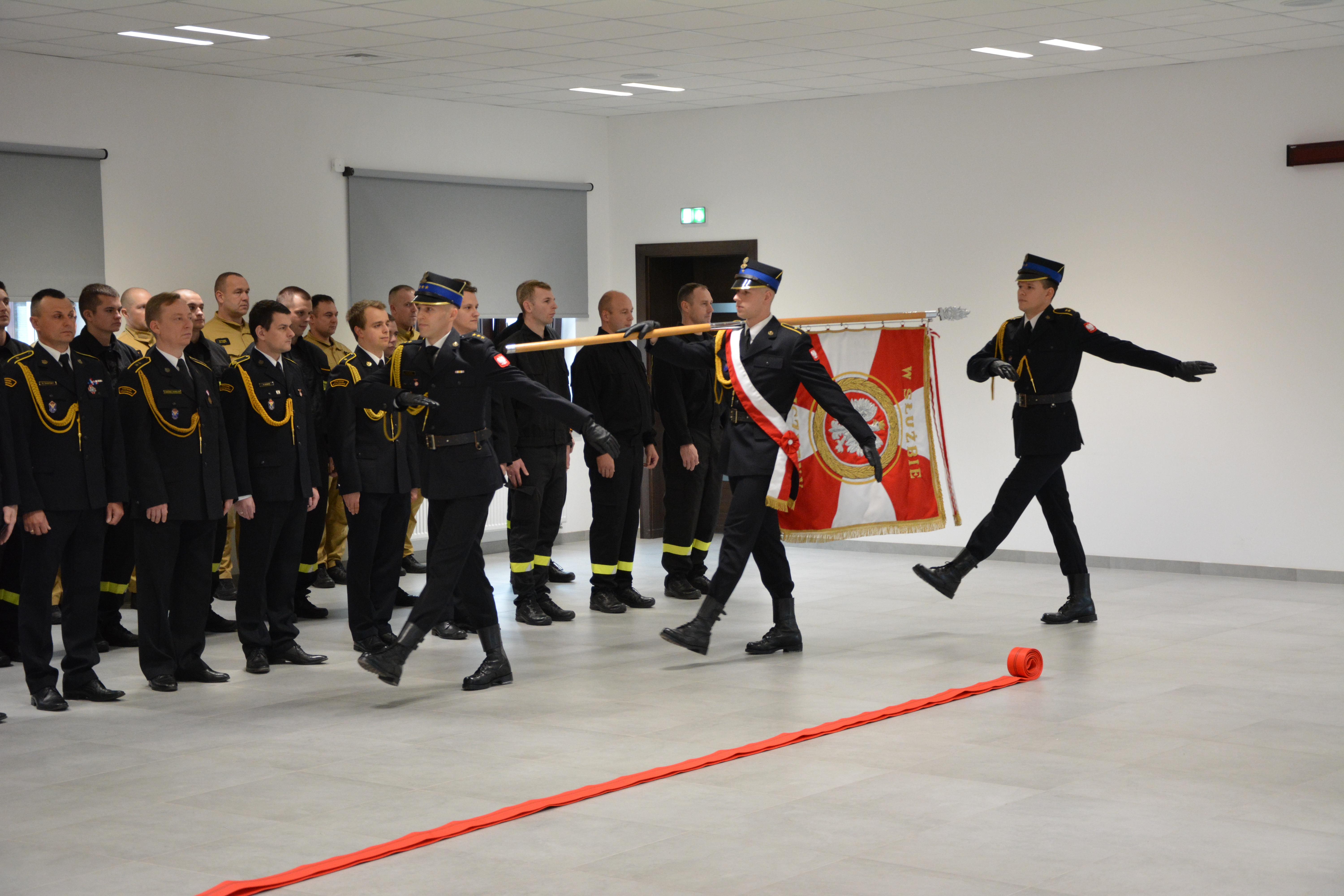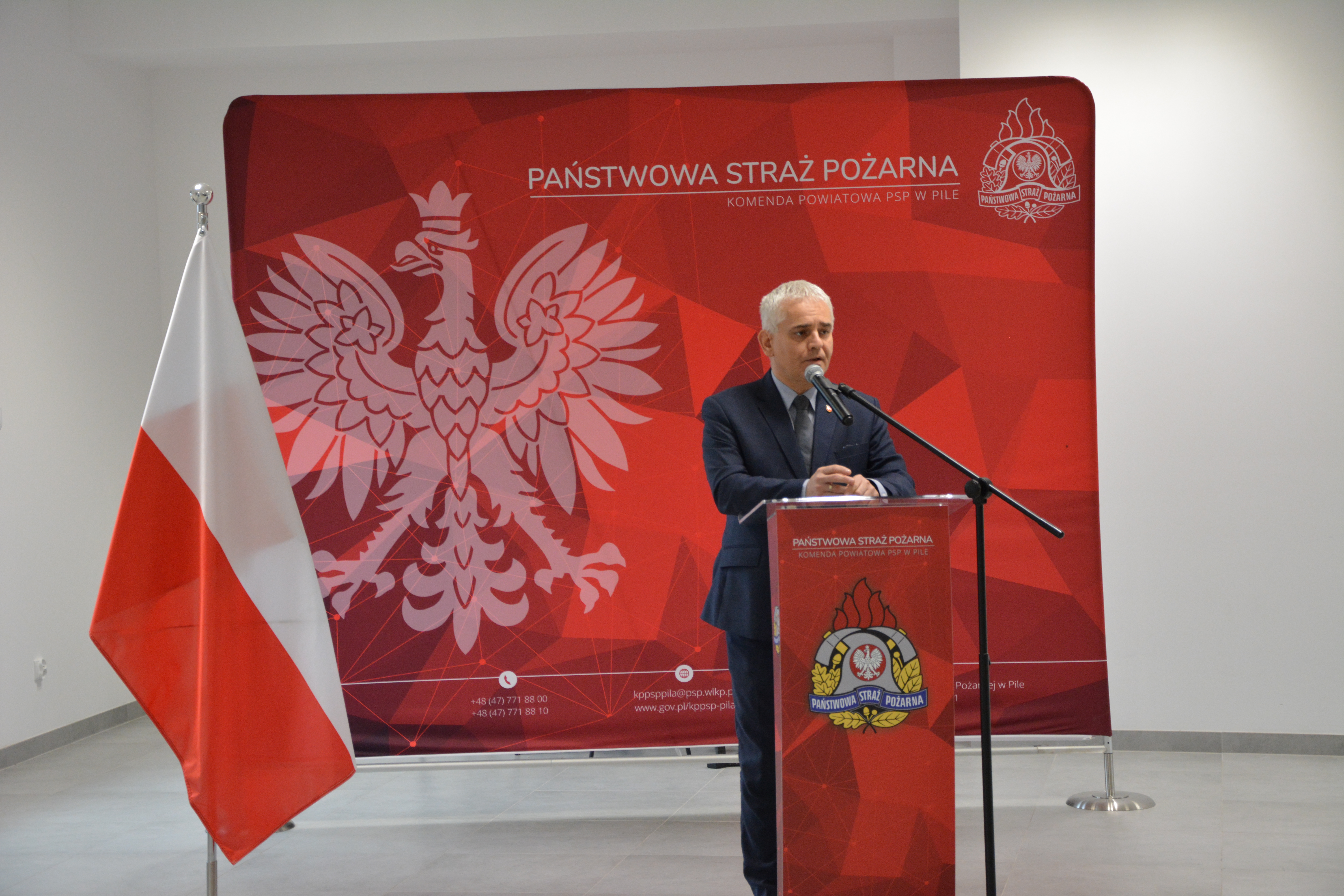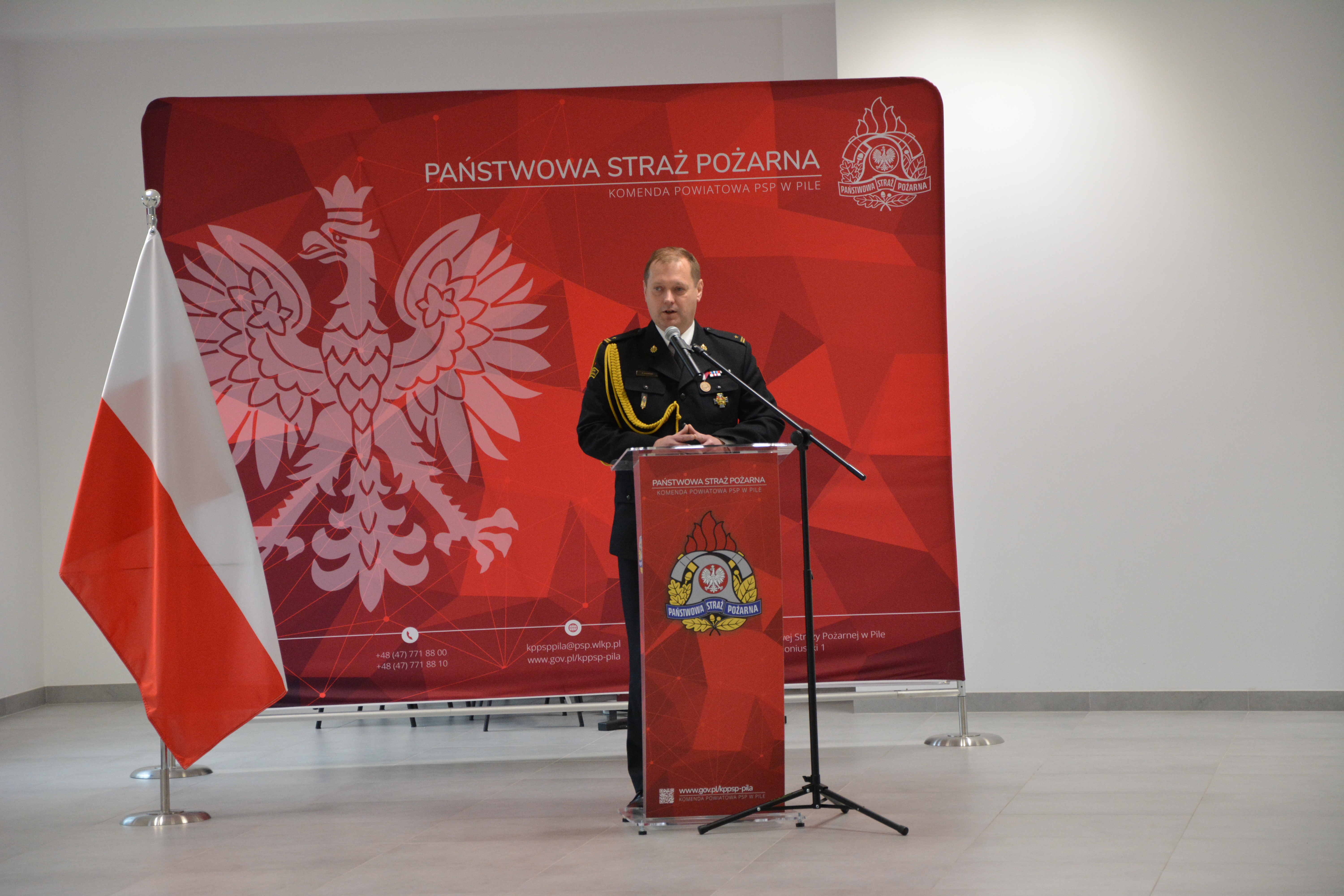 Uroczystość rozpoczęła się od złożenia meldunku, przez dowódcę uroczystości mł. bryg. Grzegorza Orłowskiego, Komendantowi Powiatowemu Państwowej Straży Pożarnej w Pile mł. bryg. Pawłowi Kamińskiemu, po czym odegrano hymn państwowy.