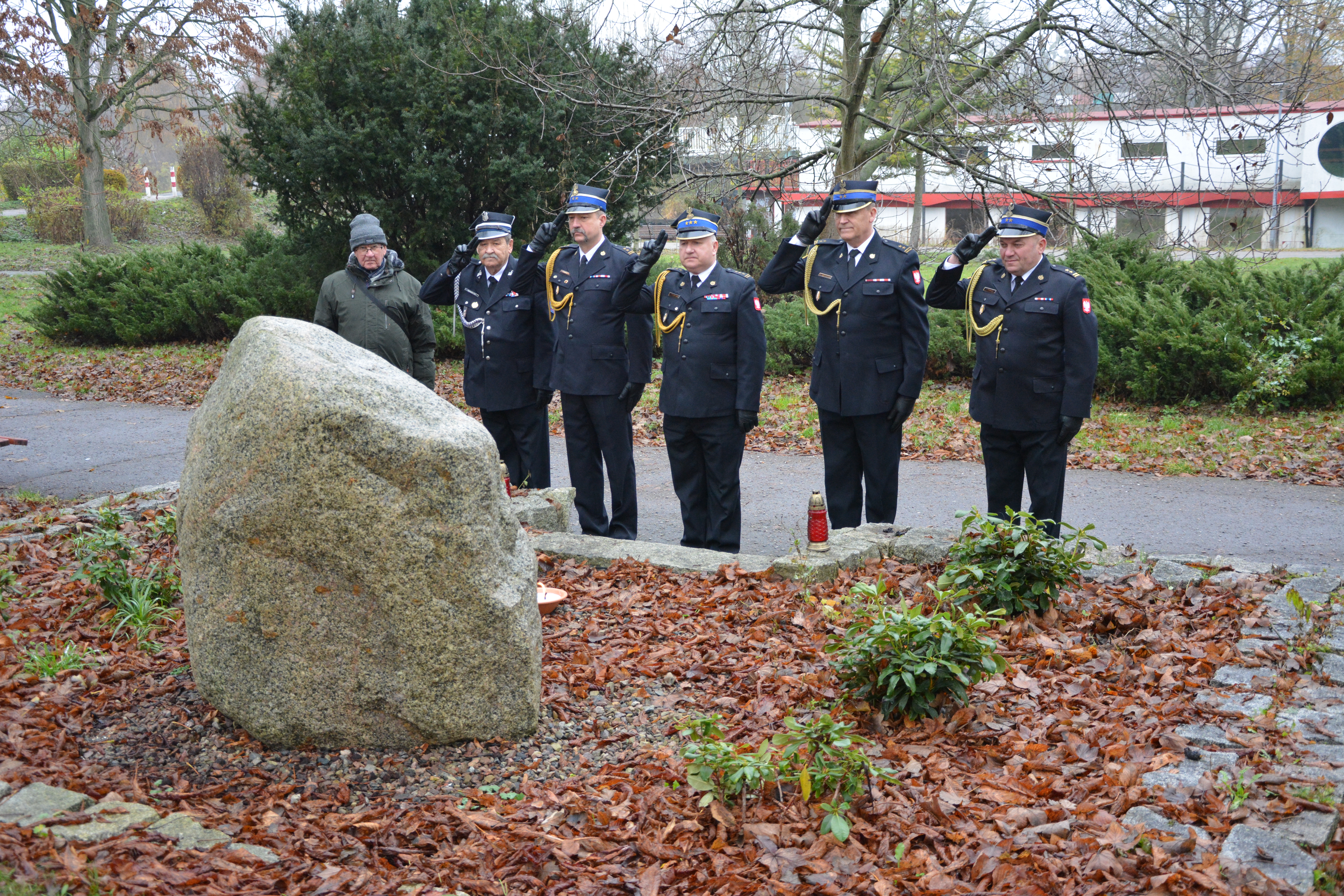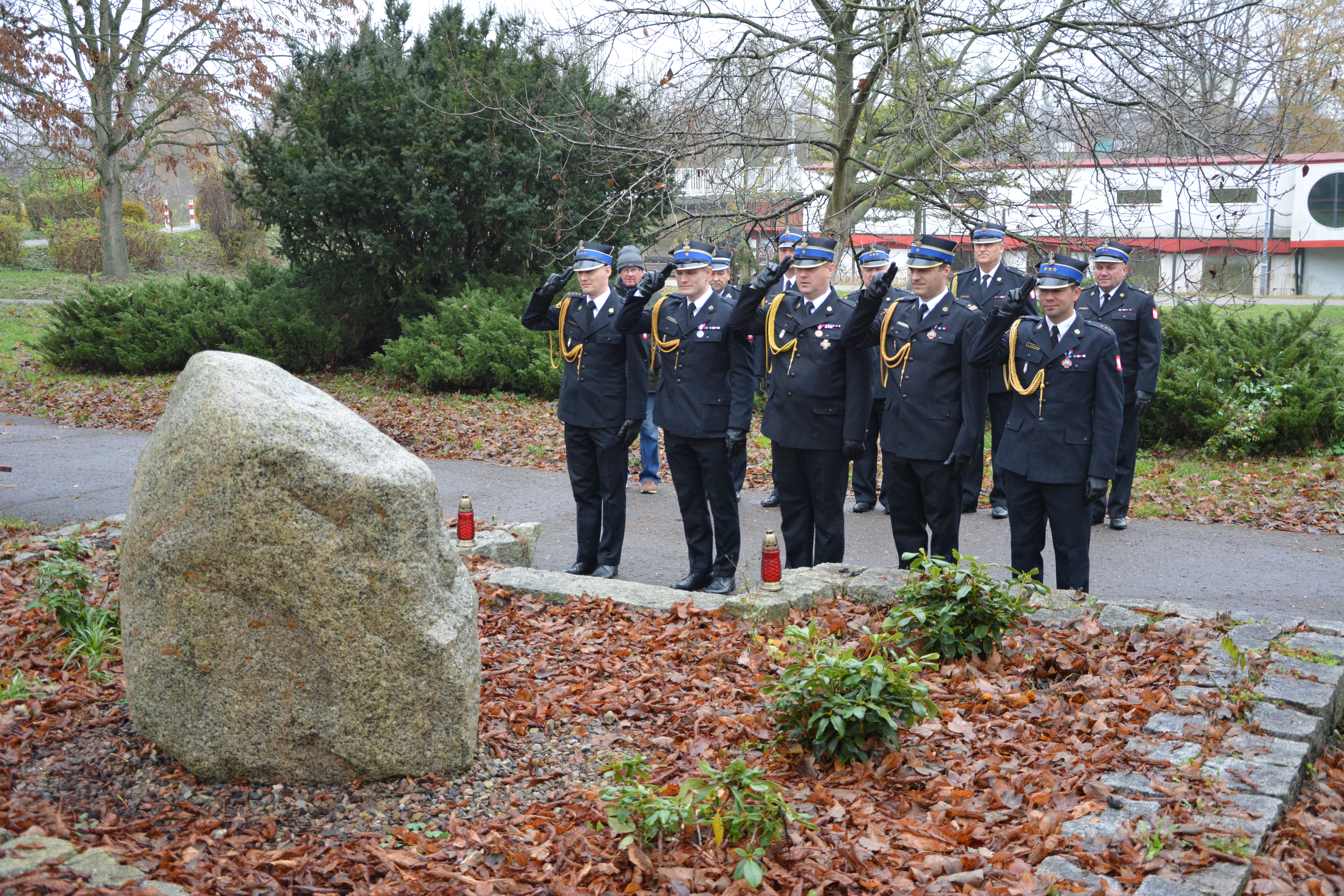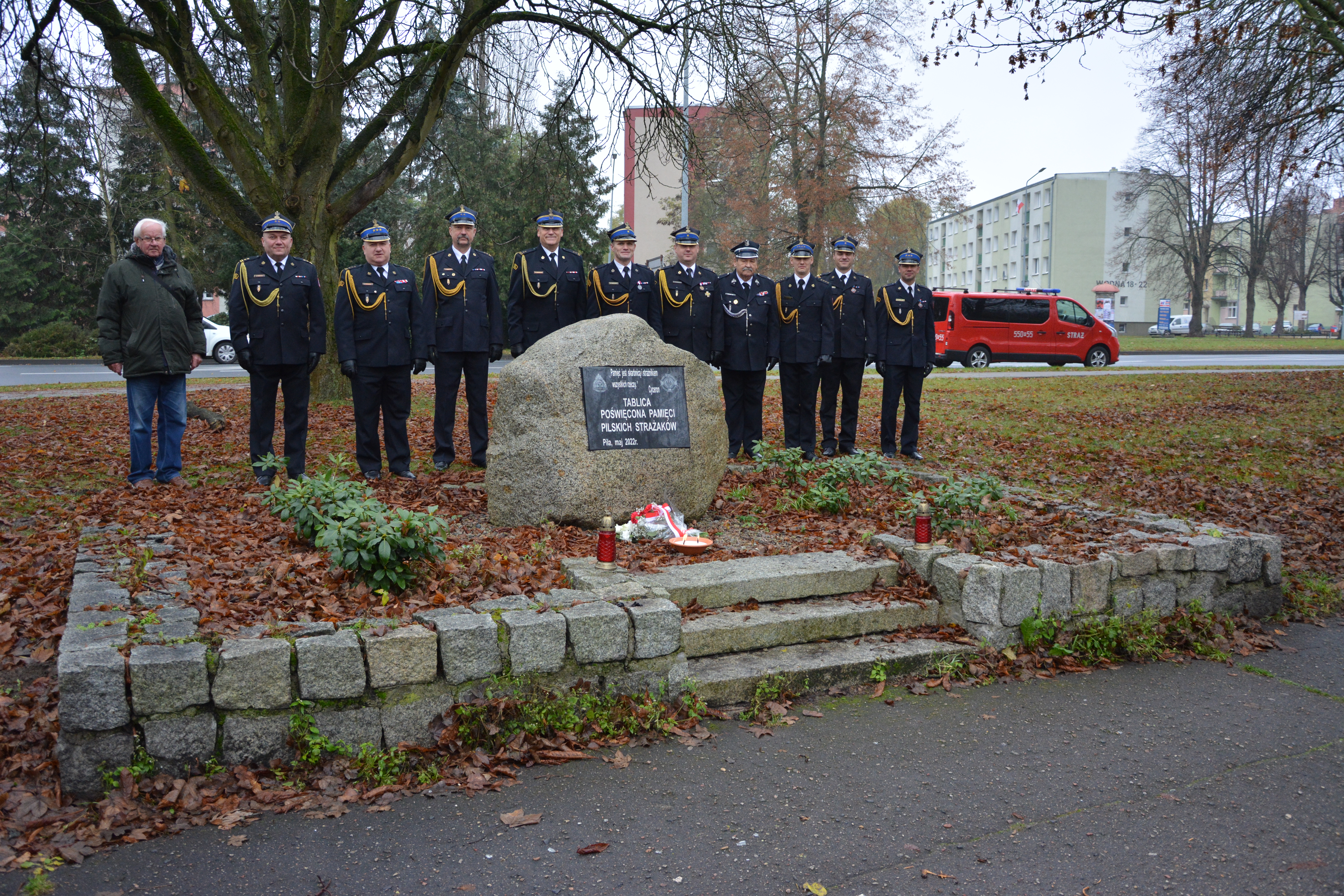 Przed uroczystymi obchodami Dnia Niepodległości, kierownictwo Komendy Powiatowej PSP w Pile, wraz z grupą inicjaywną - strażakami będącymi na zaopatrzeniu emerytalnym, złożyli wiązankę i zapalili znicz na obelisku poświeconym pamięci zmarłych strażaków, który znajduje się w Pile, przy ul. Wodnej.