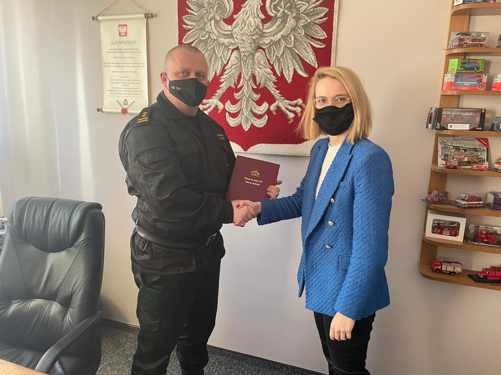 Pani Poseł złożyła gratulacje Panu Komendantowi z okazji powierzenia obowiązków służbowych Komendanta Powiatowego Państwowej Straży Pożarnej w Pile.