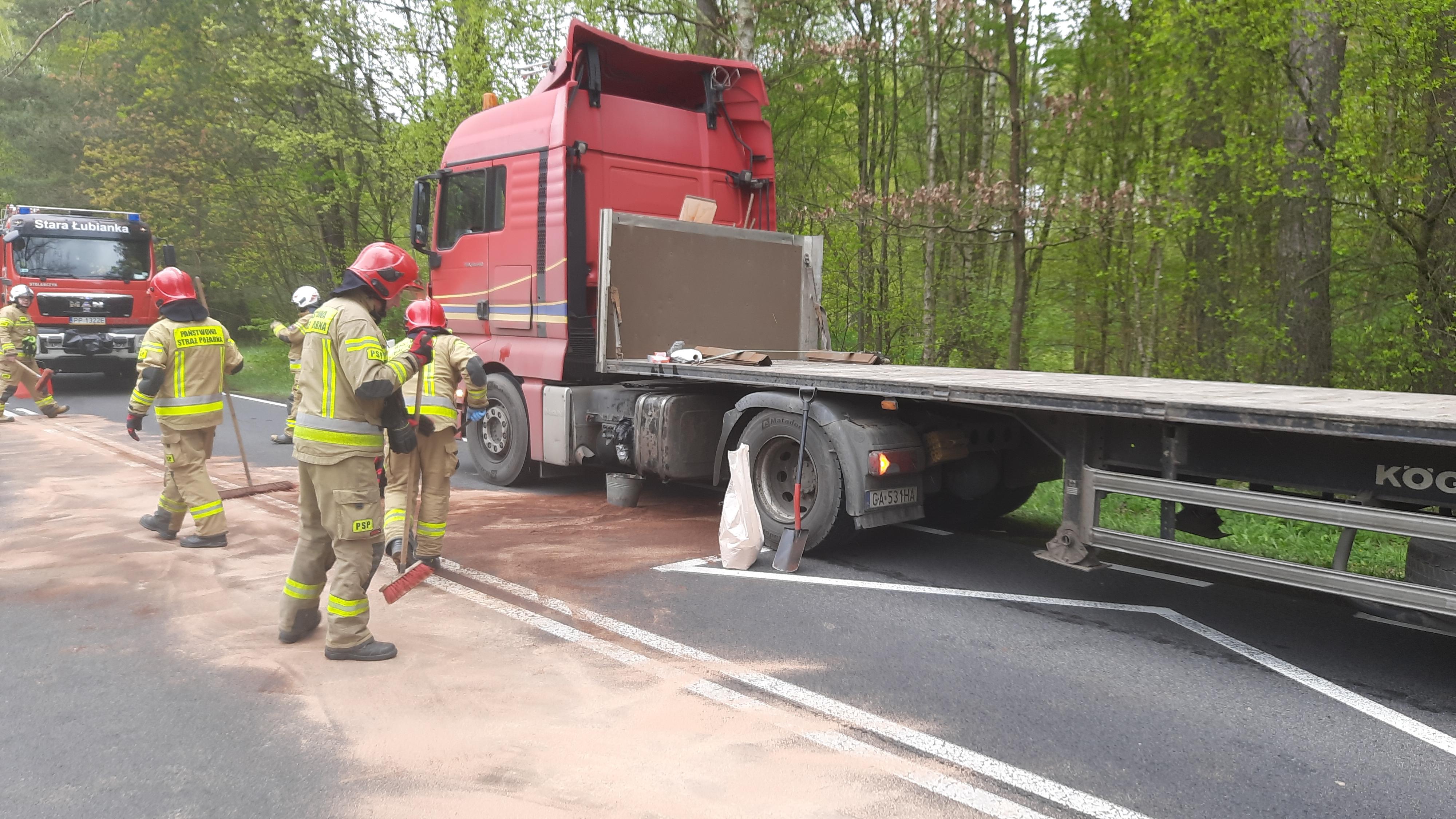 Strażacy po przybyciu na miejsce zdarzenia zastali wyciek z układu paliwowego ciągnika siodłowego. Działania polegały na usunięciu wycieku paliwa. Na miejsce zdarzenia dotarł serwis, który dokonał naprawy umożliwiającej dalszą jazdę.