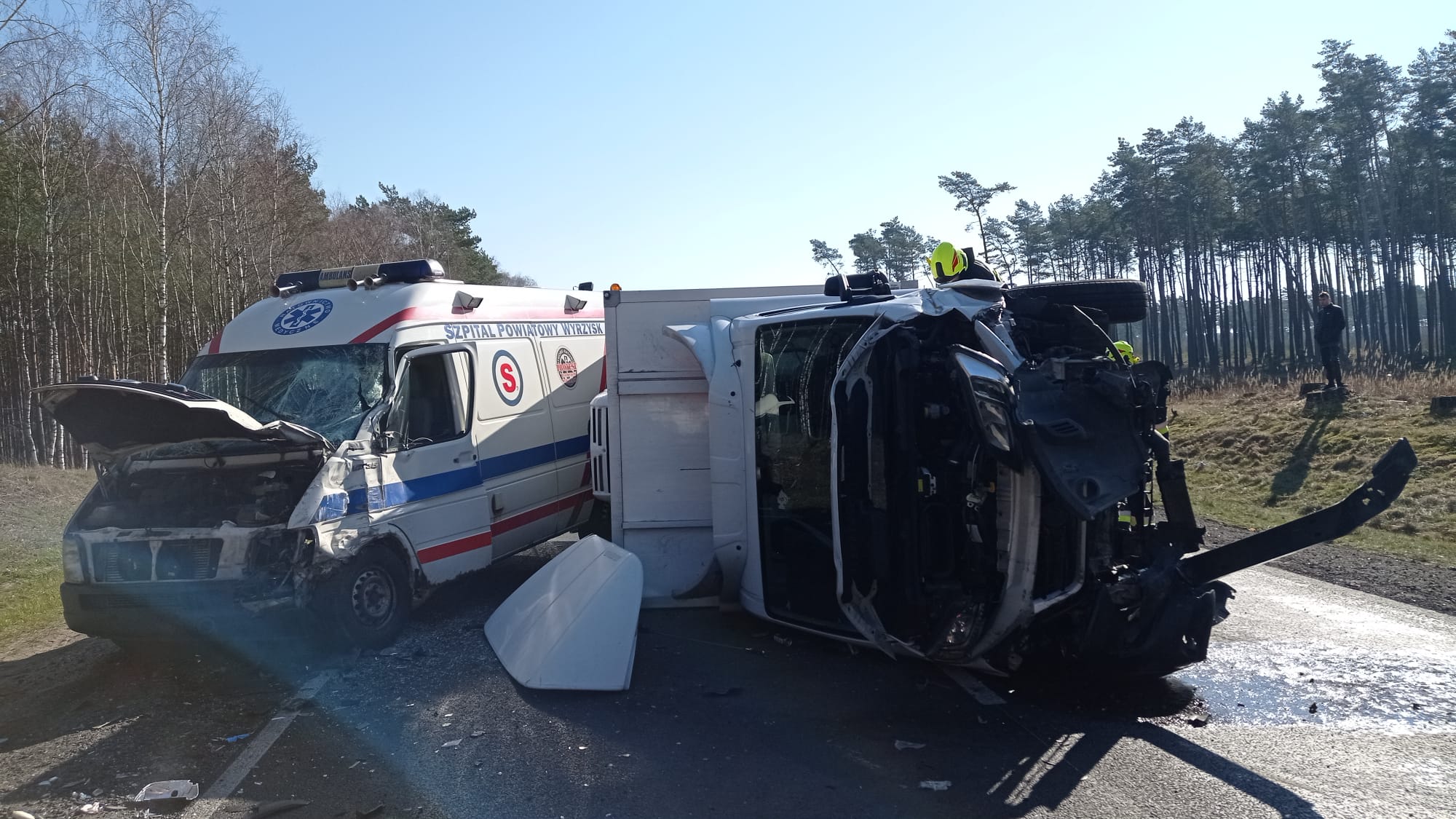W wyniku zdarzenia jeden z samochodów dostawczych przewrócił się na bok. Łącznie pojazdami podróżowało 5 osób. W wyniku wypadku trzy osoby zostały poszkodowane, w tym ratownik medyczny oraz pacjent przewożony karetką. Działania zastępów straży polegały na zabezpieczeniu miejsca zdarzenia, udzieleniu kwalifikowanej pierwszej pomocy, postawieniu samochodu na koła za pomocą wyciągarek samochodowych oraz sorpcji rozlanych płynów eksploatacyjnych. Droga krajowa była całkowicie zablokowana przez ok. 4 godziny.