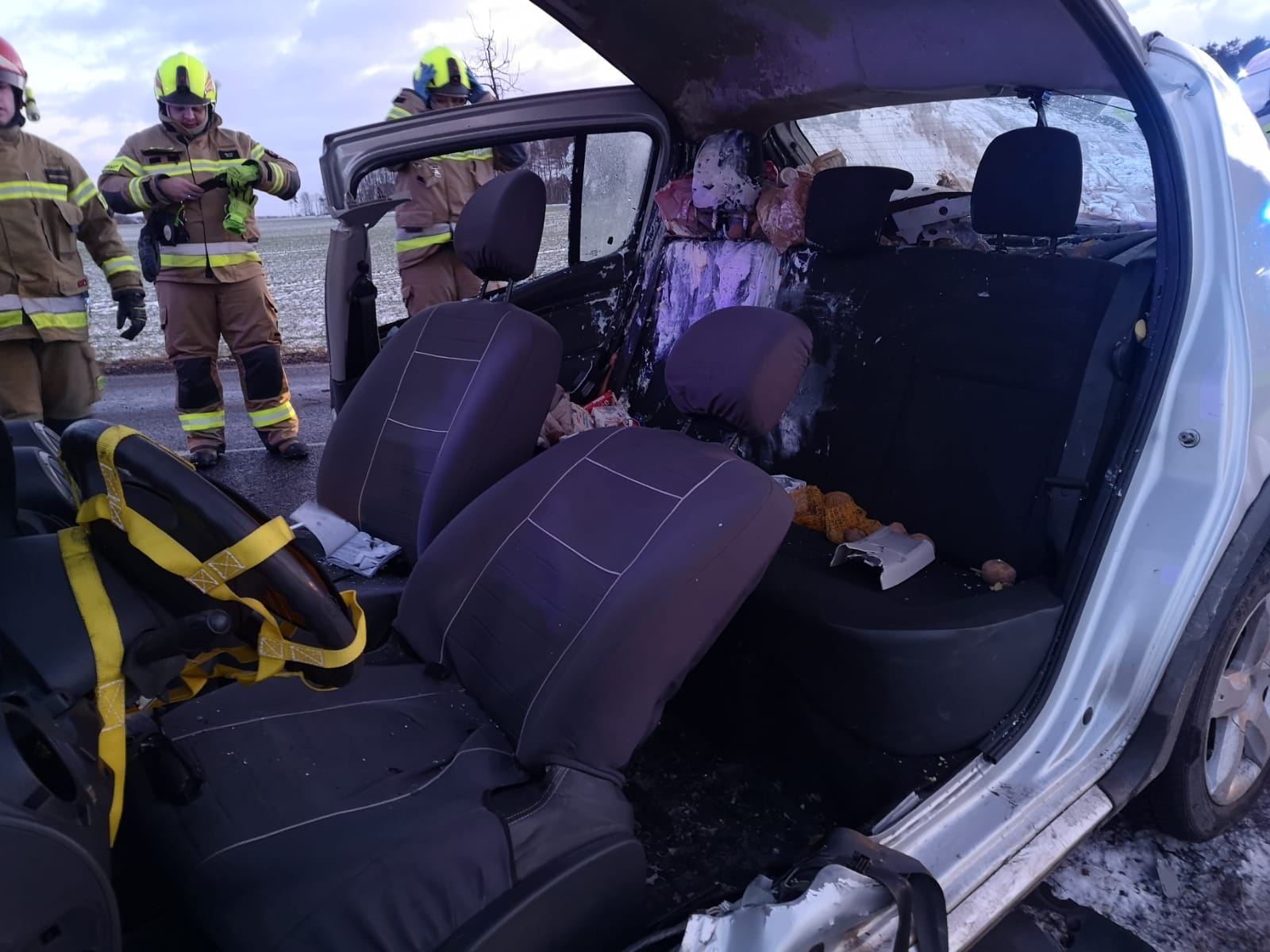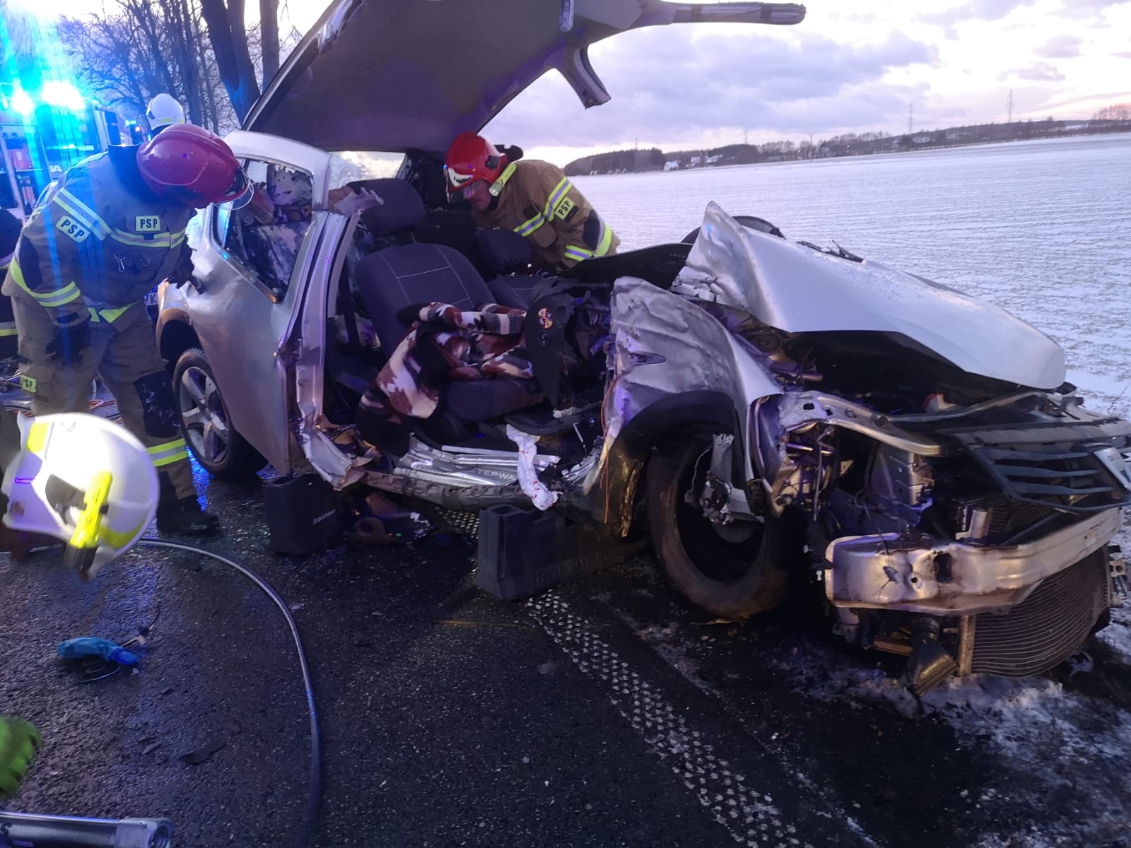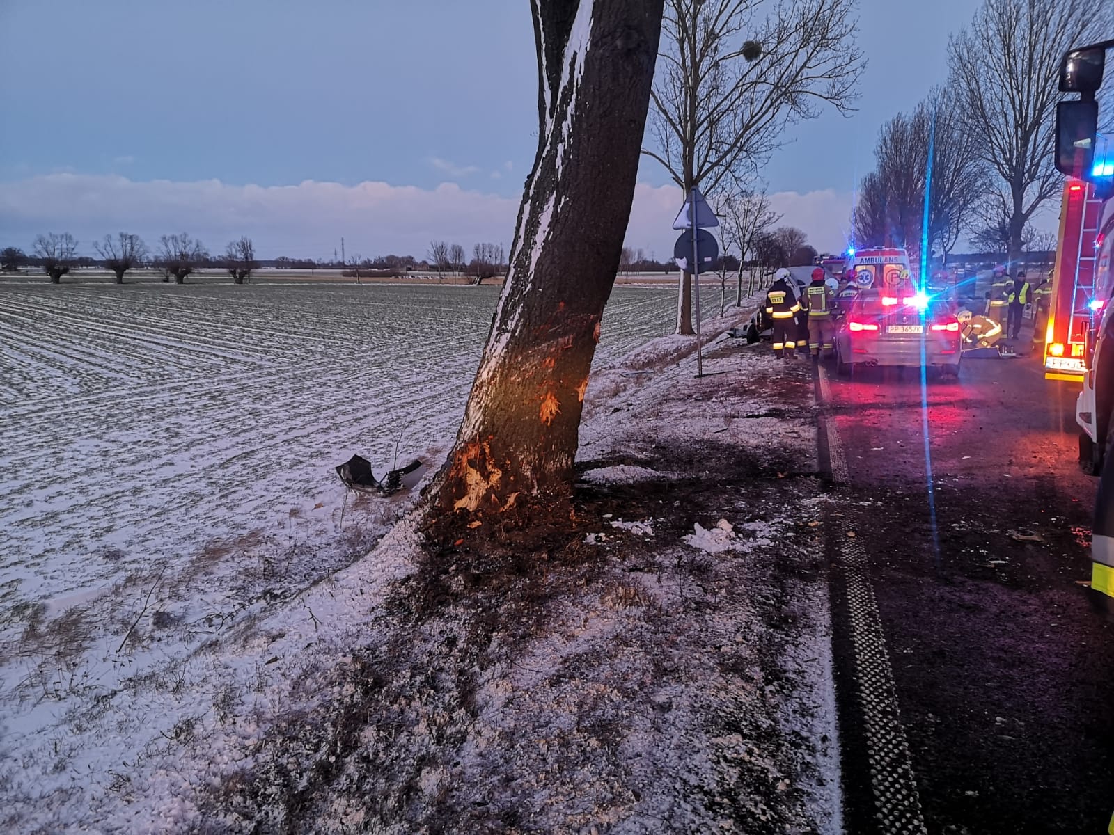 Kierująca samochodem osobowym, uderzyła w przydrożne drzewo. W wyniku zdarzenia została uwięziona w pojeździe, który blokował ruch na jednym pasie. Na miejsce wypadku dyżurny Stanowiska Kierowania Komendy Powiatowej PSP w Pile zadysponował siły i środki w liczbie trzech zastępów: JRG 2 Piła, OSP Białośliwie oraz OSP Wysoka. W działaniach uczestniczyli także Zespół Ratownictwa Medycznego oraz dwa patrole policji. Strażacy za pomocą sprzętu hydraulicznego wykonali dostęp do uwięzionych nóg poszkodowanej. Kobieta została przekazana ratownikom medycznym. Dalsze działania strażaków polegały na przestawieniu rozbitego samochodu na pobocze drogi, sorbcji rozlanych płynów eksploatacyjnych oraz uprzątnięciu z jezdni resztek powypadkowych.