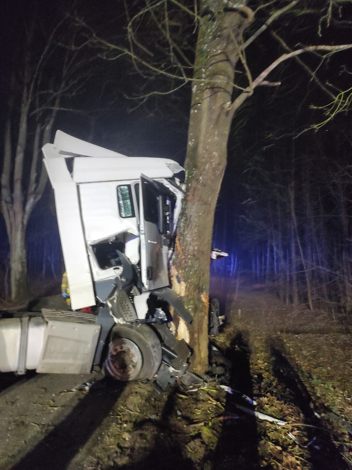 Samochód ciężarowy z niewiadomych przyczyn zjechał z drogi i uderzył w przydrożne drzewo. Kierowca opuścił pojazd o własnych siłach. Na miejscu działało 6 zastępów straży pożarnej w tym zastęp z JRG Chodzież, ZRM oraz policja.
