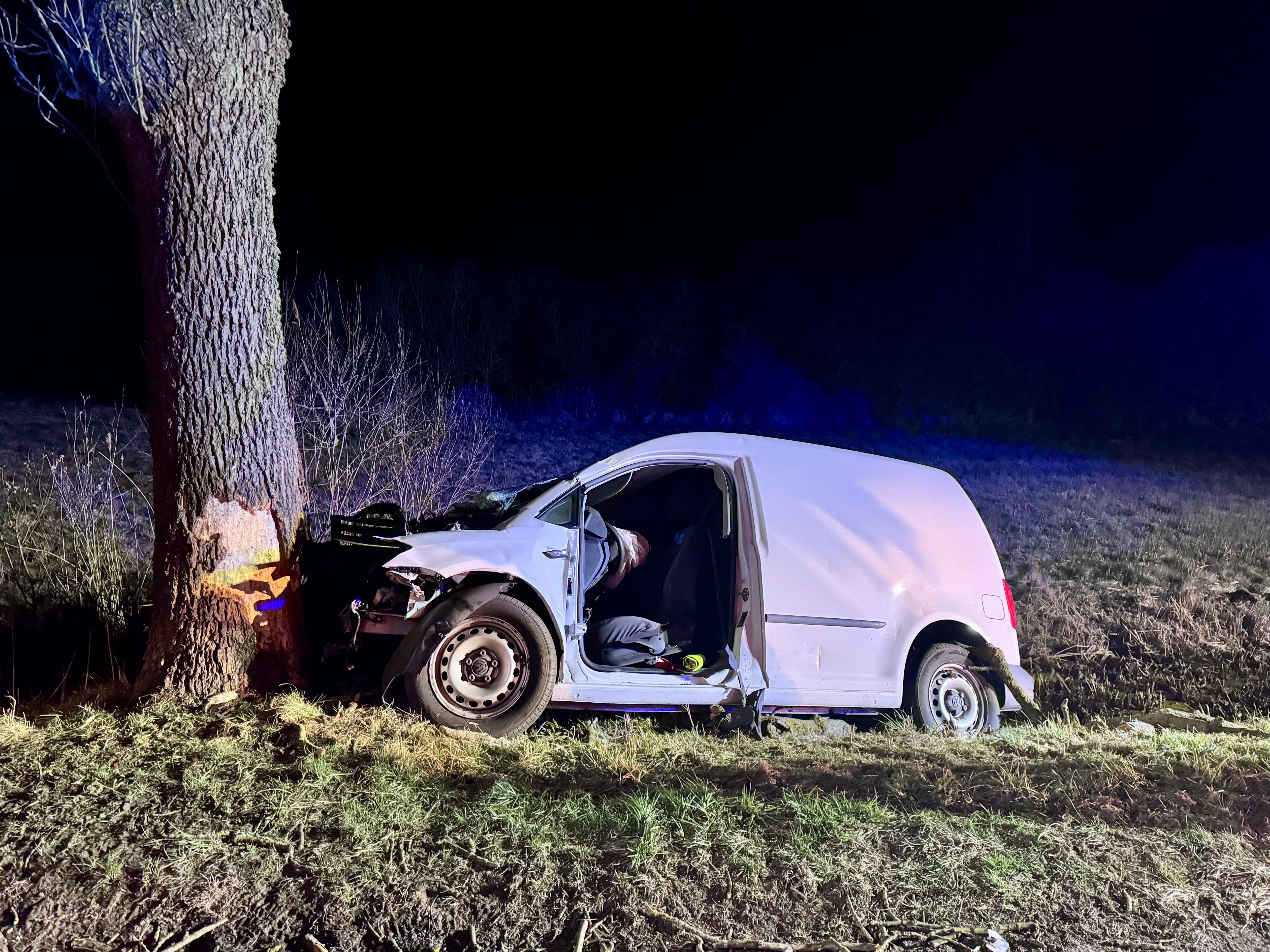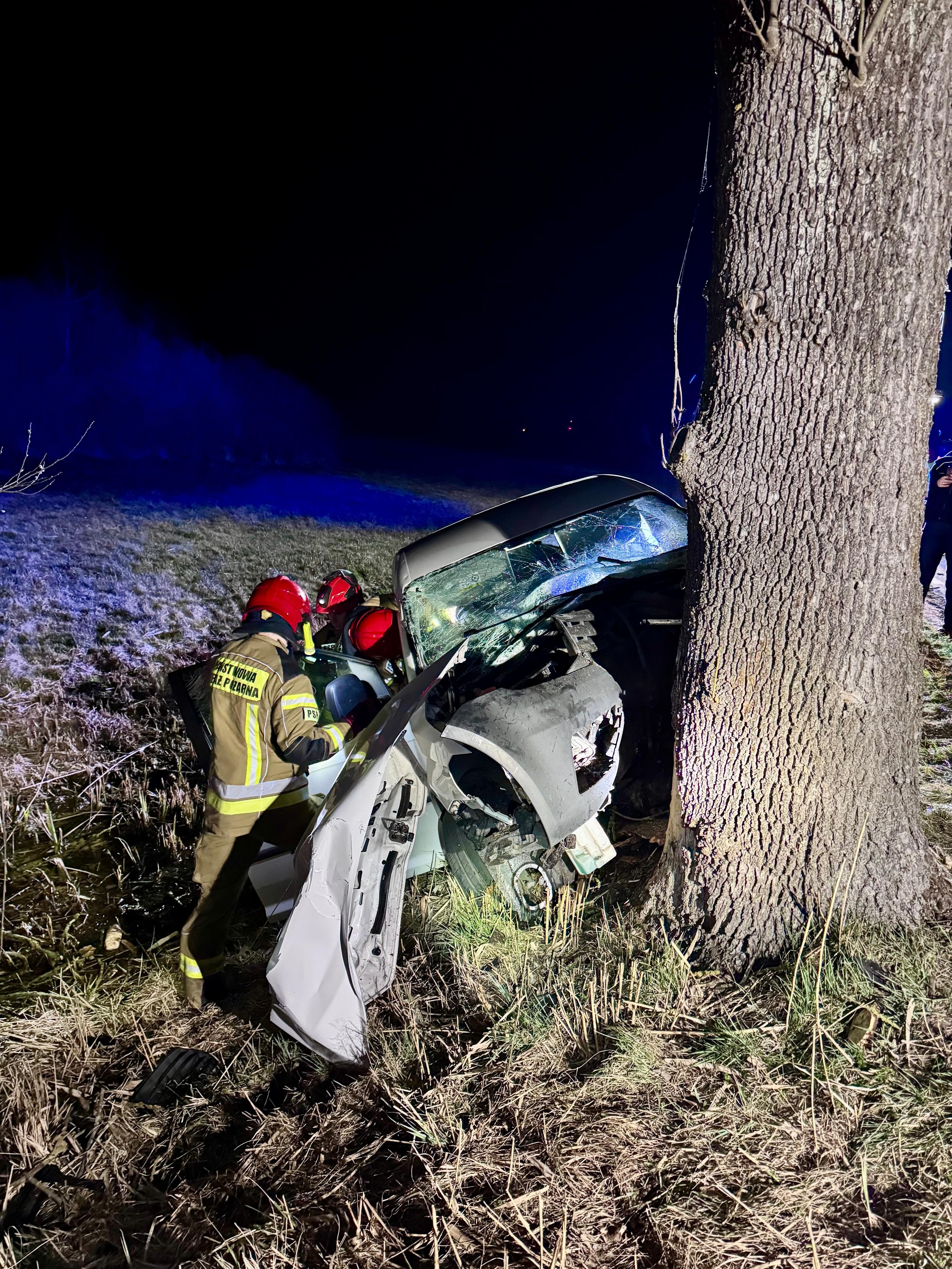 Po przybyciu na miejsce zdarzenia strażaków, zastano pojazd na poboczu drogi, który uderzył w drzewo. Wewnątrz pojazdu znajdował się nieprzytomny mężczyzna. Strażacy natychmiast przy użyciu narzędzi hydraulicznych dokonali dostępu do osoby poszkodowanej, ewakuując ją na zewnątrz, następnie przystępując do udzielania kwalifikowanej pierwszej pomocy (KPP). Osoba poszkodowana następnie przekazana została Zespołowi Ratownictwa Medycznego, który po wykonaniu niezbędnych medycznych czynności ratowniczych stwierdził zgon kierującego pojazdem.