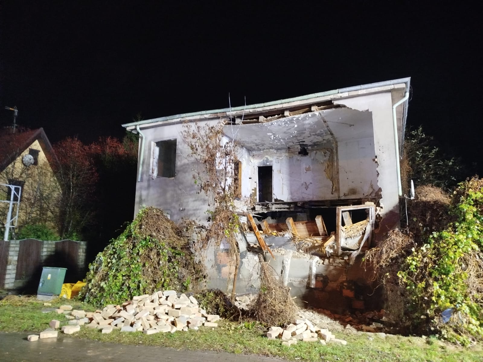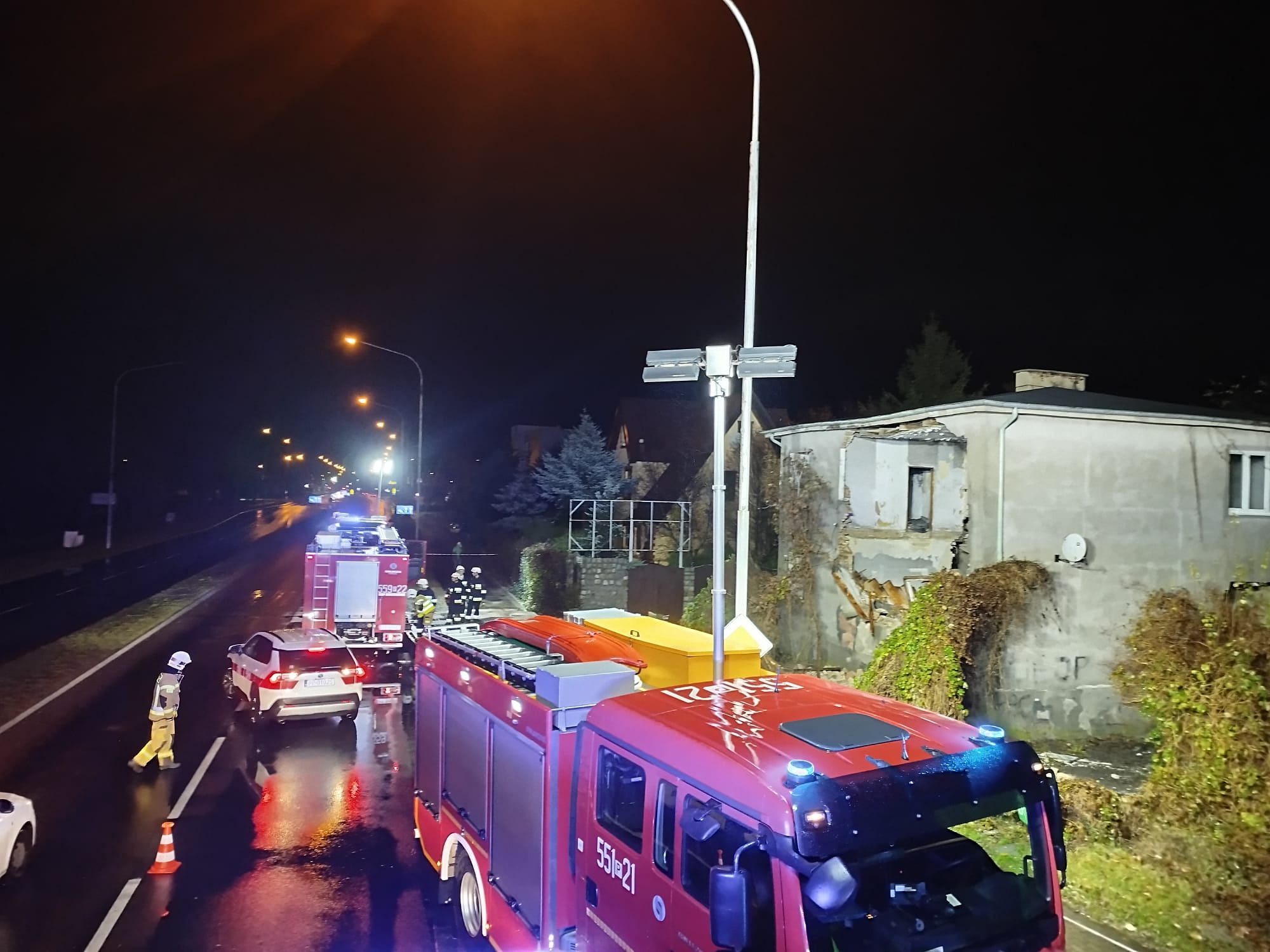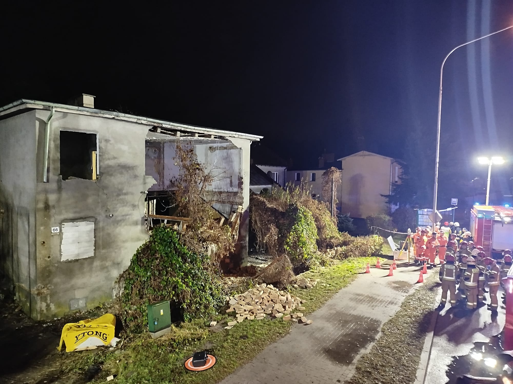Po przybyciu na miejsce zdarzenia pierwszych zastępów straży pożarnej, potwierdzono treść zgłoszenia. W toku dalszego rozpoznania stwierdzono częściowe zawalenie ściany frontowej budynku oraz drewnianego stropu (pustostanu) przeznaczonego do rozbiórki. Brak informacji o ewentualnych osobach poszkodowanych.