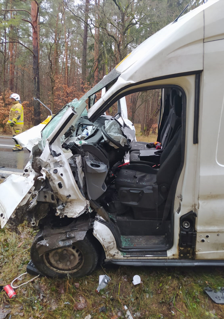 Samochód typu bus uderzył w tył naczepy samochodu ciężarowego. W wyniku zdarzenia, kierowca busa pozostawał w pojeździe, uwieziony zniszczonymi elementami pojazdu. Działania straży pożarnej polegały na zabezpieczeniu miejsca zdarzenia, stabilizacji rozbitego pojazdu oraz wykonaniu dostępu do poszkodowanego. Pomocy medycznej udzielał na bieżąco zespół karetki pogotowia.