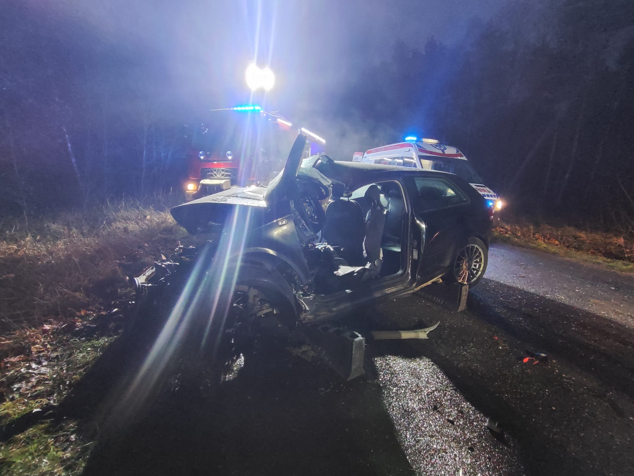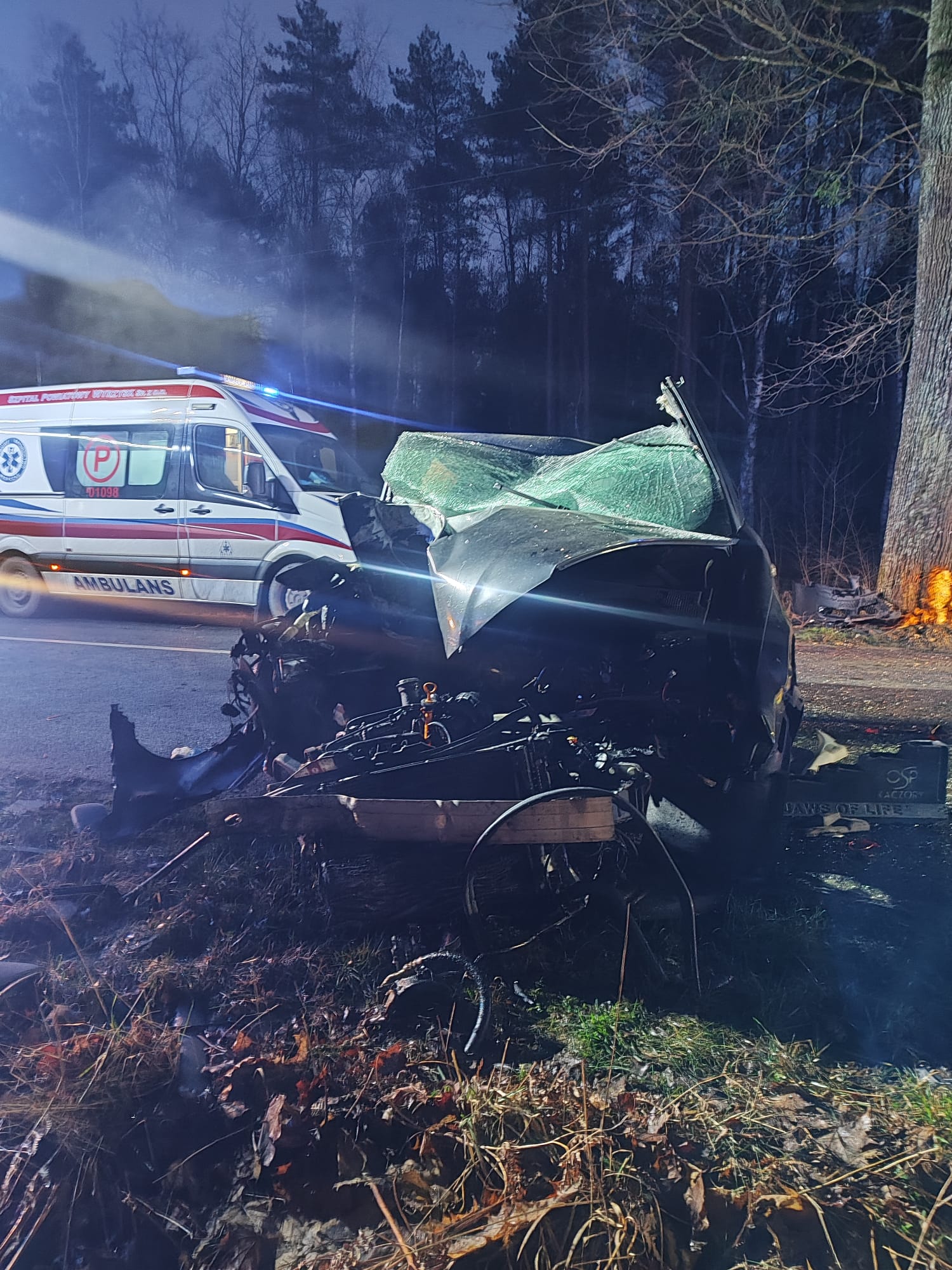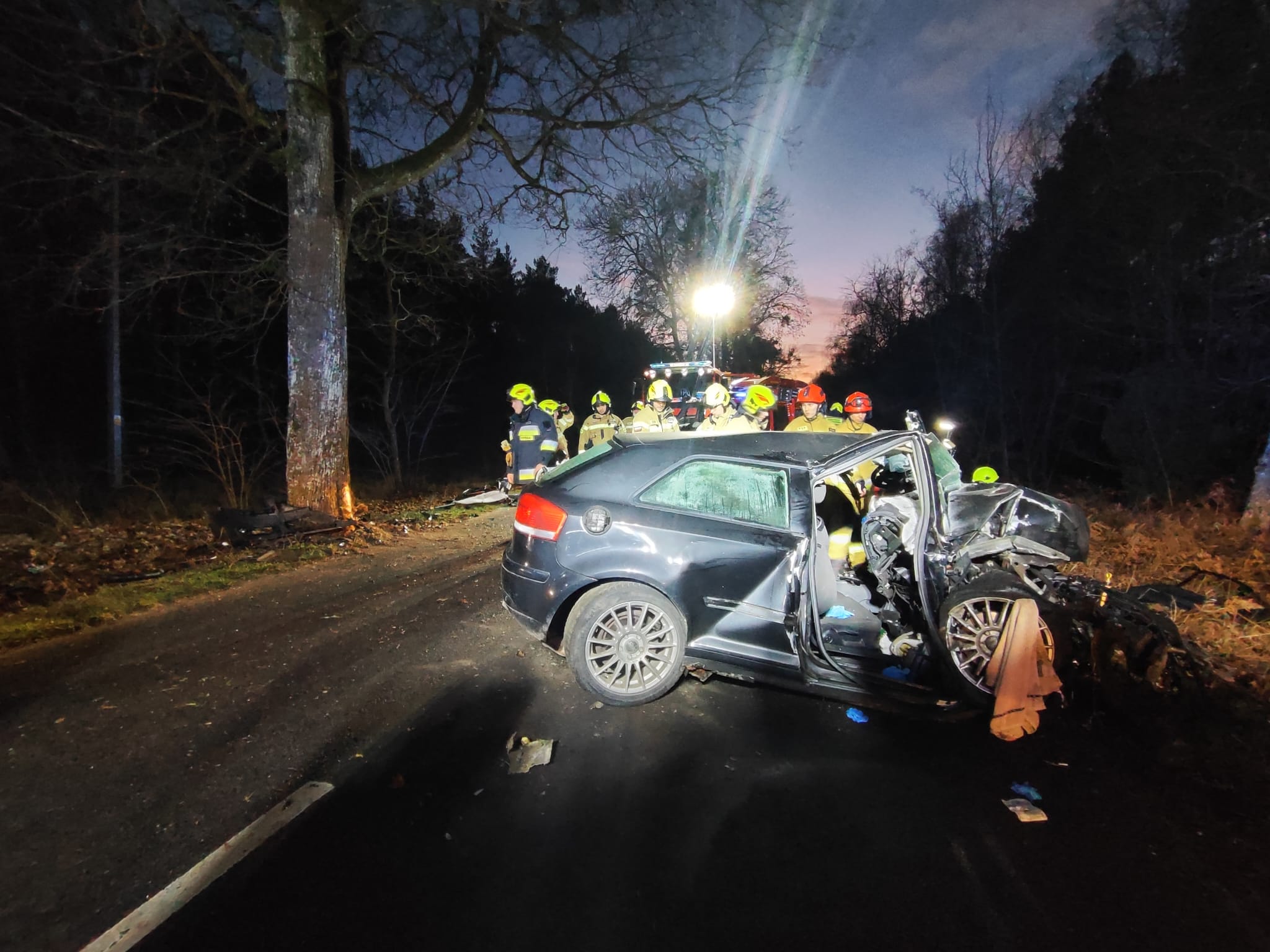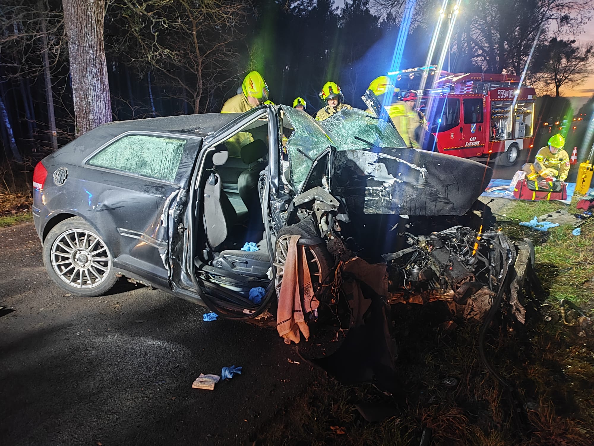 W dniu 29 grudnia 2025 roku o godzinie 15:54 do Stanowiska Kierowania Komendanta Powiatowego Państwowej Straży Pożarnej w Pile wpłynęło zgłoszenie dotyczące czołowego zderzenia samochodu osobowego z drzewem na trasie Śmiłowo-Kaczory.