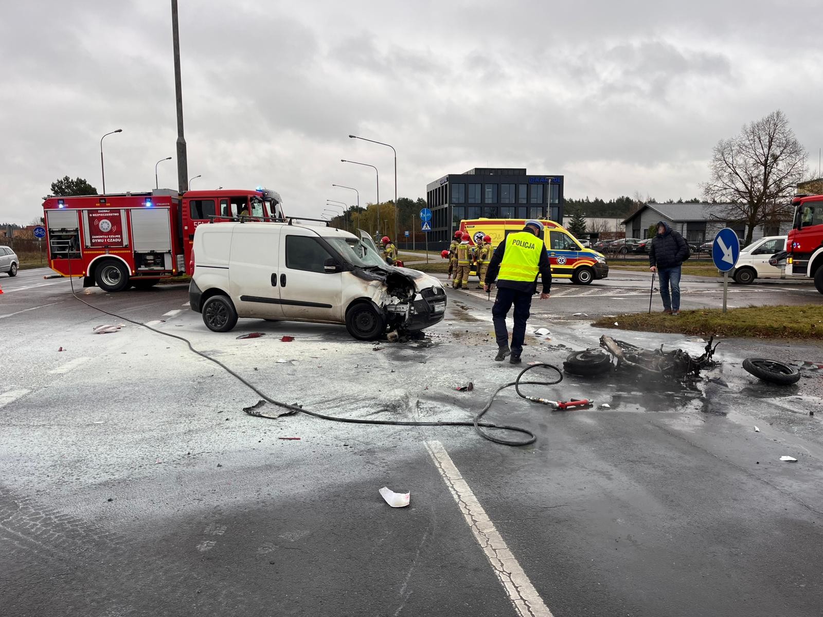 Po przybyciu na miejsce pierwszych zastępów straży pożarnej stwierdzono, że na skrzyżowaniu dróg doszło do zderzenia samochodu osobowego z motocyklem, który dodatkowo objęty był w całości pożarem.