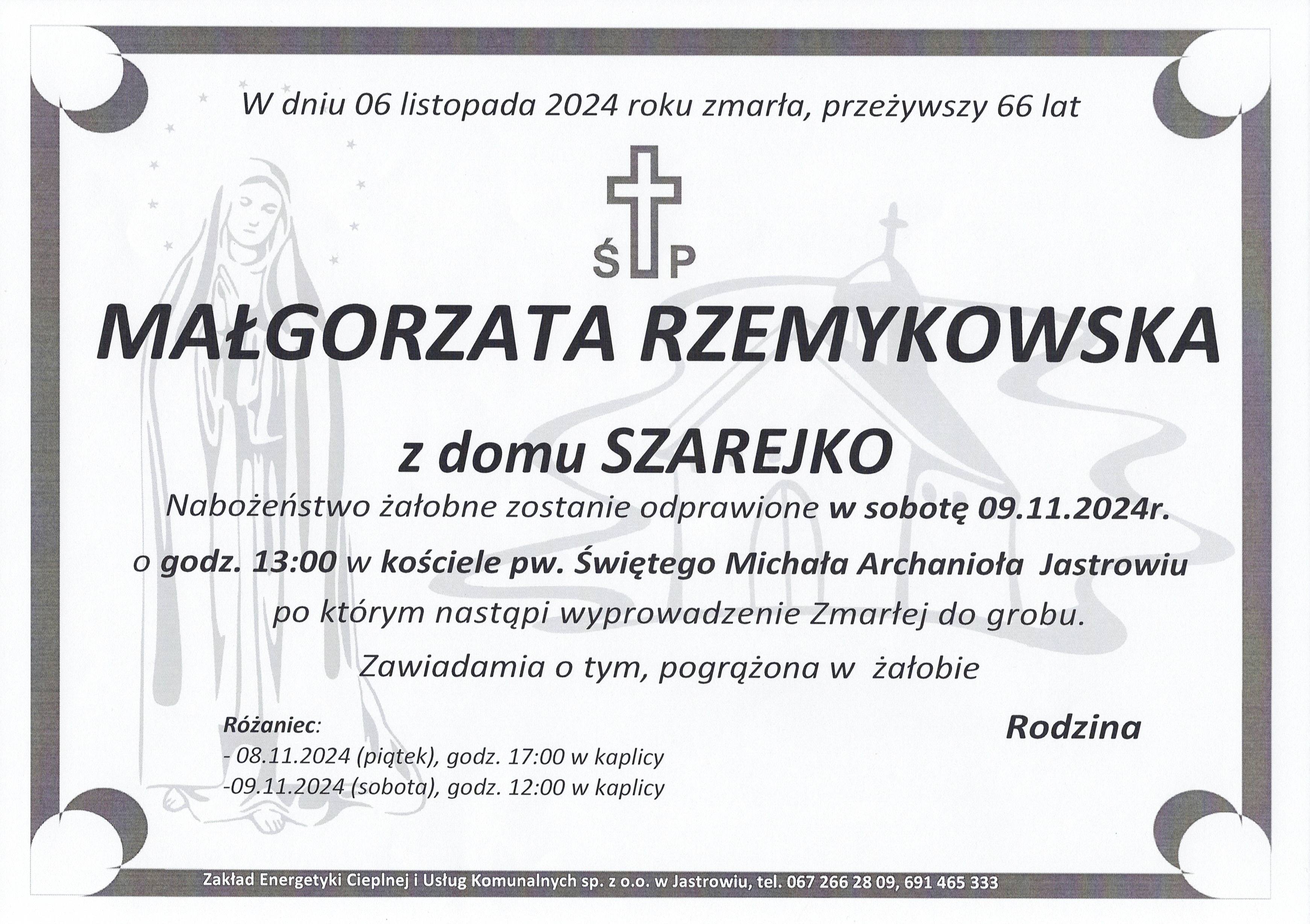 Komenda Powiatowa Państwowej Straży Pożarnej w Pile z głębokim żalem zawiadamia, że w dniu 06 listopada 2024 roku w wieku 66 lat odeszła na wieczną służbę st. ogn. w st. spocz. Małgorzata Rzemykowska - wieloletni funkcjonariusz Komendy Powiatowej PSP w Pile.