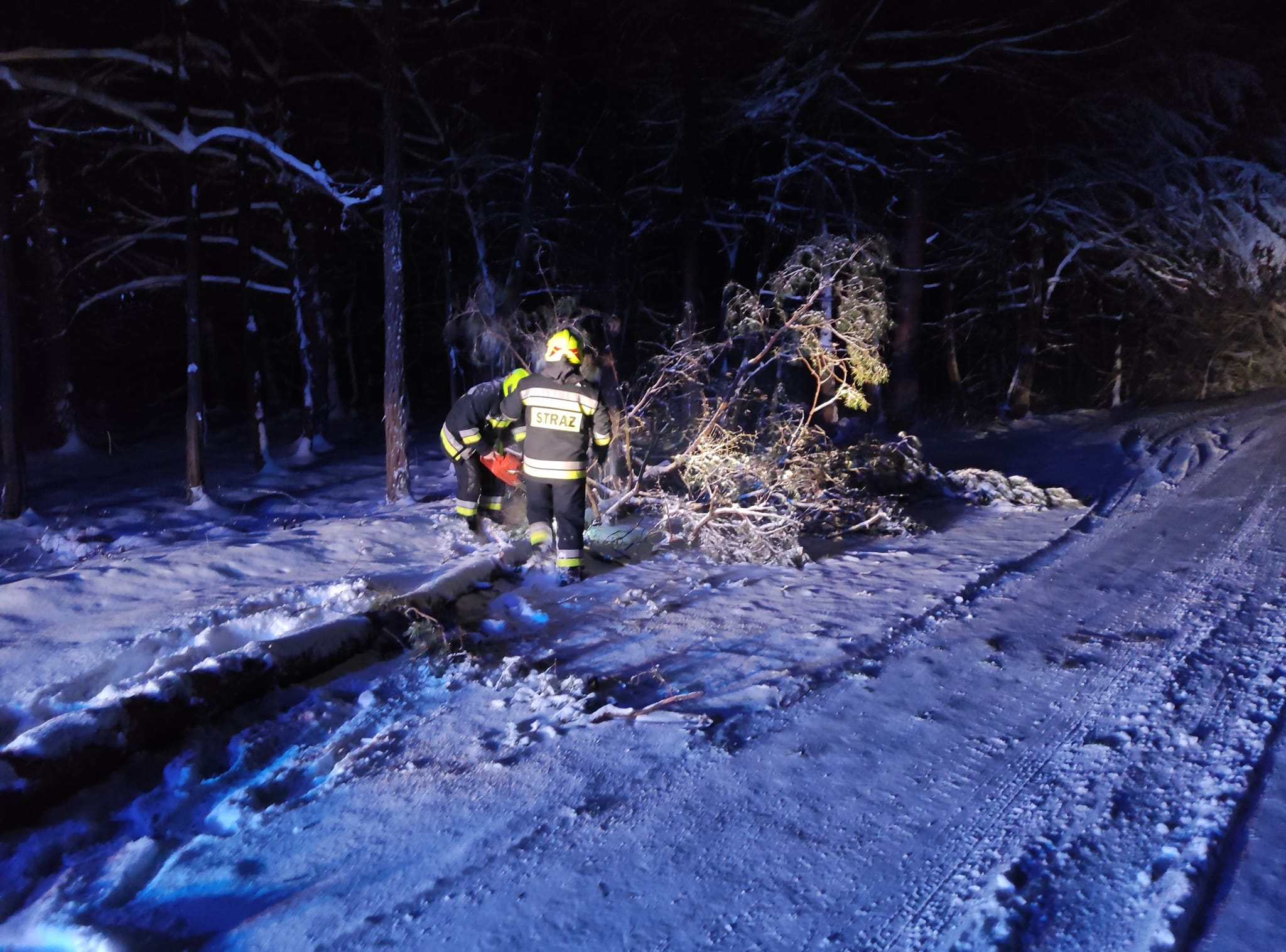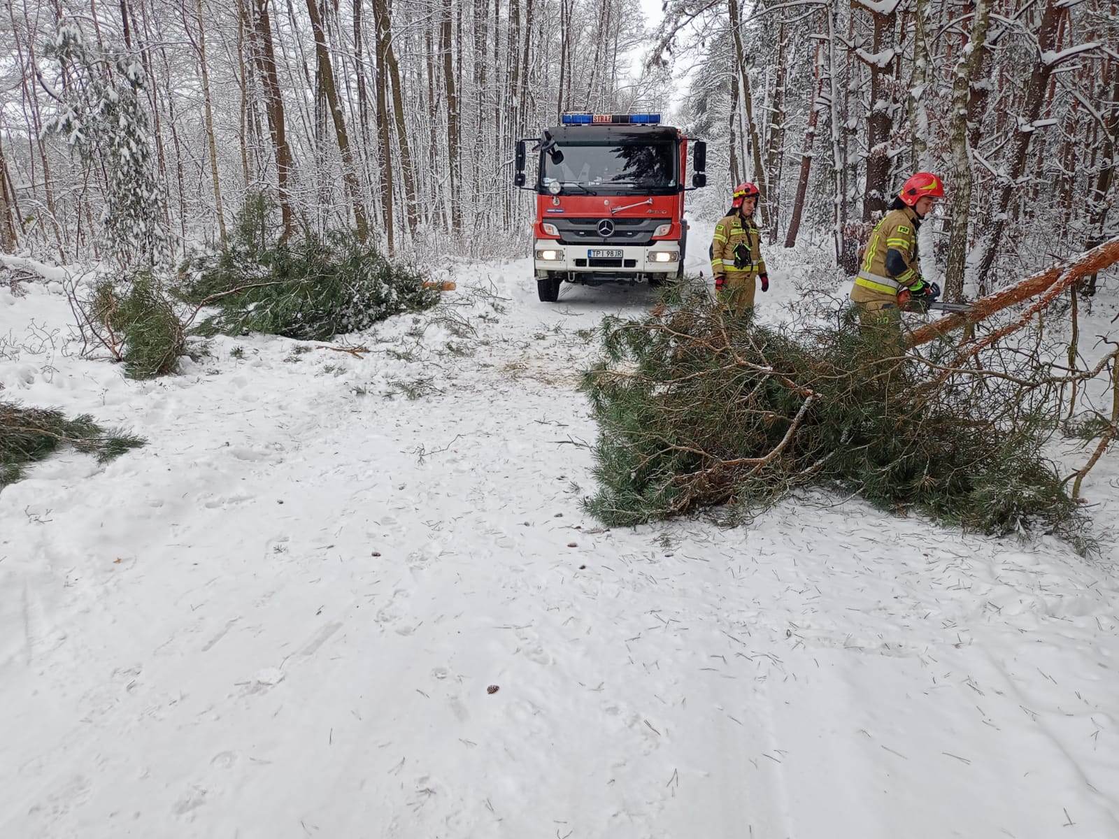 Wspominane miejscowe zagrożenia to powalone drzewa oraz nadłamane ich konary, które nie wytrzymały ciężaru mokrego śniegu.