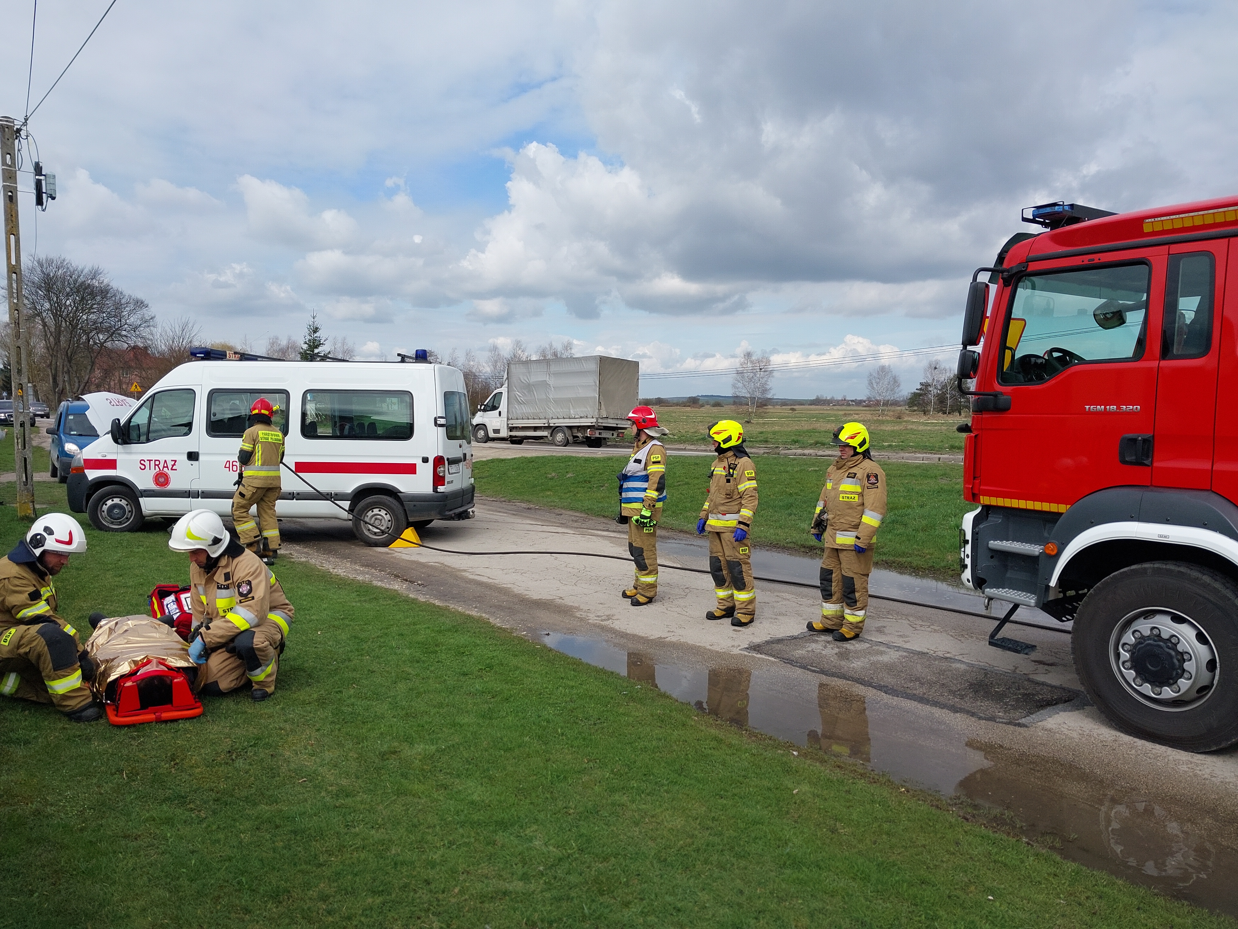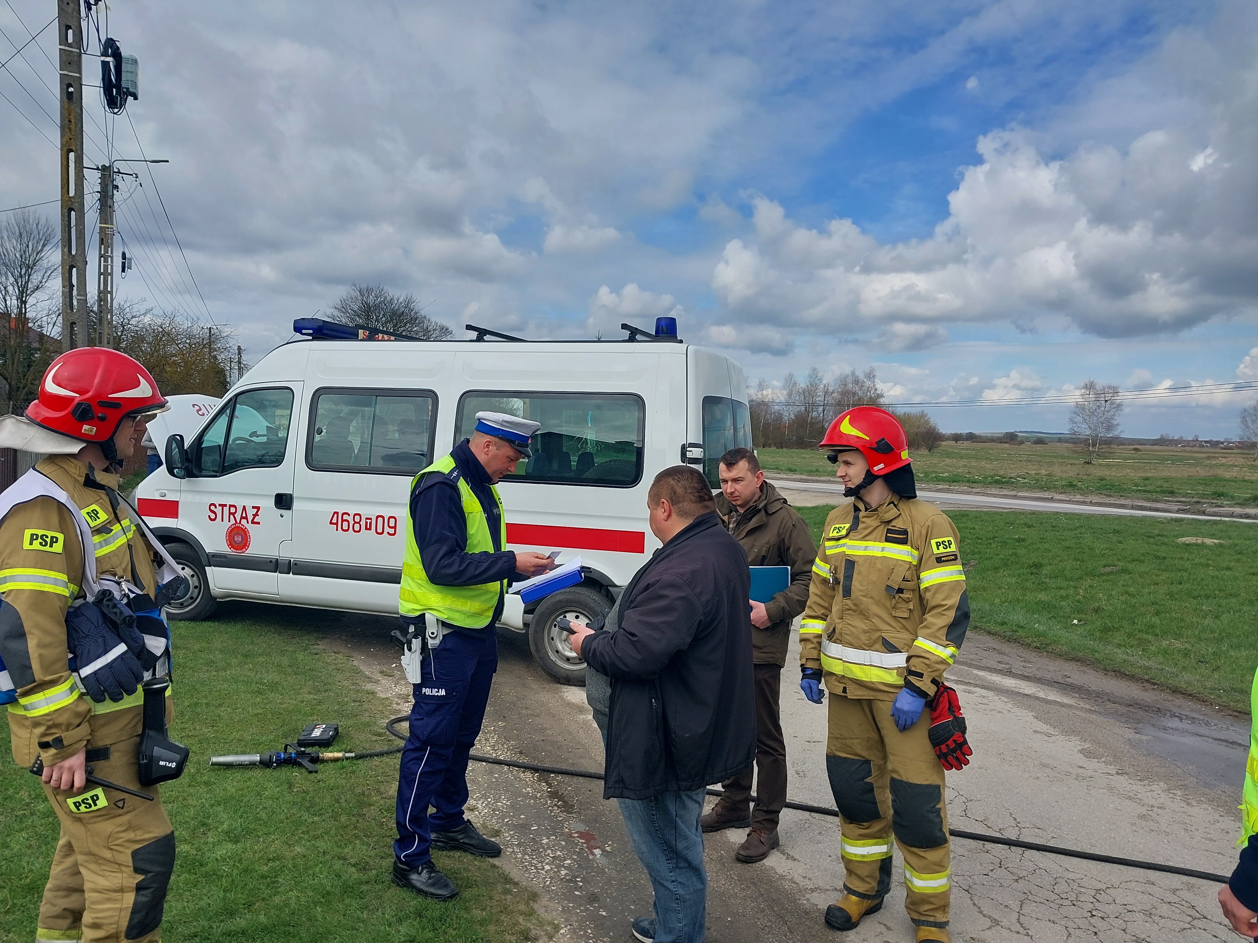 Po przybyciu na miejsce zdarzenia Kierujący Działaniem Ratowniczym ustalił, że samochód typu bus, którym podróżował tylko kierowca wypadł z drogi i uderzył w słup telefoniczny. Ranny kierowca przebywał w pojeździe. Działania strażaków polegały na zabezpieczeniu miejsca zdarzenia, udzieleniu pomocy medycznej poszkodowanemu oraz ograniczeniu skutków zdarzenia poprzez zebranie rozbitych elementów i rozlanych płynów eksploatacyjnych z pojazdu.