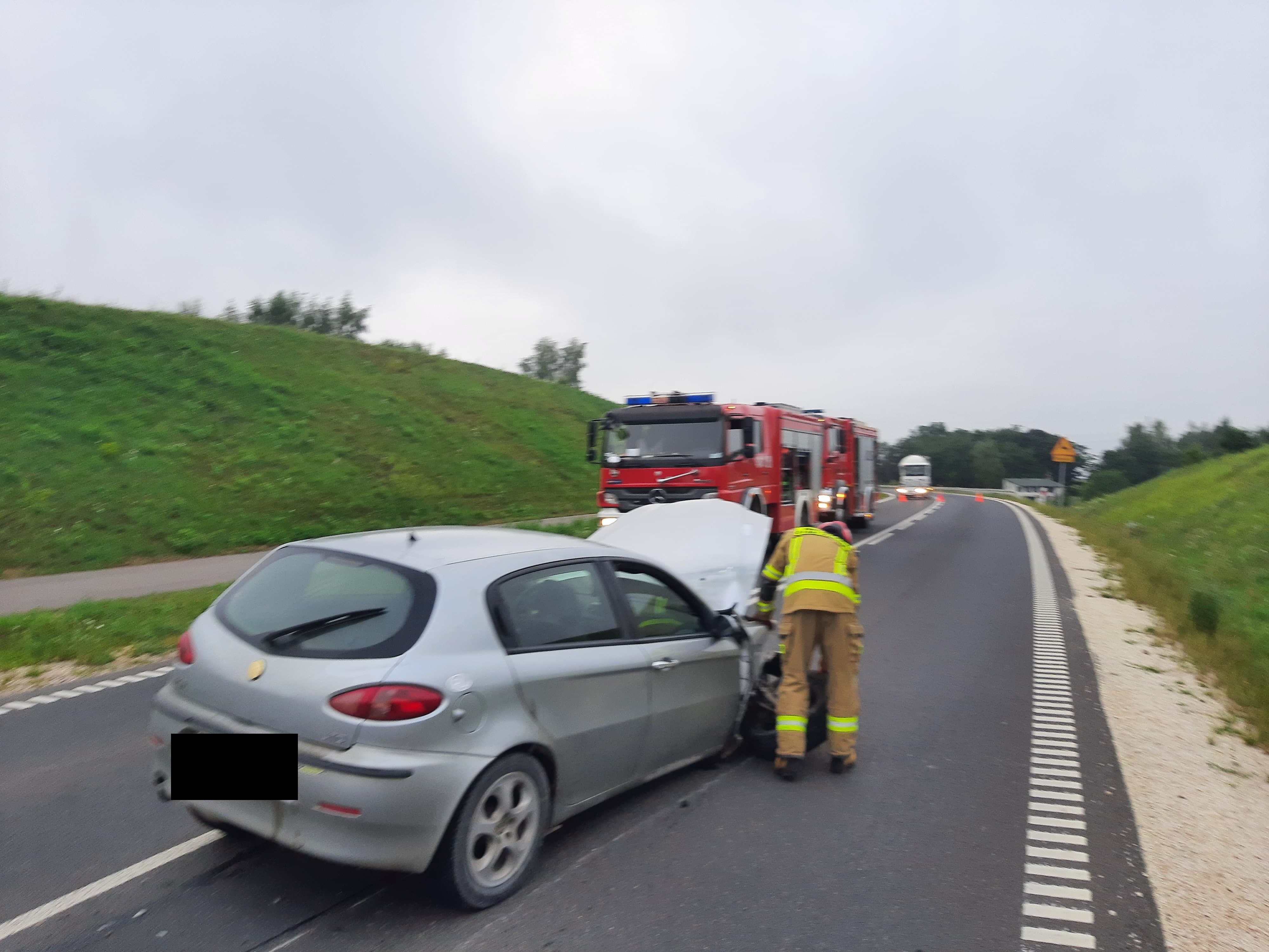 doszło do zdarzenia drogowego z udziałem pojazdów Alfa Romeo 147 i Volkswagen Passat. Pojazdami podróżowały łącznie dwie osoby, które opuściły je samodzielnie. Strażacy PSP po zabezpieczeniu miejsca zdarzenia udzielili kwalifikowanej pierwszej pomocy ww. osobom, po czym zostały przekazane Zespołowi Ratownictwa Medycznego. Ww. poszkodowani na mocy decyzji lekarza Państwowego Ratownictwa Medycznego zostali zabrani do szpitala. Dalsze czynności zastępów PSP polegały na odłączeniu zasilania elektrycznego w pojazdach oraz sorbcji rozlanych płynów eksploatacyjnych.