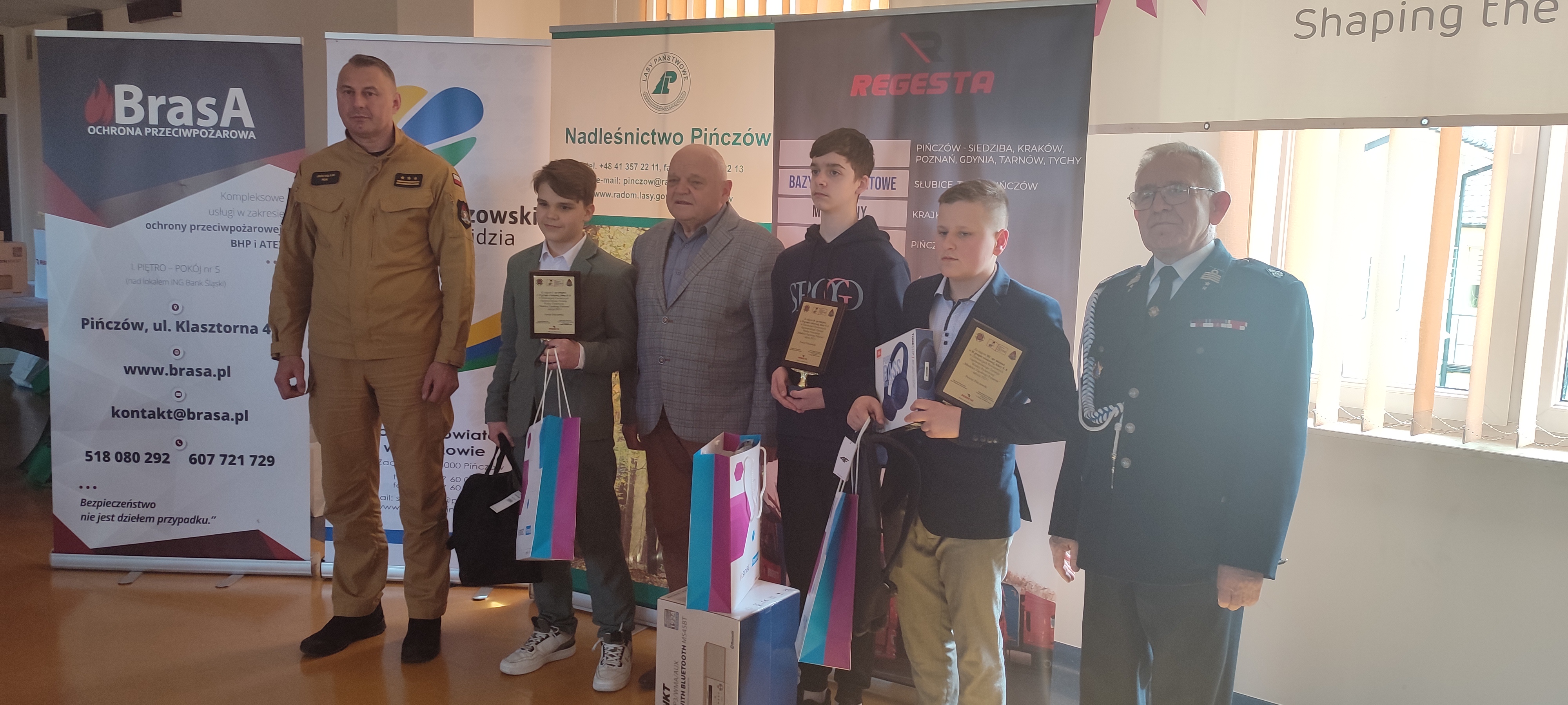Dla uczestników turnieju przygotowano statuetki oraz nagrody rzeczowe i tu szczególne podziękowania w imieniu uczestników dla fundatorów nagród. Głównymi organizatorami konkursu na szczeblu powiatowym był Komendant Powiatowy Państwowej Straży Pożarnej w Pińczowie st. bryg. Jarosław Huk oraz Starosta Pińczowski Zbigniew Kierkowski. Jednak nie udałoby się zapewnić takich nagród bez współorganizatorów turnieju, w tym firm takich jak: Regesta S.A., Dolina Nidy, Siniat, Eko- Inż.,