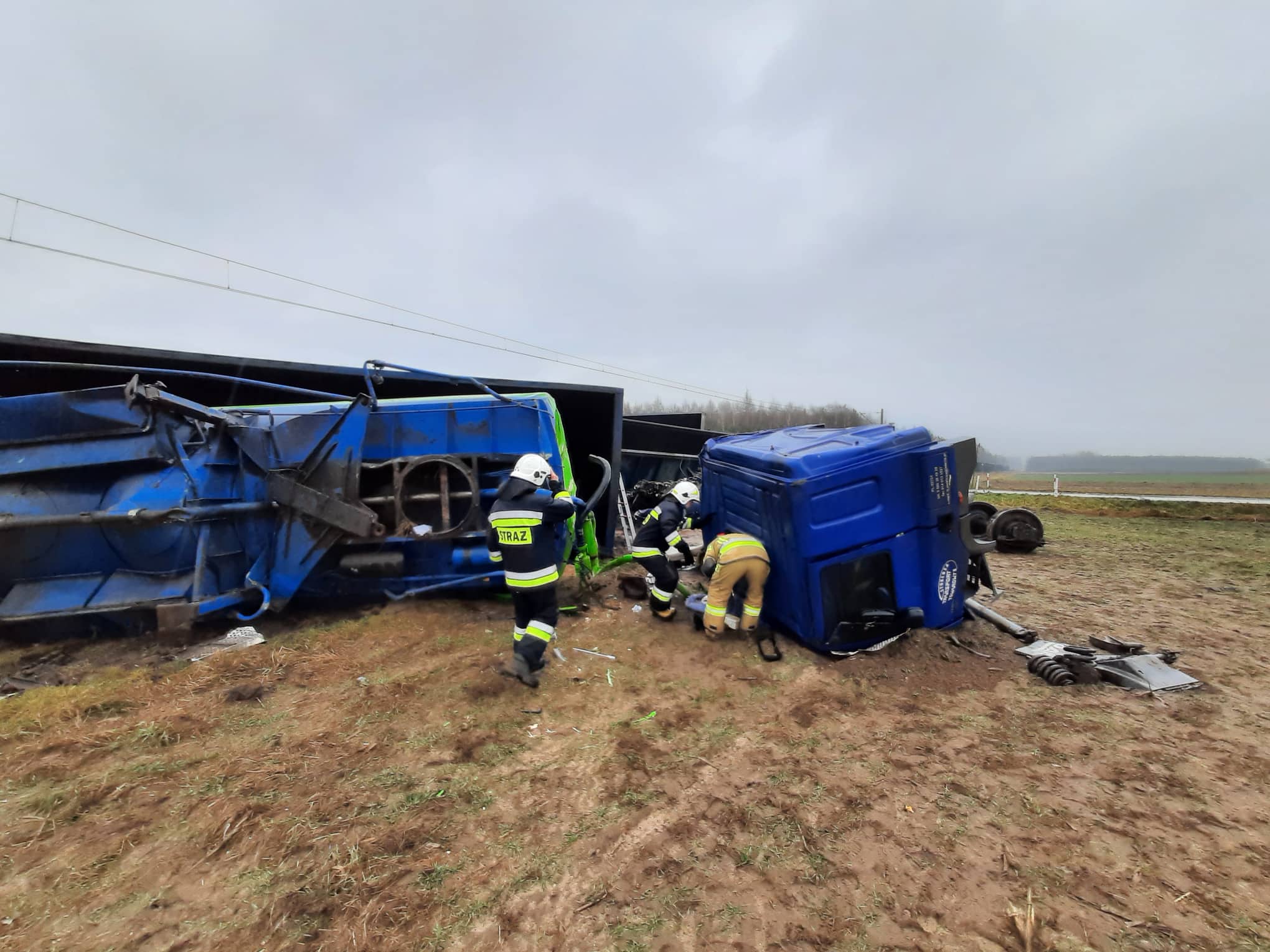 Strażacy skupili się na ustaleniu położenia kierowcy samochodu ciężarowego, którego nie odnaleziono podczas rozpoznania w zniszczonej kabinie ciągnika siodłowego. Kierowca został zlokalizowany pod podwoziem ciężarówki, jednakże z uwagi na elementy samochodu i składu kolejowego niemożliwy był dostęp ekip medycznych do poszkodowanego. Strażacy za pomocą specjalistycznego sprzętu zapewnili medykom dostęp do mężczyzny, jednak lekarz przybyłego na miejsce Lotniczego Pogotowania Ratowniczego stwierdził zgon kierowcy ciężarówki.