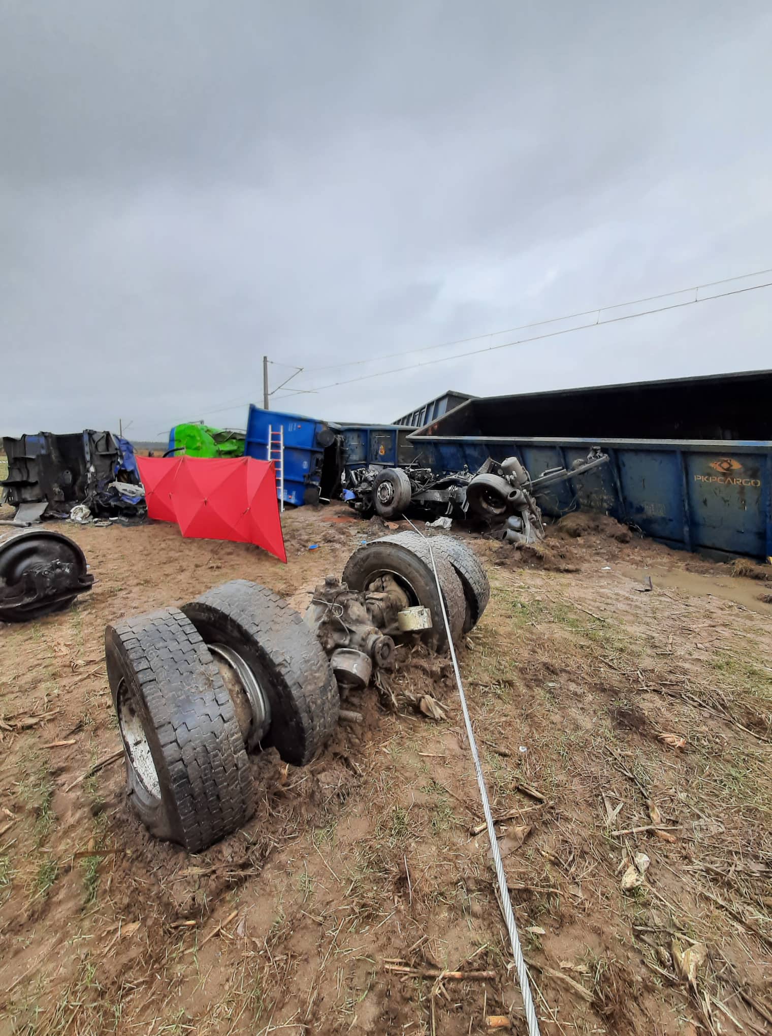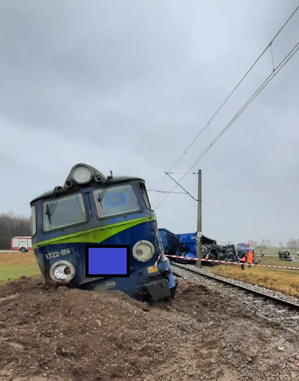 Strażacy po przyjeździe na miejsce stwierdzili, iż lokomotywa oraz najbliższe jej siedem wagonów towarowych zostały wykolejone, a uczestniczący w zderzeniu ciągnik siodłowy z naczepą w wyniku zderzenia został rozerwany, a poszczególne jego elementy znajdują się poza torowiskiem.