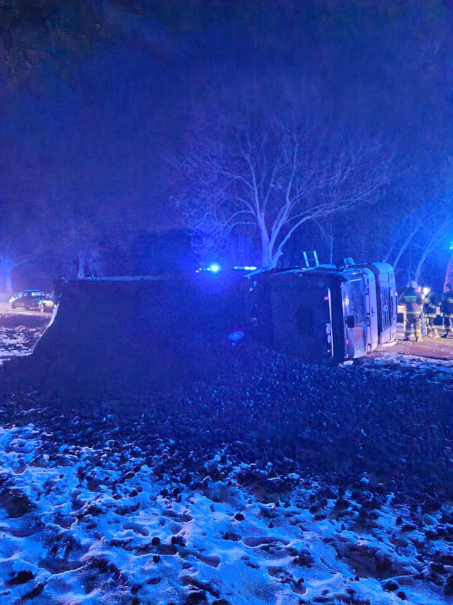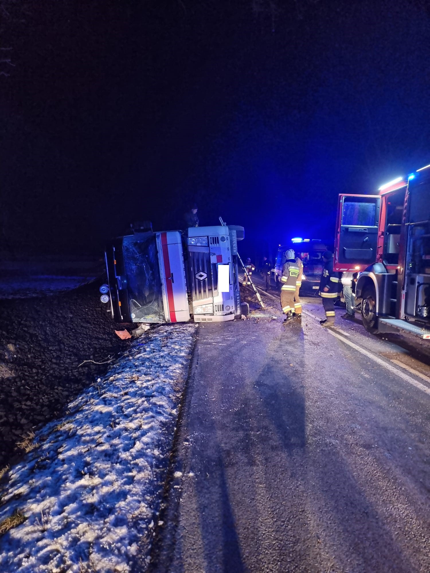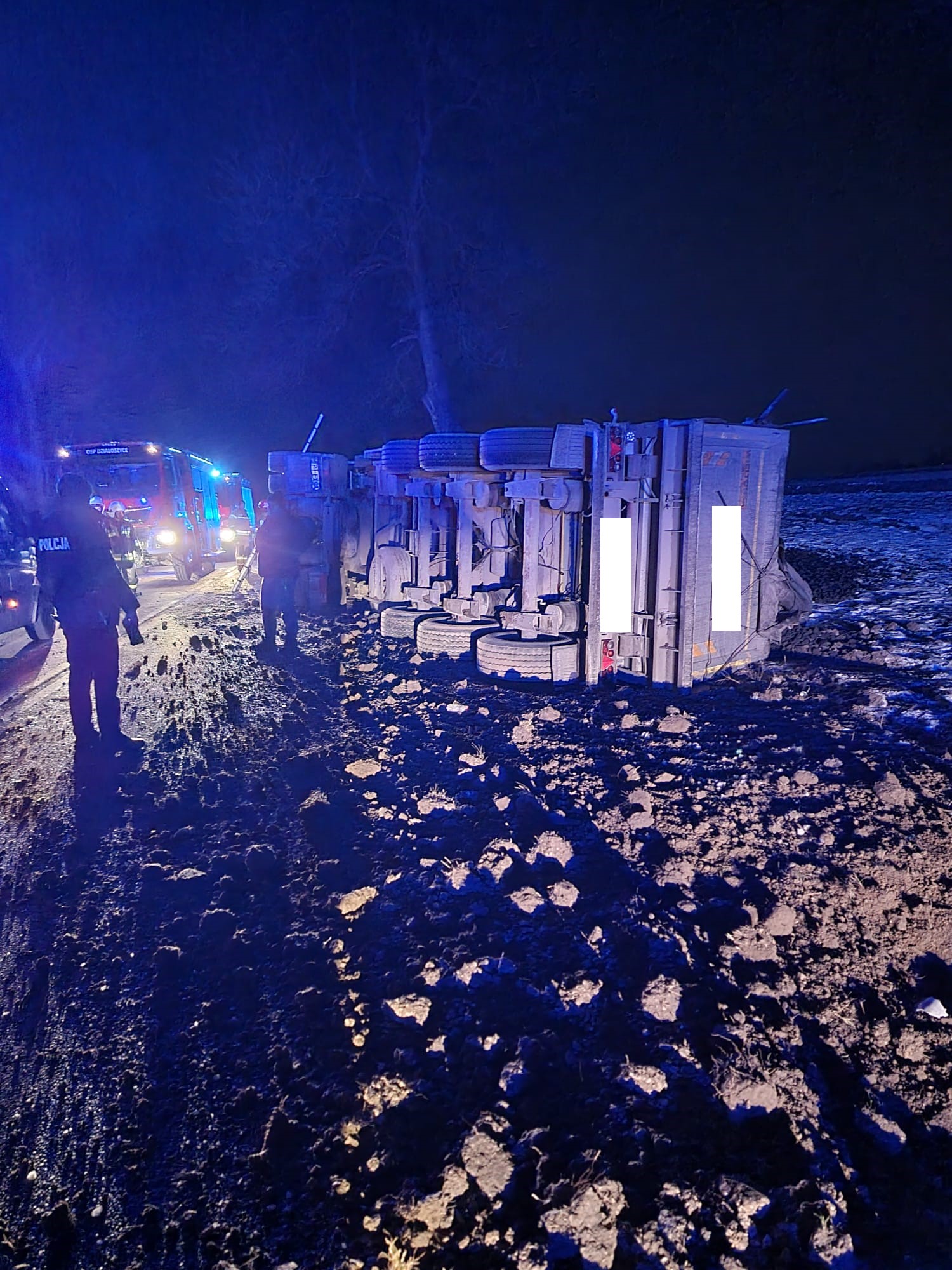 ciągnik siodłowy z naczepą przewrócił się na bok zajmując częściowo jeden pas drogi wojewódzkiej nr 768. W zdarzeniu poszkodowany został kierowca ww. pojazdu, który na mocy decyzji lekarza PRM został zabrany do szpitala.