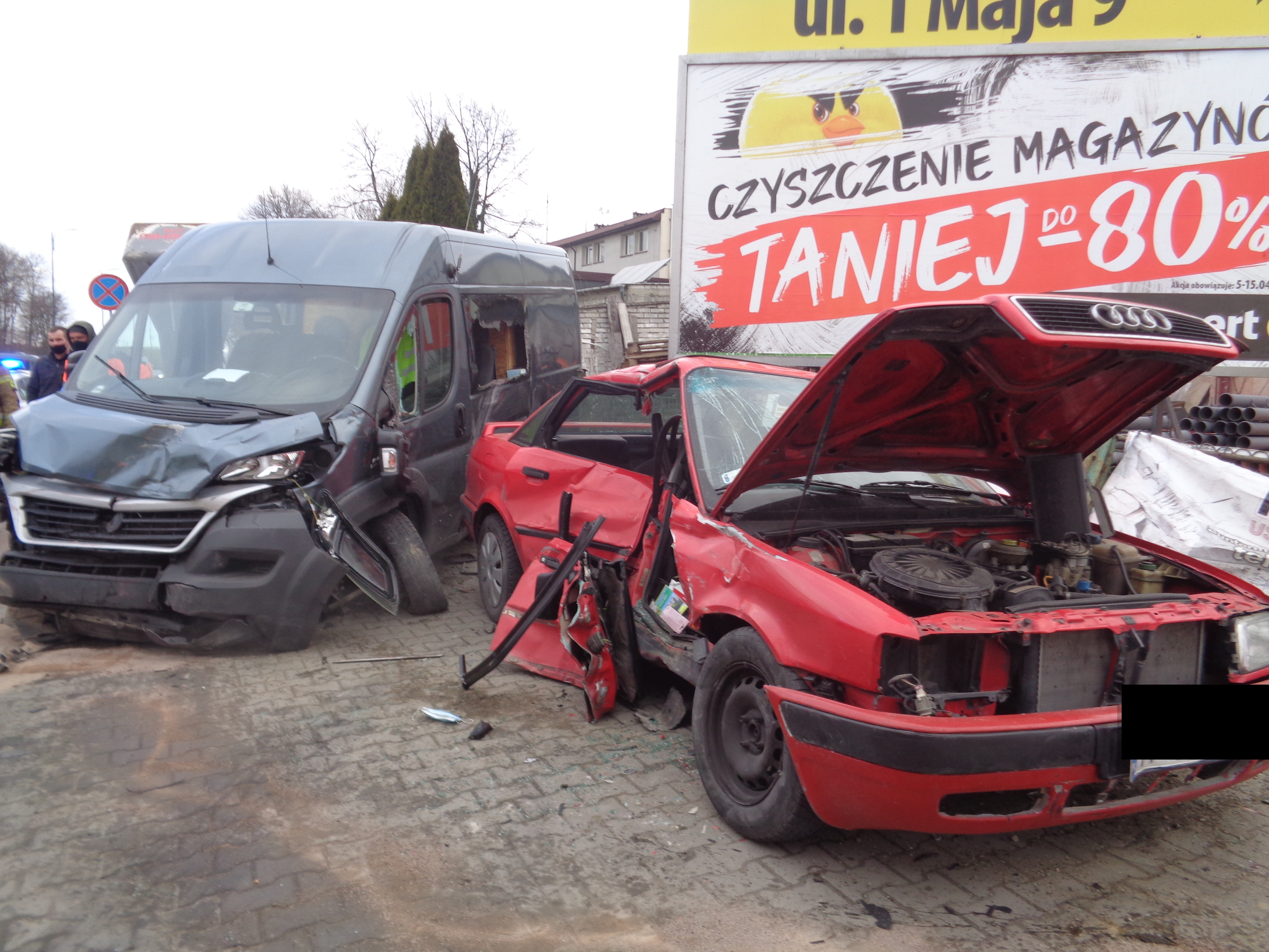Po przybyciu na miejsce zdarzenia Kierujący Działaniem Ratowniczym ustalił, iż doszło do zdarzenia drogowego z udziałem dwóch pojazdów: Audi 80 oraz Fiata Ducato z przyczepką. Pojazdami podróżowało łącznie pięć osób. Kierowca Audi był zakleszczony w pojeździe, natomiast podróżujący pojazdem Fiat opuścili go samodzielnie przed przybyciem zastępów PSP. Strażacy przy użyciu sprzętu hydraulicznego wykonali dostęp do kierowcy ww. pojazdu, po czym został on przekazany Zespołowi Ratownictwa Medycznego. Na mocy decyzji PRM poszkodowany został zabrany do szpitala w Pińczowie.