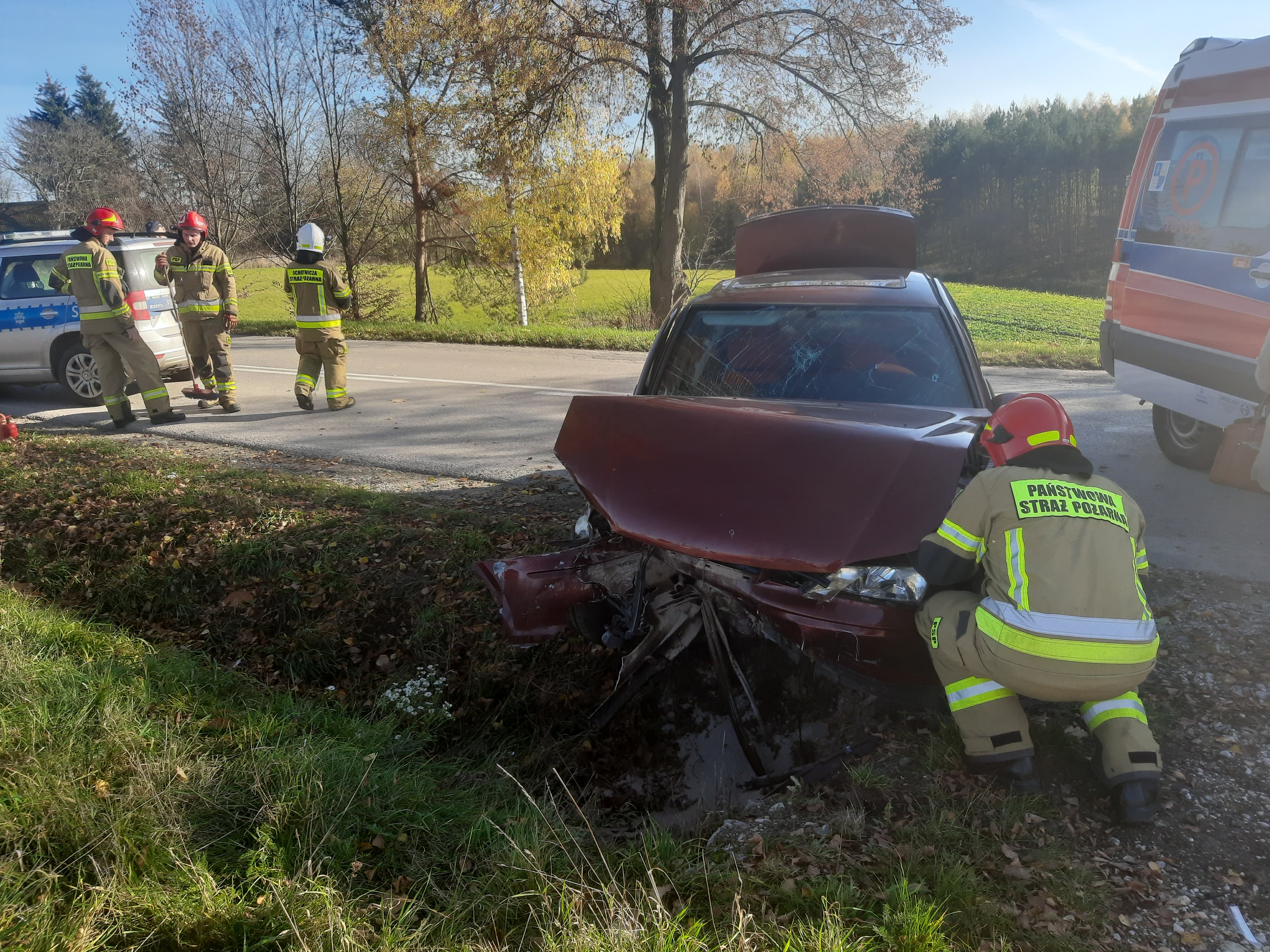 Po przybyciu na miejsce zdarzenia Kierujący Działaniem Ratowniczym ustalił, iż pojazd marki Opel Vectra uderzył w przydrożną skarpę. Strażacy JOP po zabezpieczeniu miejsca zdarzenia udzielili kierowcy auta kwalifikowanej pierwszej pomocy, po czym został on przekazany ZRM. Następnie na mocy decyzji Zespołu Ratownictwa Medycznego poszkodowanego zabrano do szpitala. Równocześnie strażacy odłączyli zasilanie elektryczne w pojeździe, ograniczyli wyciek płynów eksploatacyjnych z samochodu oraz we współpracy z Policją uczestniczyli