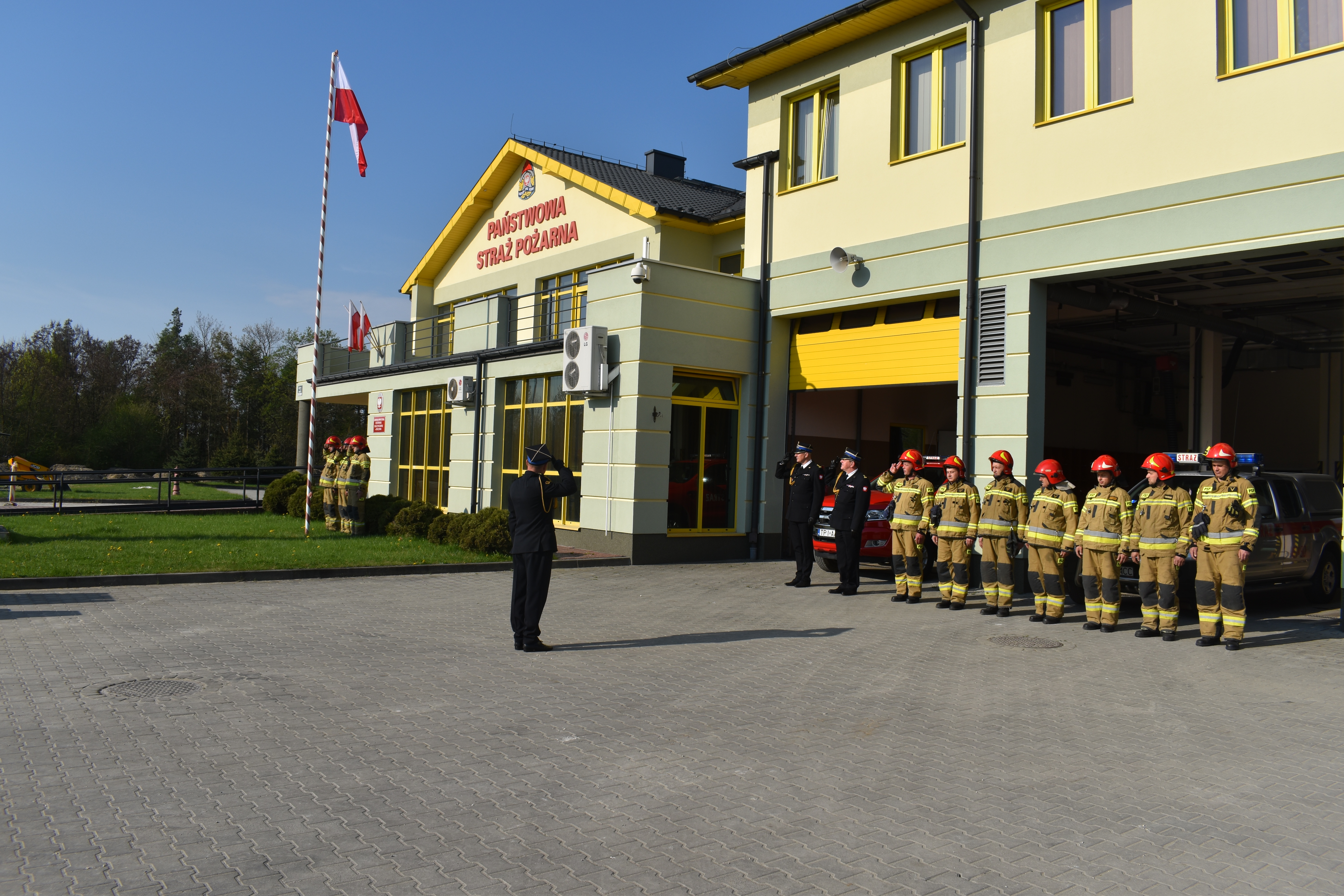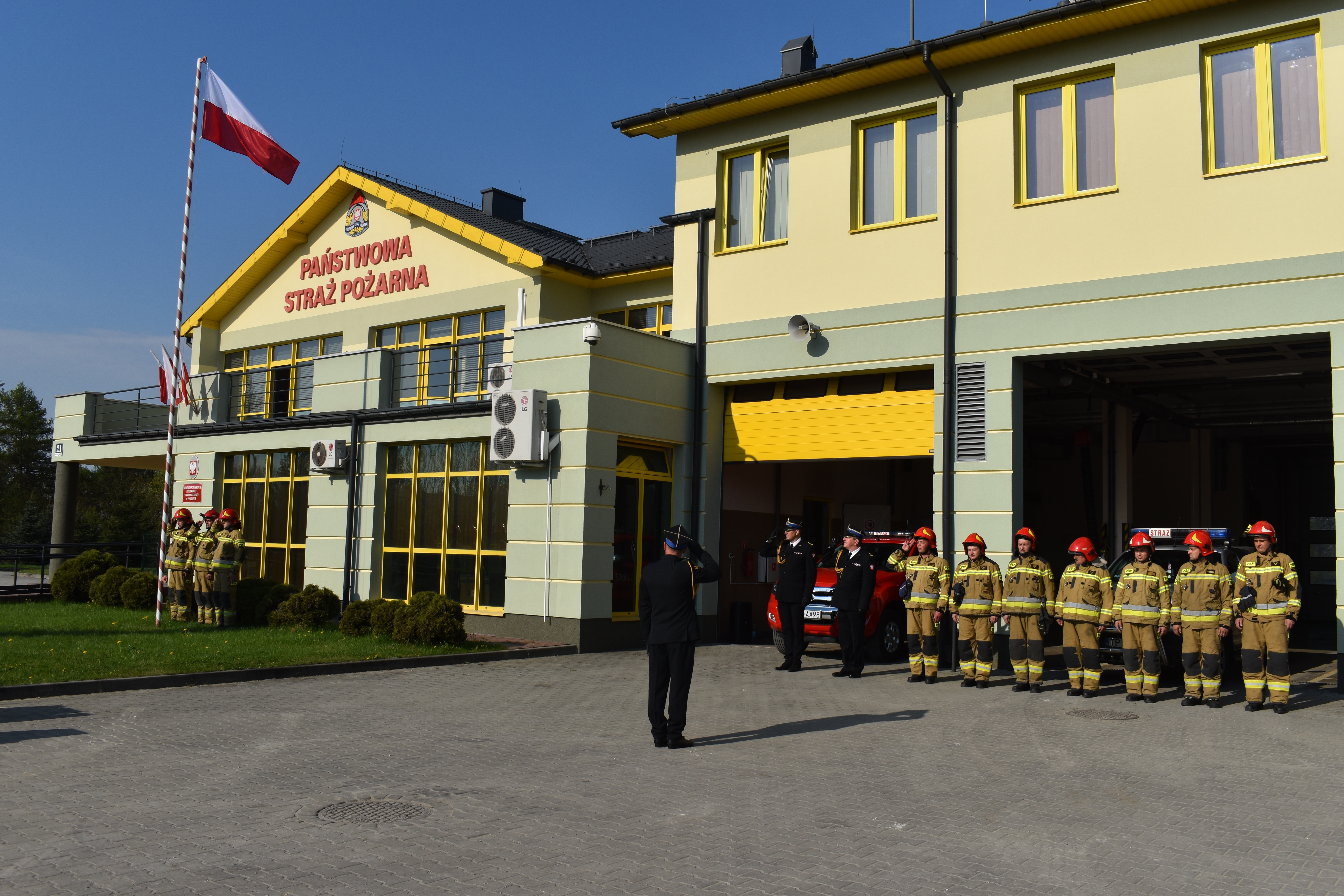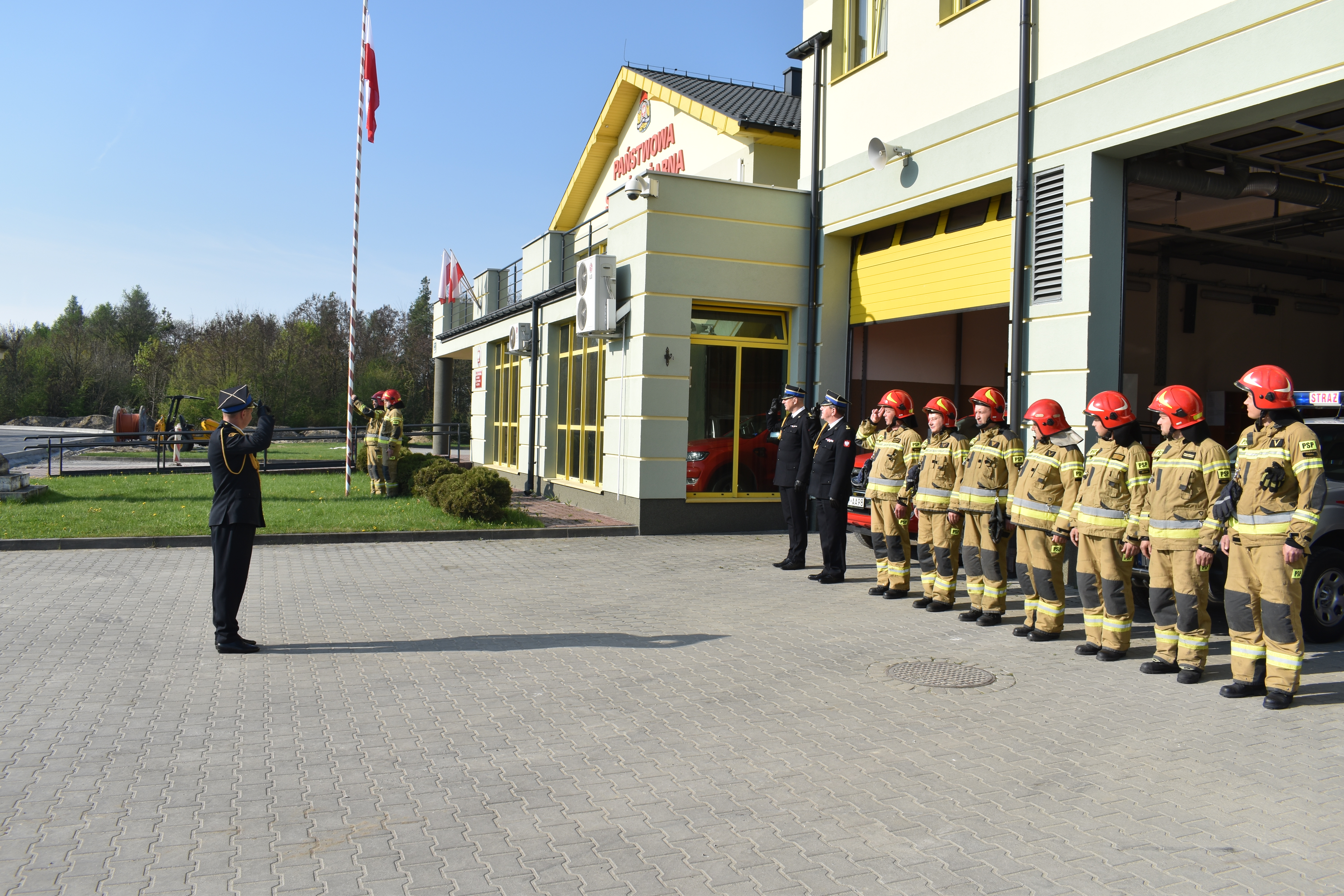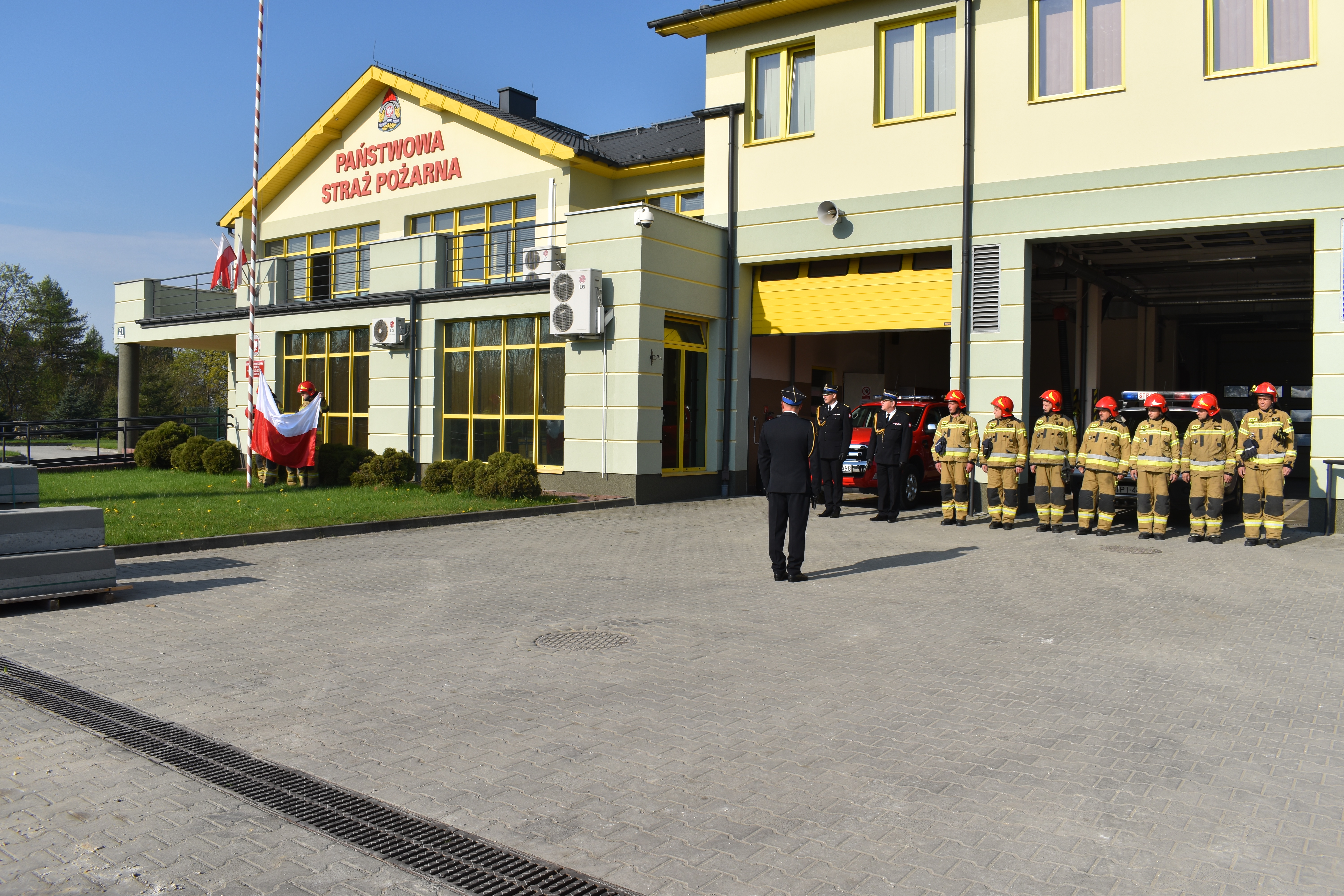 Następnie poczet flagowy podniósł flagę państwową na maszt. Komendant Powiatowy w swoim okolicznościowym wystąpieniu przybliżył historię polskich barw narodowych i podkreślił wagę propagowania wiedzy o polskiej tożsamości i symbolach narodowych. W apelu uczestniczyli: zmiany służbowe Jednostki Ratowniczo Gaśniczej w Pińczowie.