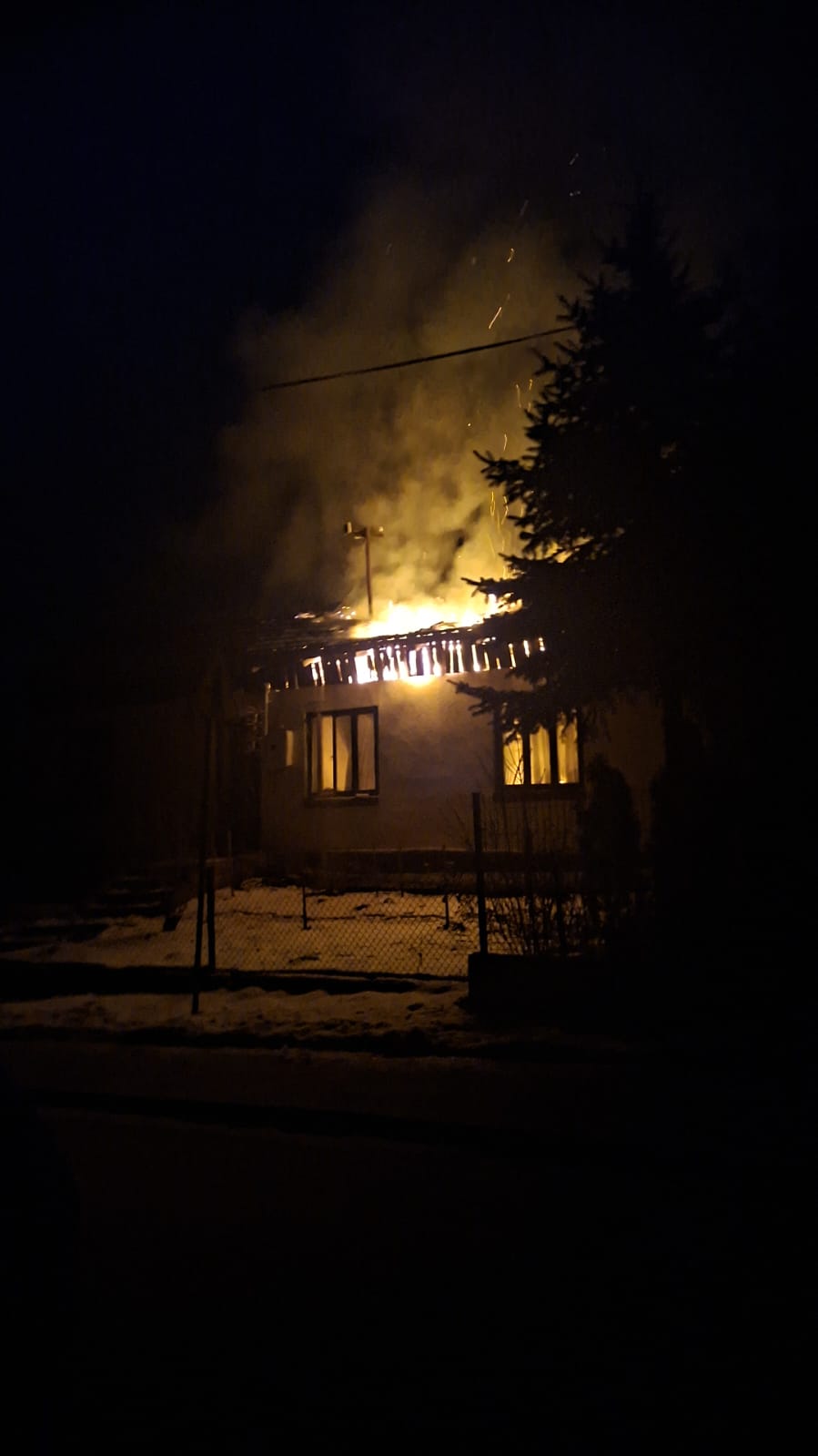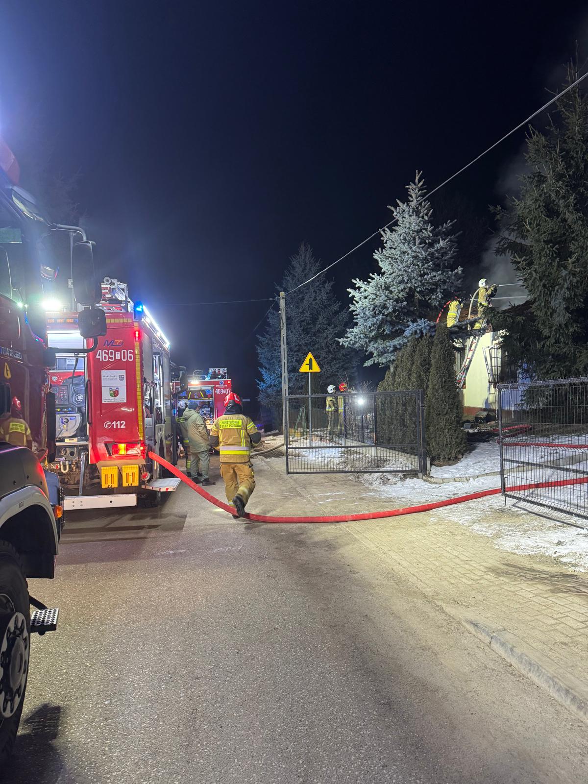20 stycznia 2026 r. około godz. 23.48 do stanowiska kierowania komendanta powiatowego PSP w Pińczowie wpłynęło zgłoszenie o pożarze budynku mieszkalnego w miejscowości Złota. Do zdarzenia zadysponowano 2 zastępy z pińczowskiej Jednostki Ratowniczo-Gaśniczej PSP, oraz zastępy gaśnicze z Jednostek Ochotniczych Straży Pożarnych z miejscowości Złota, Chroberz i Pełczyska. Po przybyciu na miejsce zdarzenia kierujący działaniem ratowniczym ustalił, iż pożarem objęty jest dach, poddasze i wnętrze budynku mieszkalnego jednorodzinnego. Strażacy ustalili, że obiekt ten nie jest zamieszały. Energię elektryczną w całej miejscowości zdalnie wyłączył zakład energetyczny. Miejsce zdarzenia zabezpieczono i oświetlono oraz podano prądy wody w celu ugaszenia pożaru. Dalsze działania polegały na wyniesieniu butli z gazem propan butan z wnętrza jednego z pomieszczeń i schłodzeniu jej wodą. Następnie przy pomocy kamery termowizyjnej ustaliłem, że butla nie była narażona na działanie wysokiej temperatury. Równocześnie z działaniami gaśniczymi przeszukano wszystkie pomieszczenia potwierdzając brak osób wewnątrz obiektu. Nadpalone elementy konstrukcyjne zostały wyniesione na zewnątrz i przelane wodą. Na miejscu działań swoje czynności prowadzili funkcjonariusze policji oraz pracownicy pogotowia energetycznego. W działaniach ratowniczych przy temperaturze ok. -13º C, trwających prawie 2,5 godziny, udział brało 21 strażaków-ratowników. W związku z trwającym sezonem grzewczym apelujemy o rozwagę i przestrzeganie przepisów przeciwpożarowych, a także montaż czujki dymu i tlenku węgla.