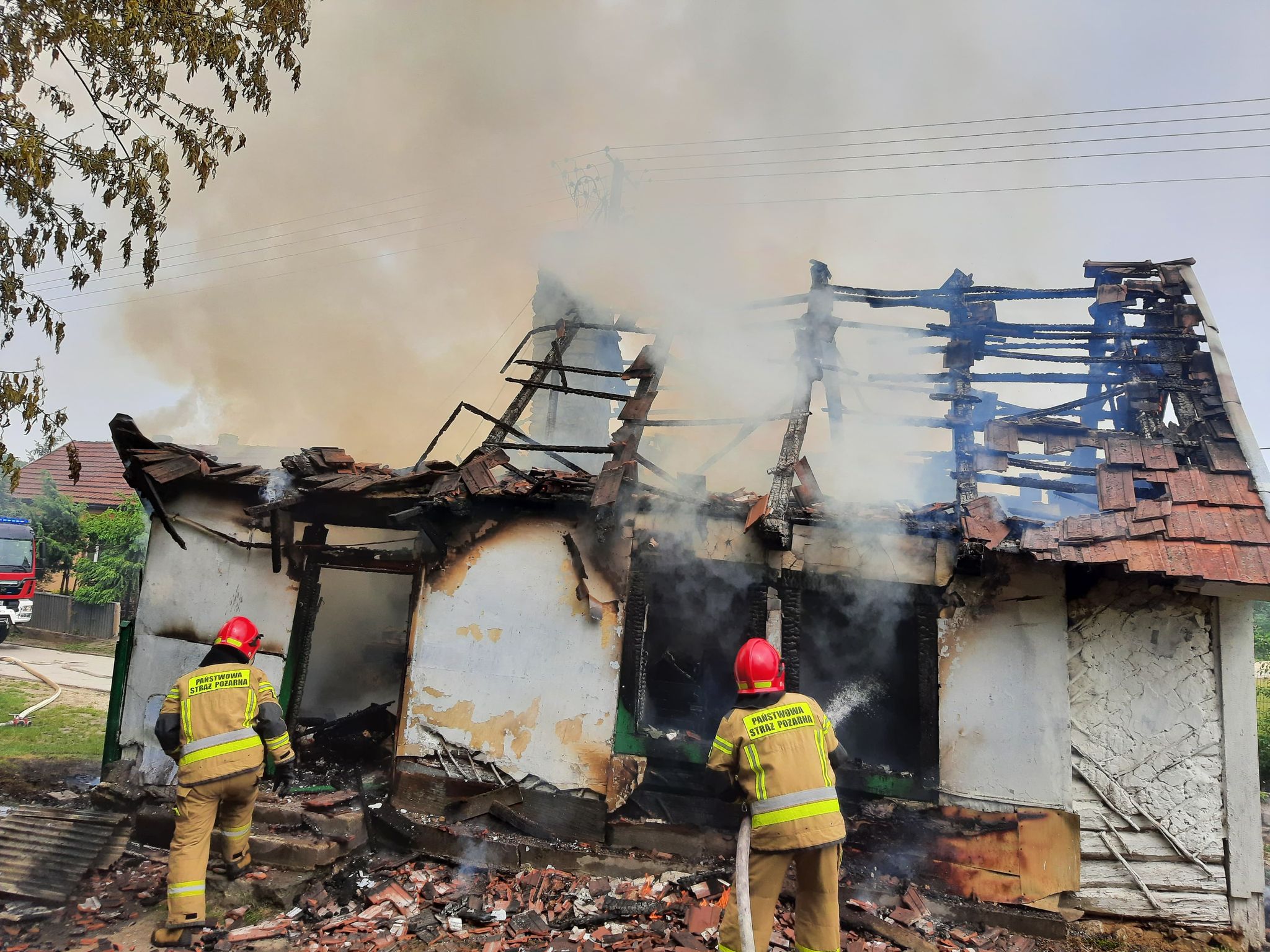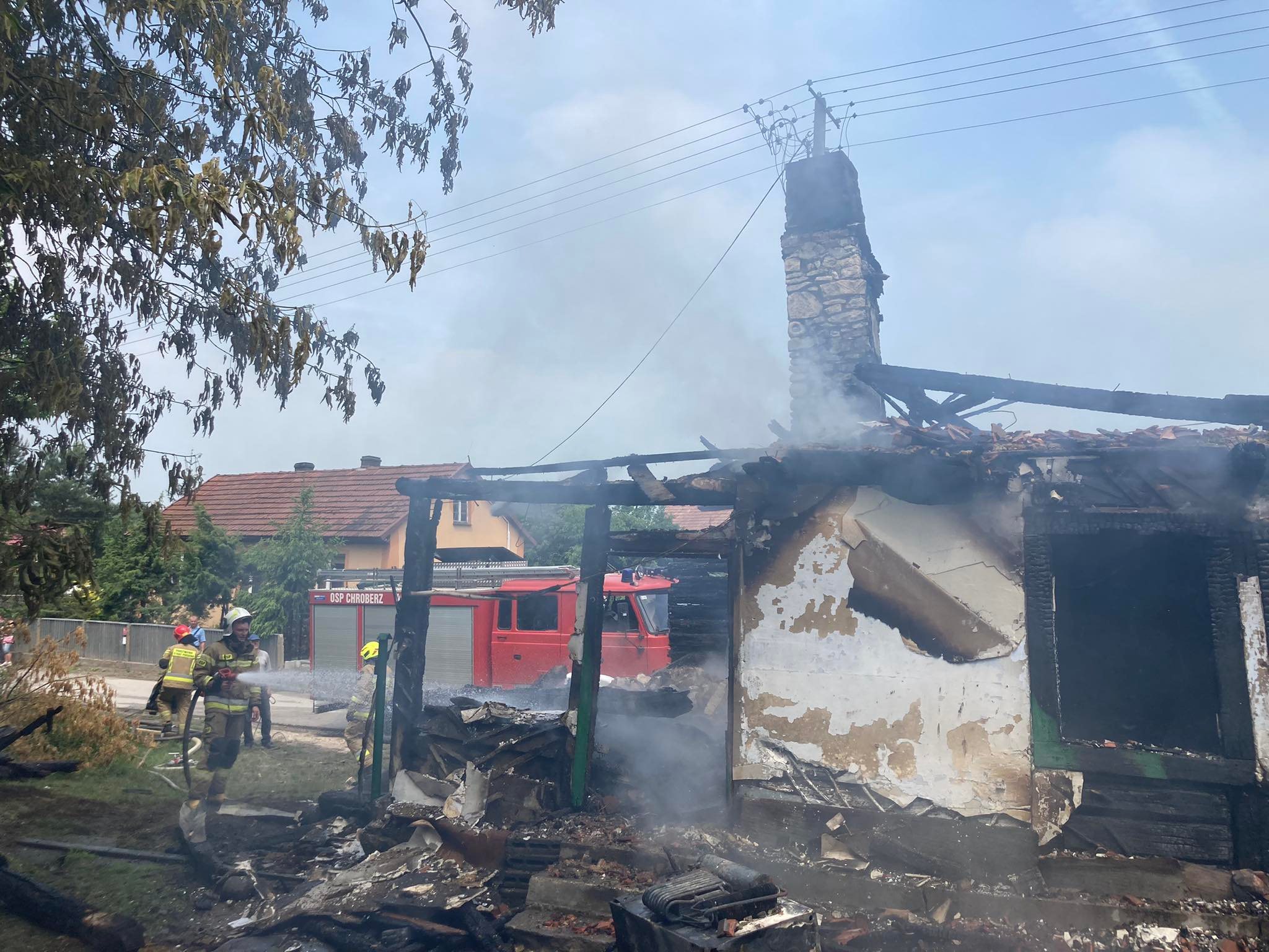 Po przybyciu na miejsce zdarzenia Kierujący Działaniem Ratowniczym ustalił, iż pożarem objęty jest jednorodzinny budynek mieszkalny o konstrukcji drewnianej. Dwie osoby zamieszkujące w obiekcie opuściły go przed przybyciem zastępów JOP. Ww. osobom strażacy udzielili kwalifikowanej pierwszej pomocy, po czym przekazano je Zespołowi Ratownictwa Medycznego. Na mocy decyzji ZRM jedna osoba została przetransportowana do szpitala. Strażacy po zabezpieczeniu miejsca zdarzenia niezwłocznie podali dwa prądy wody w natarciu na pożar oraz jeden w obronie zagrożonego, pobliskiego budynku gospodarczego. Po zlokalizowaniu zagrożenia strażacy przystąpili do prac rozbiórkowych uszkodzonej konstrukcji obiektu oraz przelali wodą nadpalone elementy wyposażenia wyniesione z pogorzeliska. Po zakończeniu działań miejsce działań sprawdzono przy użyciu kamery termowizyjnej, która nie wykazała dalszego zagrożenia. Na miejsce zdarzenia przybyli także przedstawiciele samorządu terytorialnego, którzy zobowiązali się do zapewnienia wsparcia mieszkańcom strawionego przez ogień budynku.