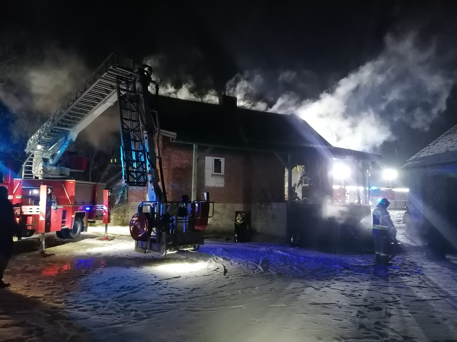 5 stycznia 2025 r. około godz. 19.50 do stanowiska kierowania komendanta powiatowego PSP w Pińczowie wpłynęło zgłoszenie o pożarze w budynku mieszkalnym konstrukcji murowanej, w miejscowości Żurawniki, gmina Złota. Do zdarzenia zadysponowano 3 zastępy z pińczowskiej Jednostki Ratowniczo-Gaśniczej PSP oraz dwa zastępy z Jednostek Ochotniczych Straży Pożarnych z miejscowości Złota i Chroberz. Po przybyciu na miejsce zdarzenia kierujący działaniem ratowniczym ustalił, iż pożarem objęte jest wnętrze całego parterowego domu oraz poddasze. Strażacy ustalili, że przebywająca w budynku kobieta znajduje się u sąsiadów pod opieką przybyłego na miejsce zespołu ratownictwa medycznego. Poparzona poszkodowana sama opuściła budynek przed przybyciem zastępów straży pożarnej. Sąsiedzi twierdzili, że w budynku może przebywać jeszcze mężczyzna. Działania strażaków polegały na prowadzeniu poszukiwań mężczyzny z równoczesnym gaszeniem ognia. Do budynku wprowadzono roty strażaków w sprzęcie ochronnym podając trzy prądy wody. Nie odnaleziono nikogo w budynku. W trakcie dalszych działań gaśniczych policjanci poinformowali strażaków, że poszukiwany mężczyzna przebywa w sąsiedniej miejscowości – nie był obecny w momencie wystąpienia pożaru. Poparzona kobieta została zabrana przez karetkę pogotowia do szpitala. Z budynku wyniesiono dwie butle 11 kg. z gazem propan – butan. Po zakończeniu działań gaśniczych teren pożaru sprawdzono przy użyciu kamery termowizyjnej i detektorów wielogazowych, które nie wykazały dalszego zagrożenia. Dzięki skutecznym działaniom jednostek ochrony przeciwpożarowej uratowano konstrukcję budynku, w którym wystąpił pożar. Na miejscu obecne były patrole policji, które prowadziły czynności dochodzeniowe. W działaniach trwających blisko 5 godzin udział wzięło 22 strażaków ratowników, w tym Komendant Powiatowy PSP w Pińczowie mł. bryg. Mariusz Fodymski. Apelujemy, aby wyposażać swoje domy w czujniki tlenku węgla oraz dymu – to naprawdę potrafi wcześnie wykryć pożar, a tym samym ratuje życie i zdrowie!