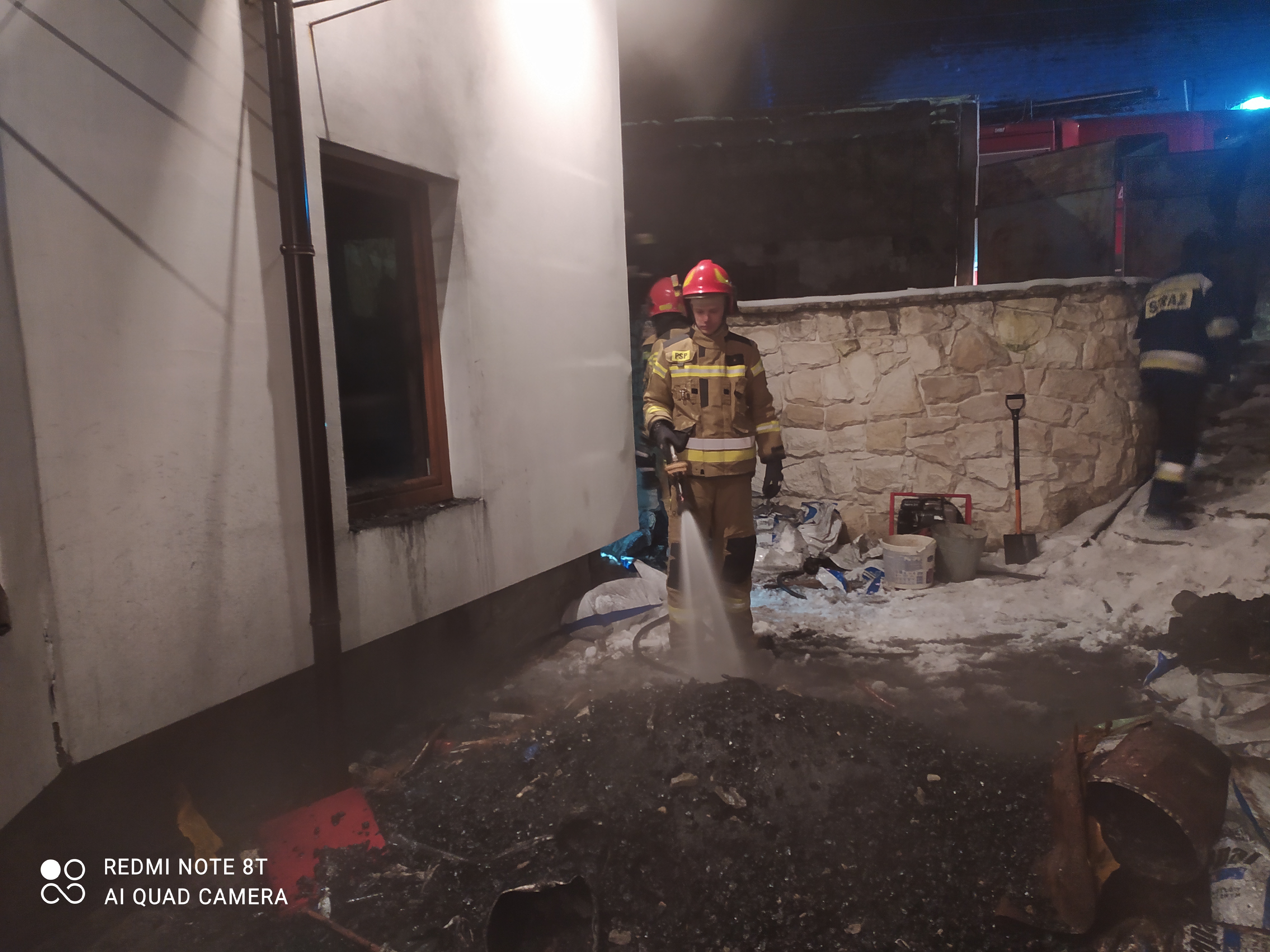 Po przybyciu na miejsce zdarzenia Kierujący Działaniem Ratowniczym ustalił, iż doszło do pożaru w kotłowni wspomnianego budynku. Działania zastępów JOP polegały na zabezpieczeniu miejsca zdarzenia i podaniu prądu wody celem ugaszenia opału zgromadzonego w kotłowni. Równocześnie odpowiednio zabezpieczeni ratownicy przystąpili do przeszukania pomieszczeń celem wykluczenia obecności osób wewnątrz. W toku przeszukania nie stwierdzono osób poszkodowanych. Następnie przewietrzono obiekt oraz dokonano jego monitoringu na obecność substancji niebezpiecznych jak również sprawdzono przyległe pomieszczenia przy użyciu kamery termowizyjnej. W takcie działań w pomieszczeniu kotłowni ujawniono rozerwany płaszcz butli 11 kg propan butan. Z kotłowni usunięto także zgromadzony opał, który przelano wodą. Z uwagi na naruszenie konstrukcji nośnej ścian budynku o zdarzeniu powiadomiono Powiatowego Inspektora Nadzoru Budowalnego.