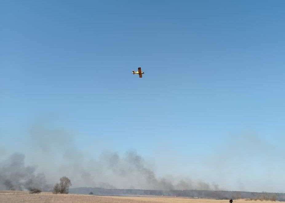 Tam pożar traw przeniósł się na pobliski kompleks leśny. W działania gaśnicze zaangażowano samolot gaśniczy, który w celu opanowania rozprzestrzeniania się pożaru wykonał cztery zrzuty wody. Z uwagi na silny wiatr, który sprzyjał rozwojowi pożaru oraz trudnodostępny teren konieczne było podzielenie miejsca działań na odcinki bojowe. Strażacy rozwijali linie gaśnicze na odległość sięgającą 400 metrów oraz z wykorzystaniem pomp szlamowych budowali linie gaśnicze wykorzystując zasoby wodne rowów melioracyjnych. Jak zawsze przy tego typu pożarach prowadzono także działania gaśnicze z wykorzystaniem tłumic.