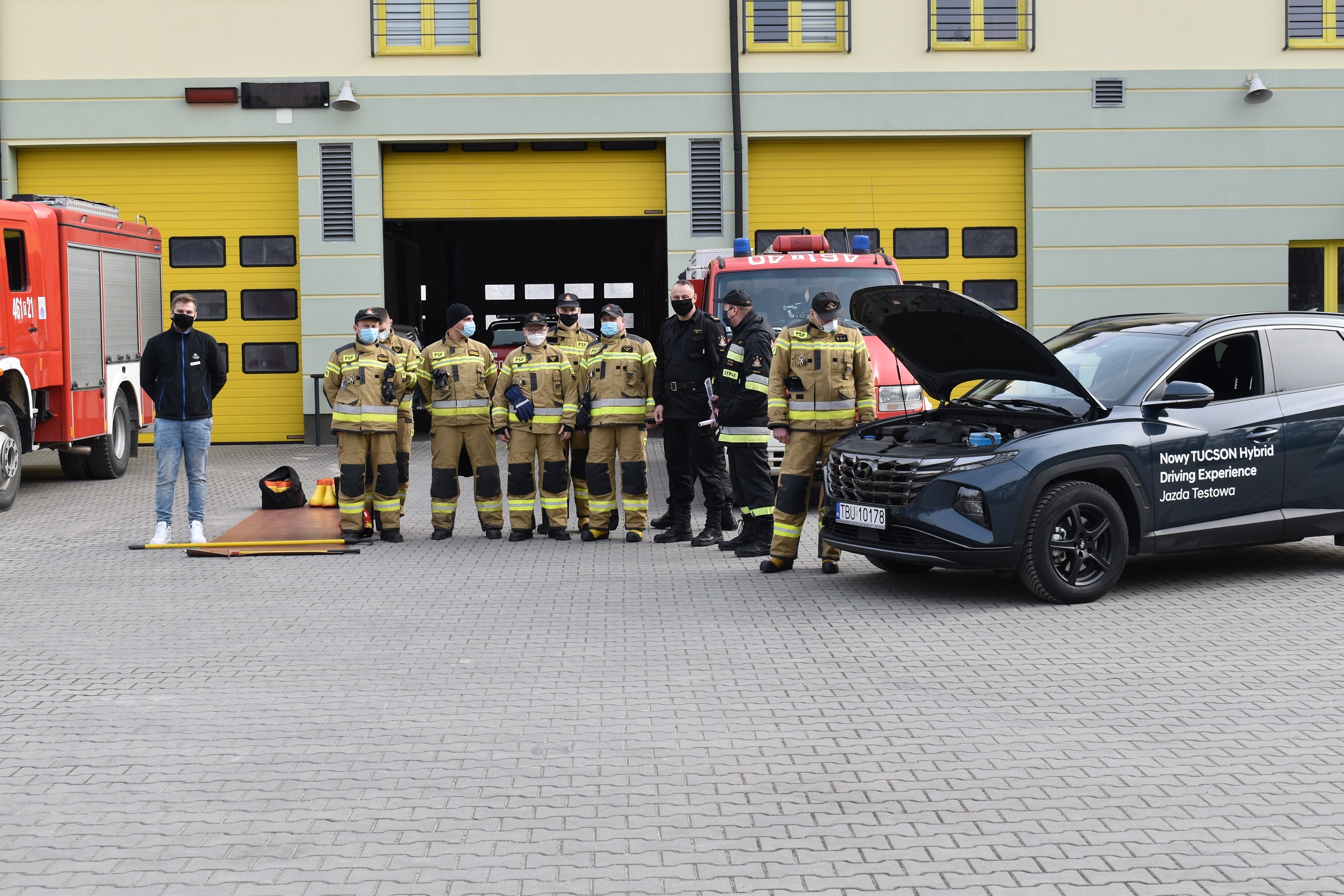 Dzięki uprzejmości dealera marki Hyundai z Buska Zdroju strażacy tutejszej komendy mieli możliwość teoretycznego zapoznania się z budową oraz zasadą działania pojazdów napędzanych zasilaniem akumulatorowym. Podczas szkolenia prezentowane były dwa modele wymienionej marki Kona o napędzie elektrycznym oraz Tucson o napędzie hybrydowym. Przedstawiciele firmy w sposób praktyczny przedstawili sposób postępowania z pojazdami z uwzględnieniem wszystkich możliwych do wystąpienia zagrożeń podczas działań ratowniczo – gaśniczych.