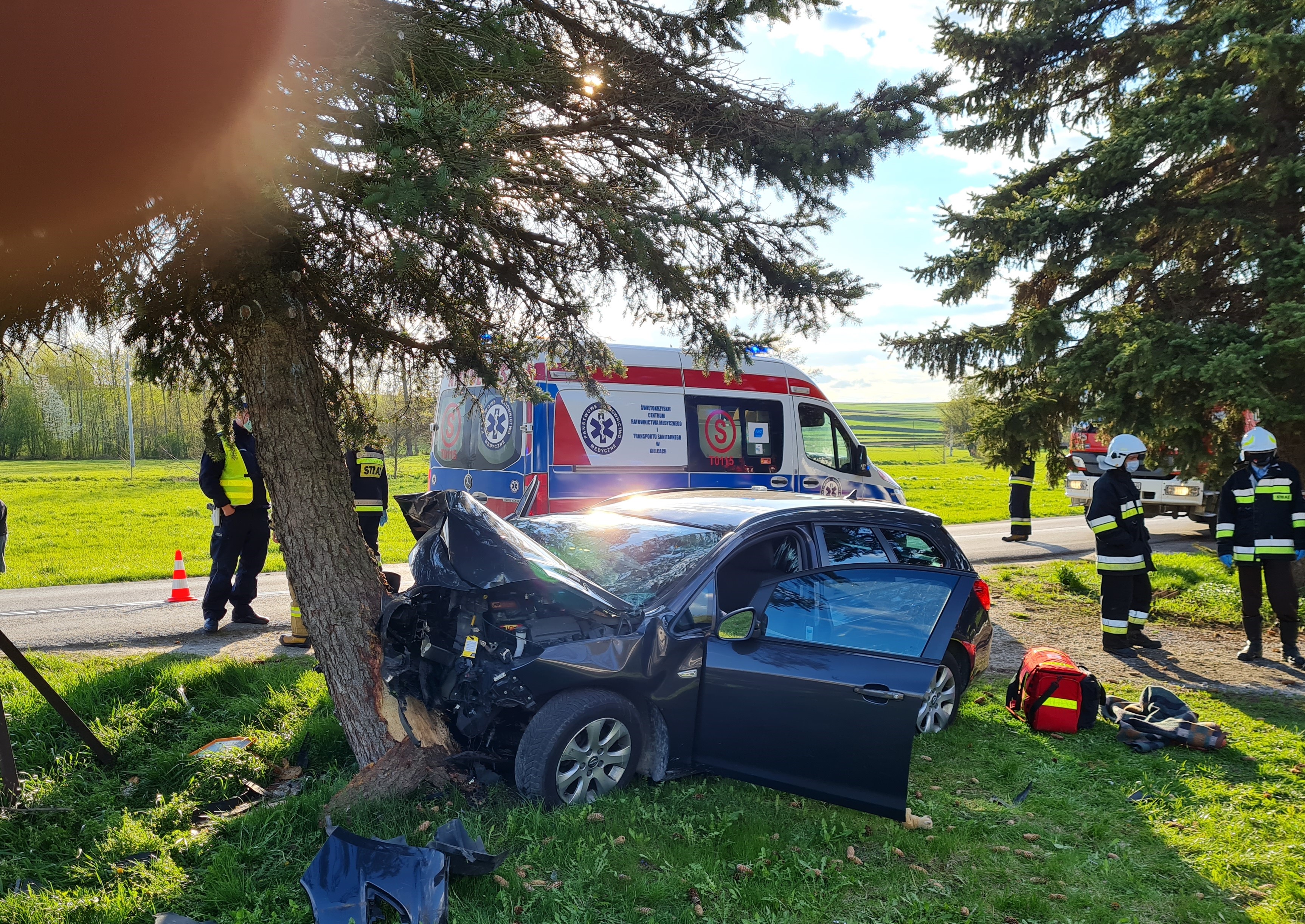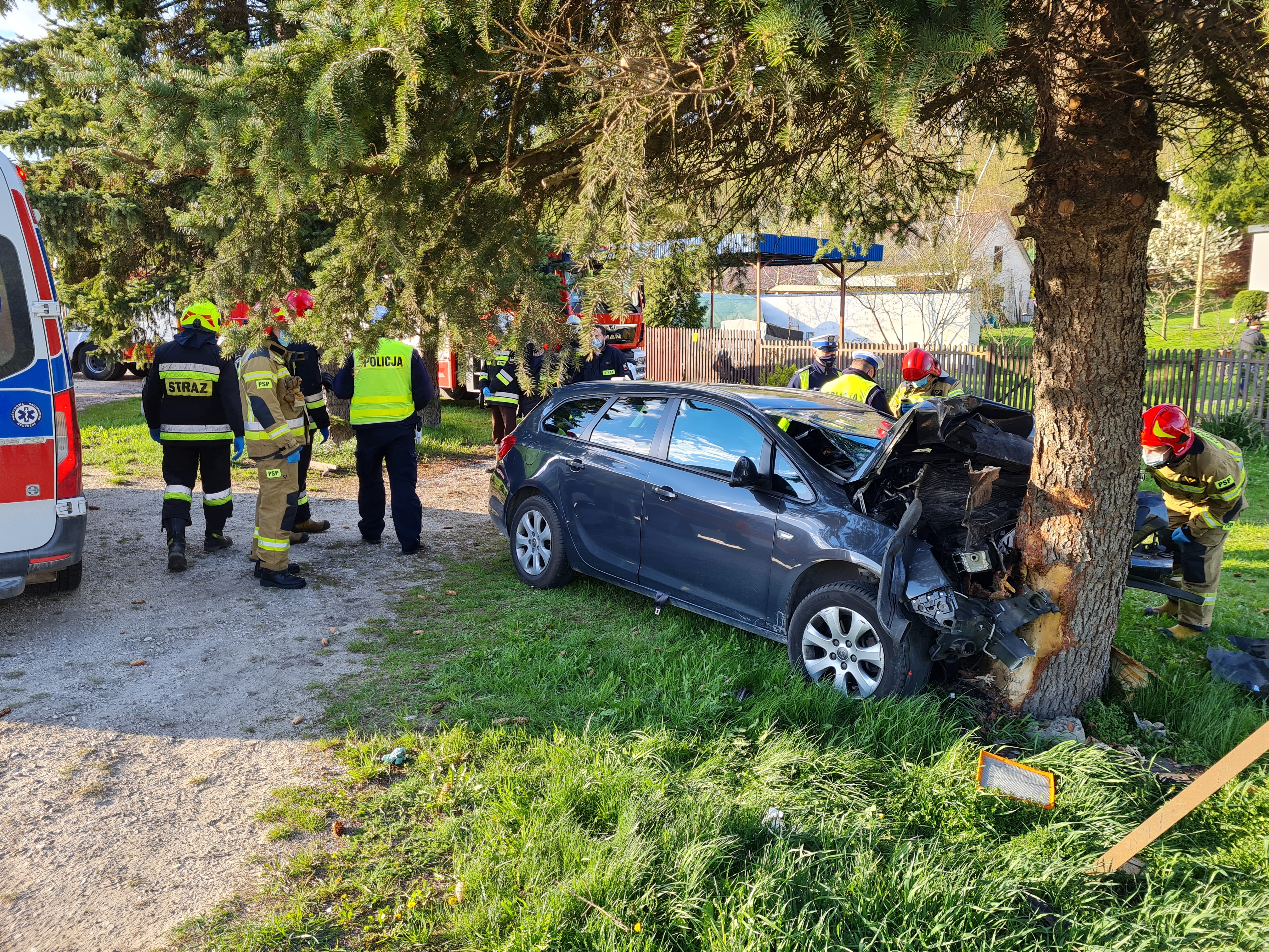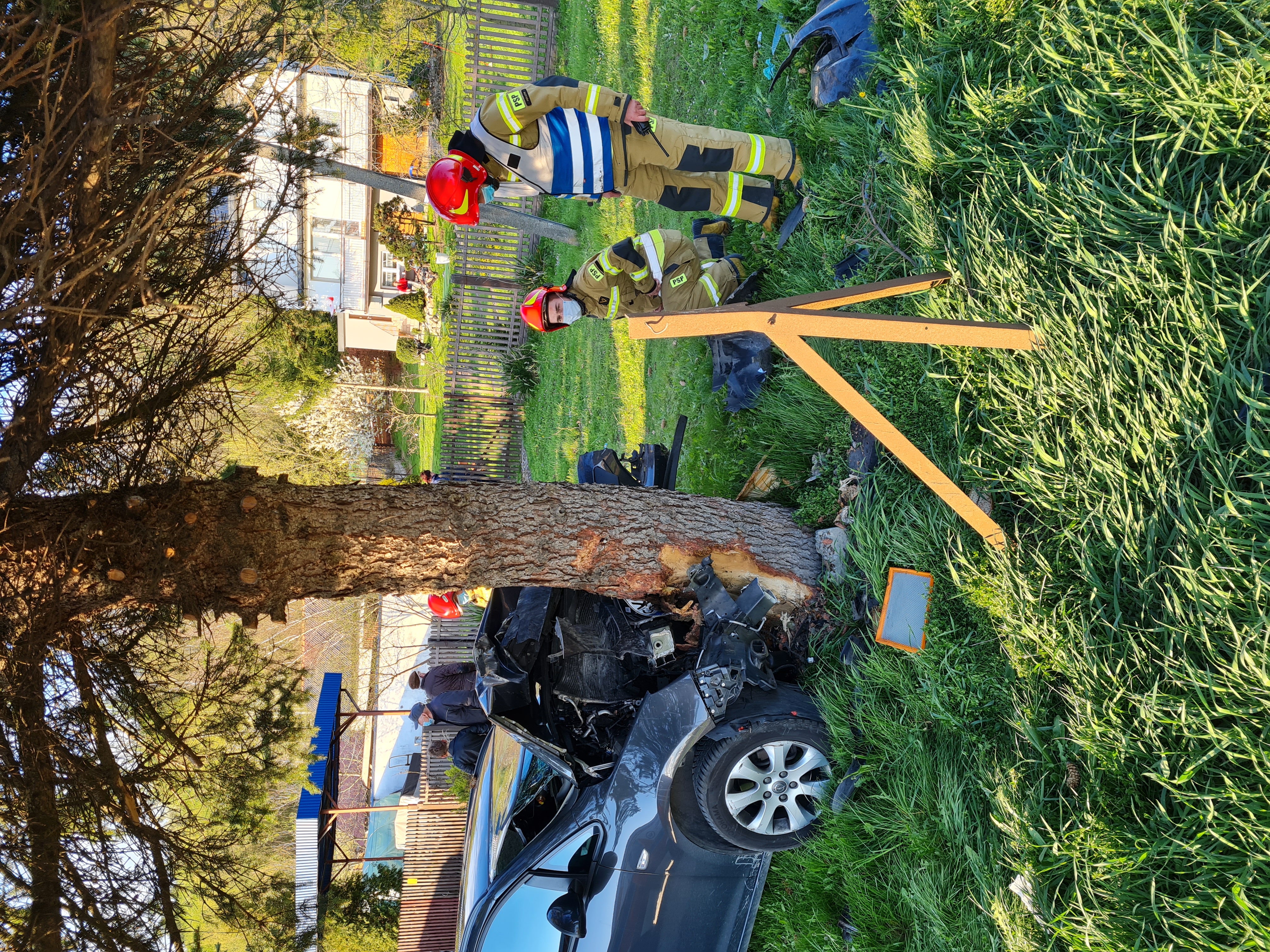 Po przybyciu na miejsce zdarzenia Kierujący Działaniem Ratowniczym ustalił, iż pojazd marki Opel Astra uderzył w przydrożne drzewo. Samochodem podróżowały trzy osoby. Dwie osoby opuściły pojazd samodzielnie, natomiast trzecią osobę z uszkodzonego pojazdu wydobyli strażacy, którzy następnie udzielili poszkodowanym kwalifikowanej pierwszej pomocy polegającej m.in. na stabilizacji kręgosłupa, tamowaniu krwotoków zewnętrznych oraz unieruchamianiu złamań i wsparciu psychicznym. Ze względu na stan poszkodowanego kierowcy podjęto decyzję o jego transporcie do szpitala z wykorzystaniem śmigłowca Lotniczego Pogotowia Ratunkowego. Strażacy niezwłocznie przygotowali miejsce do lądowania śmigłowca LPR na pobliskiej łące. Dwie pozostałe osoby poszkodowane zostały zabrane do Szpitala Powiatowego w Busku-Zdroju.