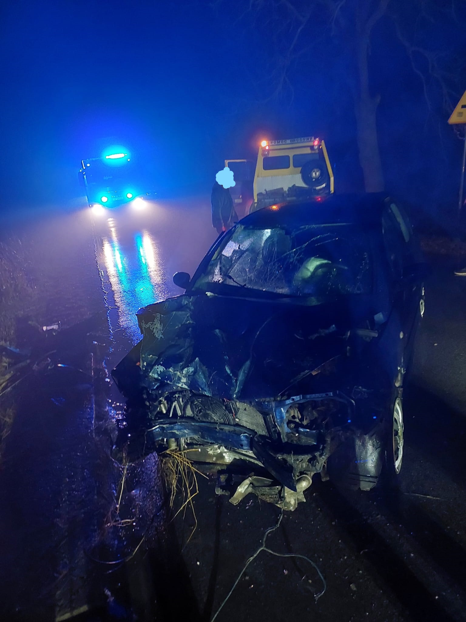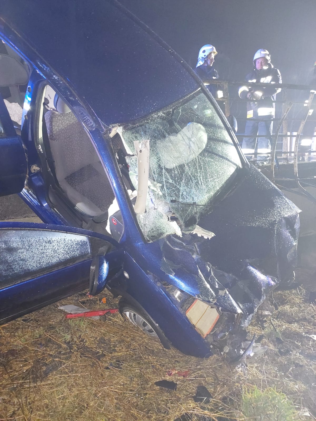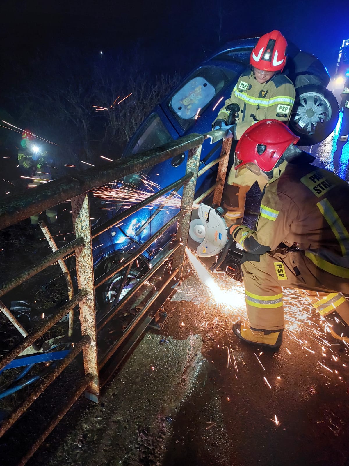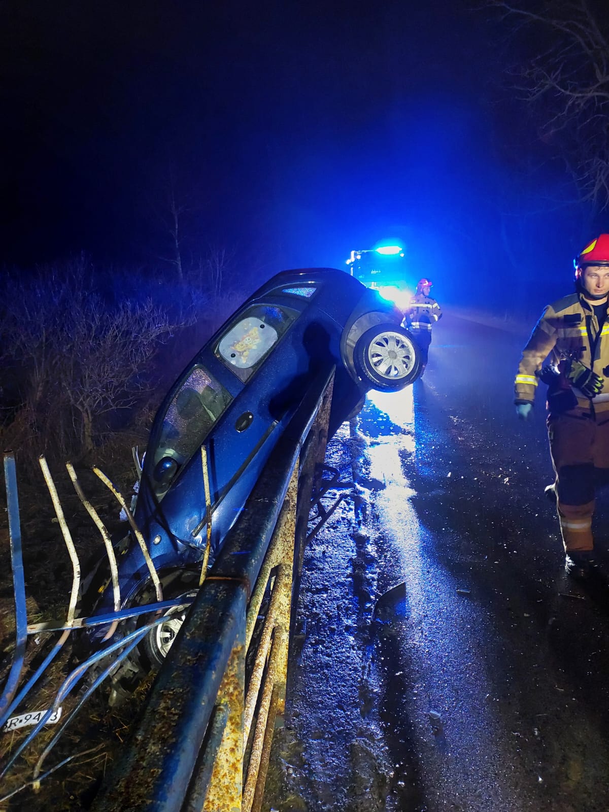 Po przybyciu na miejsce zdarzenia Kierujący Działaniem Ratowniczym ustalił, że na drodze powiatowej samochód osobowy, którym podróżowała kobieta z 1,5 rocznym dzieckiem, wjechał w barierę i wypadł z drogi. Osoby podróżujące autem opuściły pojazd przed przybyciem służb ratowniczych. Działania strażaków polegały na zabezpieczeniu i oświetleniu miejsca wypadku oraz ograniczeniu skutków zdarzenia. Zespół ratownictwa medycznego przebadał osoby uczestniczący w zdarzeniu nie stwierdzając żadnych obrażeń. W czasie prowadzonych działań ratowniczych ruch na drodze powiatowej został wstrzymany, Policja wyznaczyła objazdy.