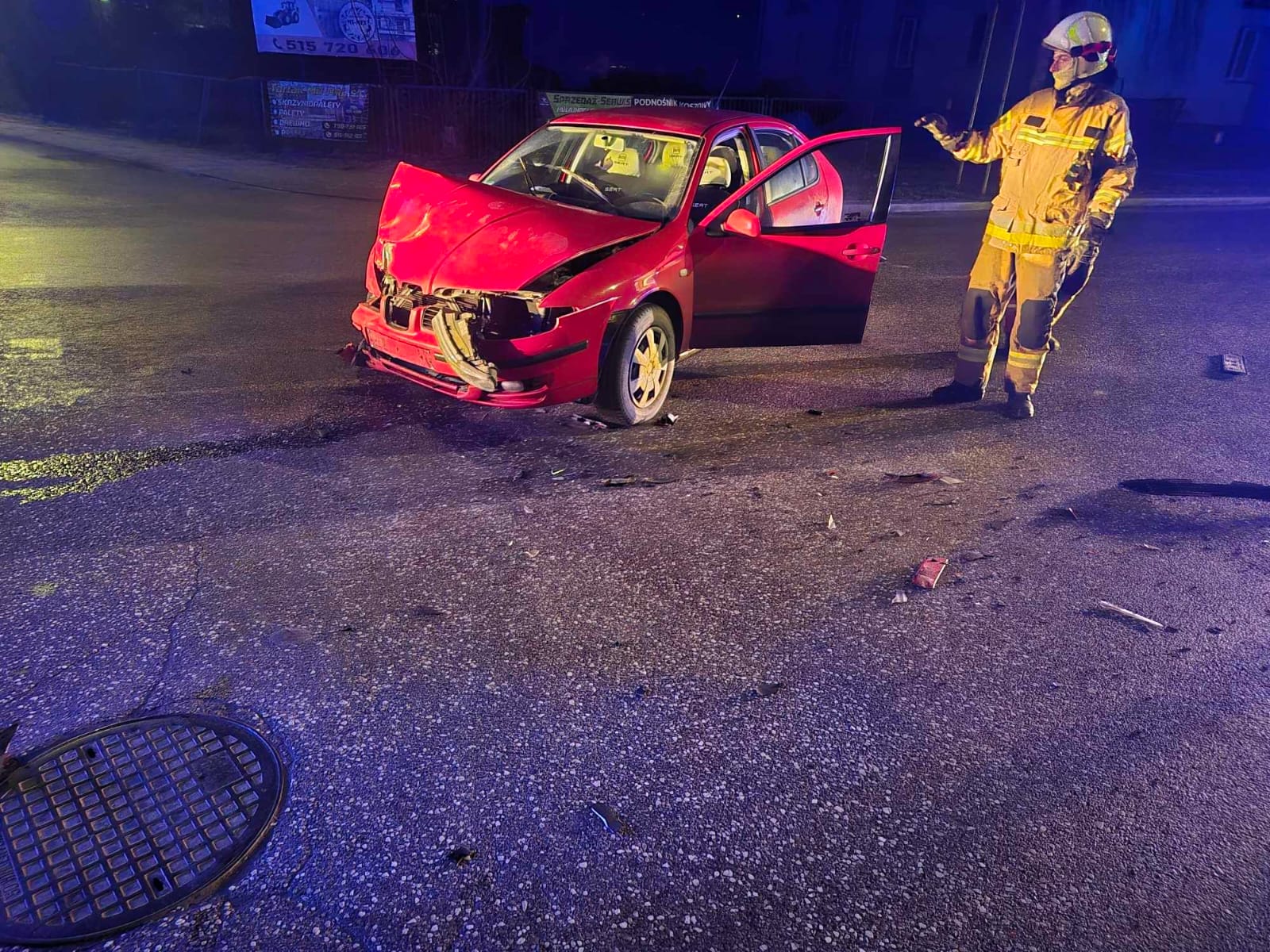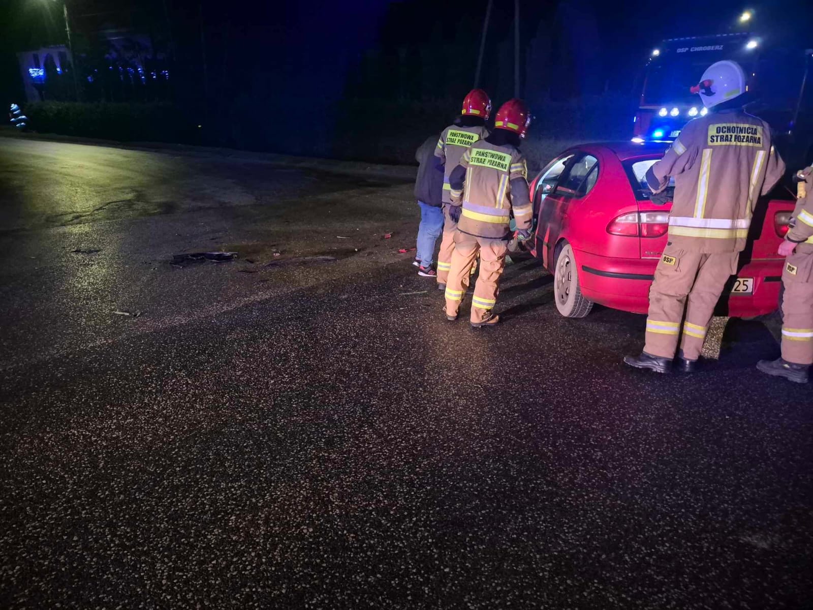 Po przybyciu na miejsce zdarzenia Kierujący Działaniem Ratowniczym ustalił, że doszło do zderzenia dwóch pojazdów marki Seat, którymi podróżowały łącznie trzy osoby. Poszkodowani wyszli z pojazdów przed przybyciem służb ratowniczych i nie odnieśli żadnych obrażeń. Działania strażaków polegały na zabezpieczeniu i oświetleniu miejsca zdarzenia, odłączeniu zasilania elektrycznego w obu pojazdach oraz ograniczeniu skutków zdarzenia poprzez zebranie rozbitych elementów i rozlanych płynów eksploatacyjnych z pojazdów. W działaniach brał udział patrol Policji. Ruch na drodze powiatowej odbywał się wahadłowo.