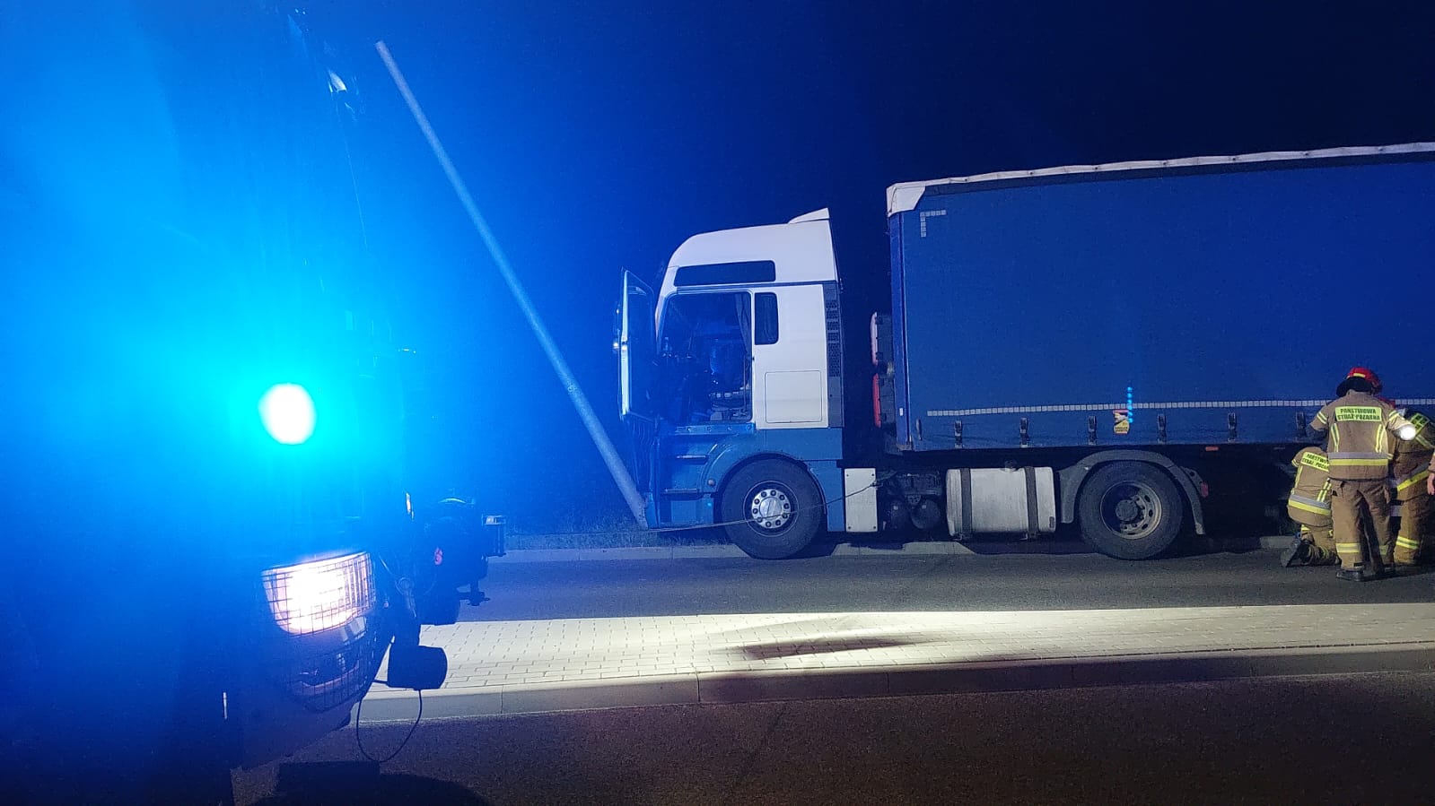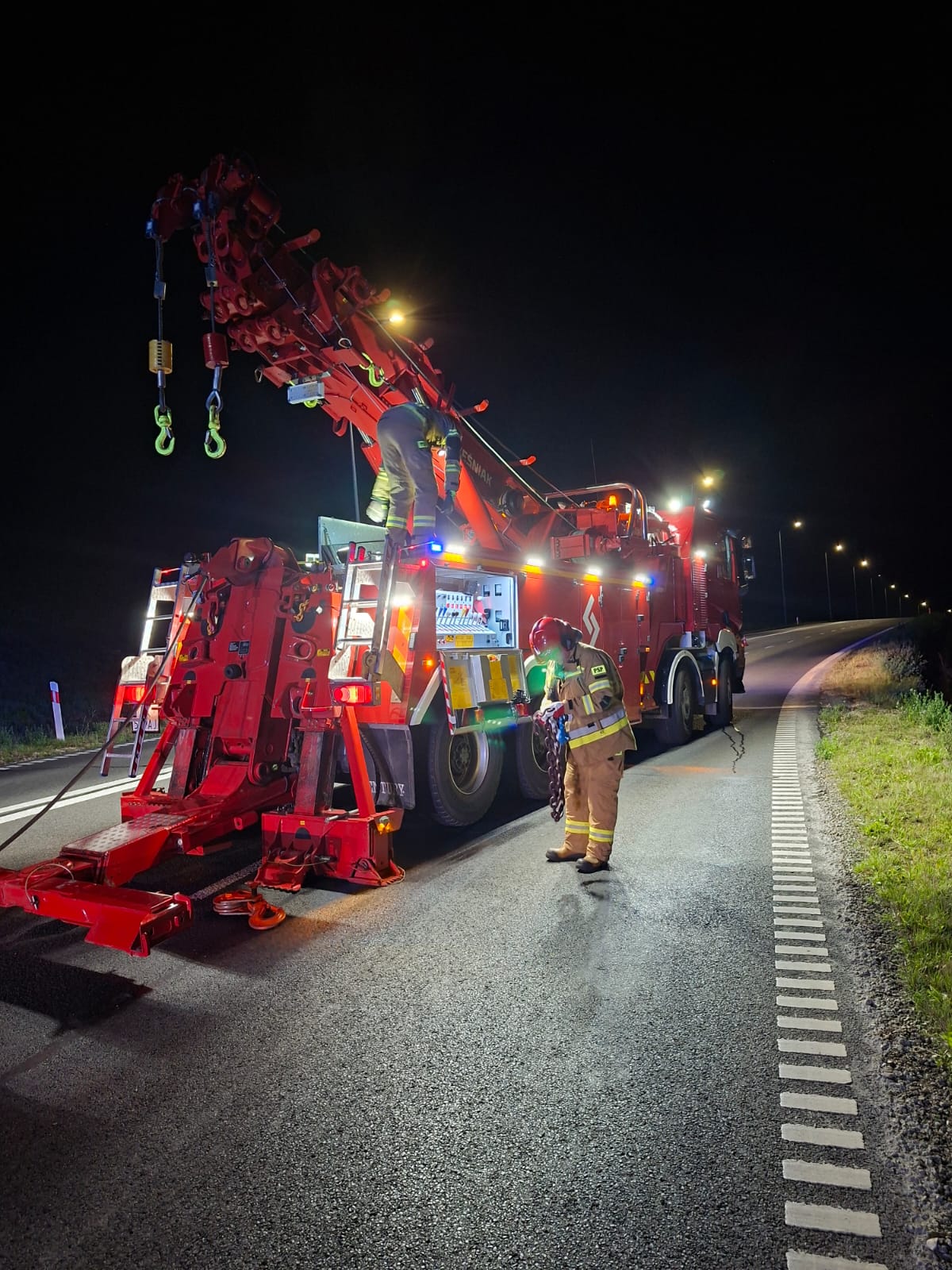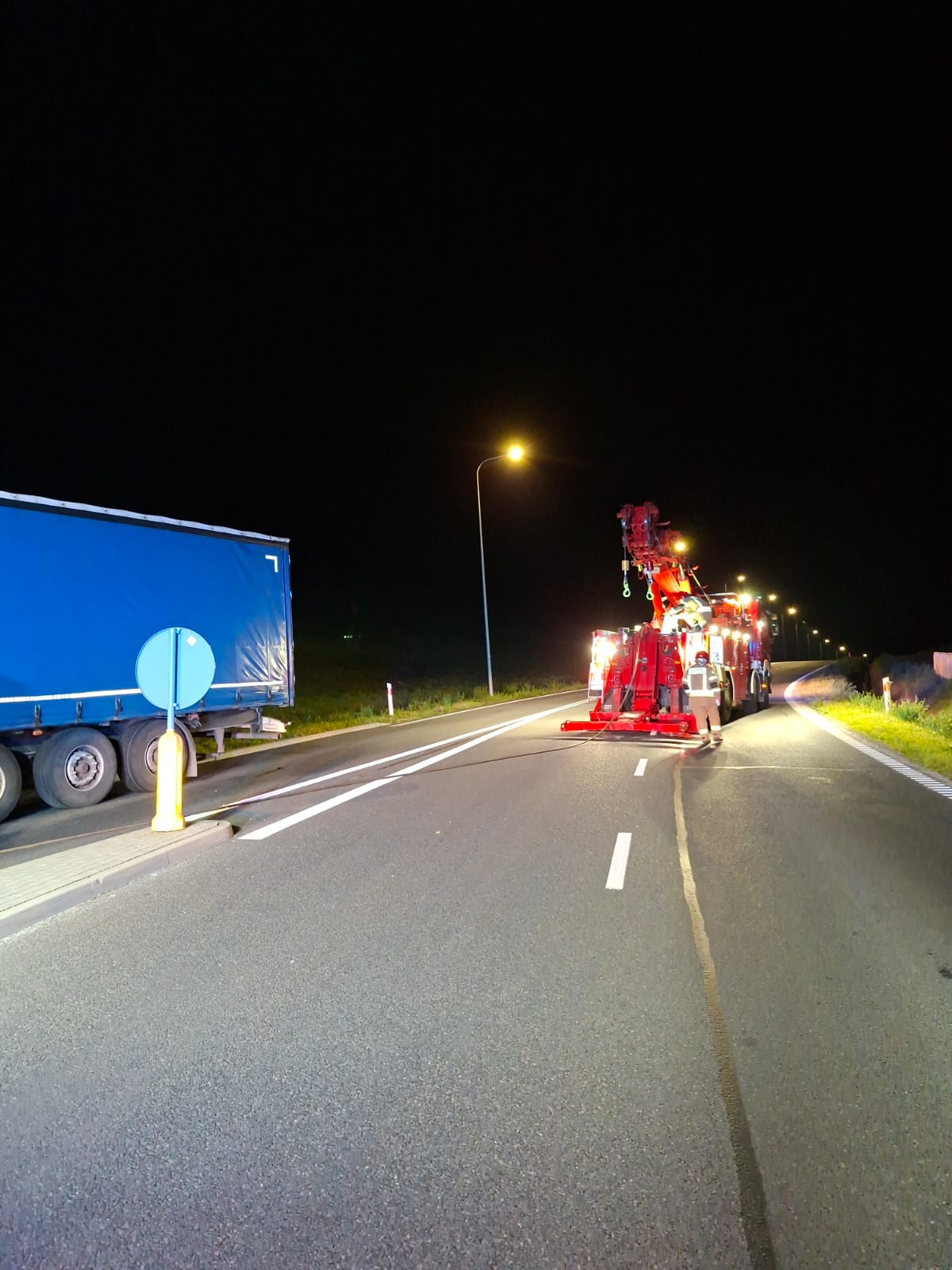 Po przybyciu na miejsce zdarzenia Kierujący Działaniem Ratowniczym ustalił, że doszło do zdarzenia drogowego z udziałem pojazdu, którym jechał tylko kierowca. Osoba poszkodowana wyszła z samochodu przed przybyciem służb ratowniczych i znajdowała się pod opieką przybyłego na miejsce Zespołu Ratownictwa Medycznego. Działania strażaków polegały na zabezpieczeniu i oświetleniu miejsca zdarzenia oraz ograniczeniu skutków zdarzenia poprzez przemieszczenie pojazdu z pobocza na jezdnię. W tym celu zadysponowano dodatkowo ciężki samochód ratownictwa drogowego z Jednostki Ratowniczo-Gaśniczej nr 1 w Kielcach. Poszkodowany kierowca został zabrany do szpitala. Droga w miejscu zdarzenia była zablokowana – Policja wyznaczyła objazdy. Dzięki skutecznym działaniom ratowniczym pojazd oraz ładunek nie doznał dalszych uszkodzeń co spowodowało znaczne ograniczenie strat.