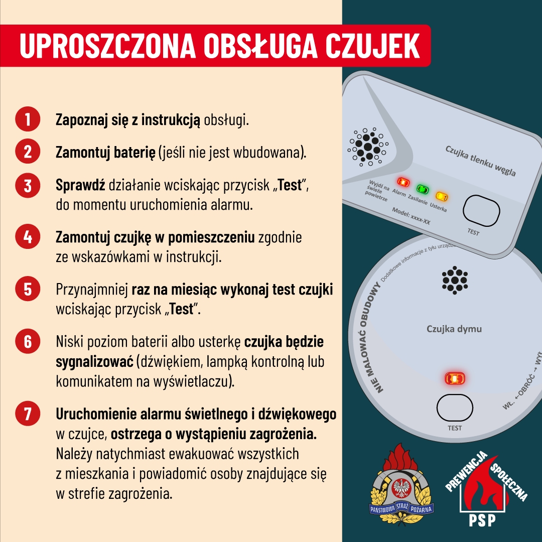 - Państwowa Straż Pożarna rekomenduje instalowanie czujek dymu i tlenku węgla.