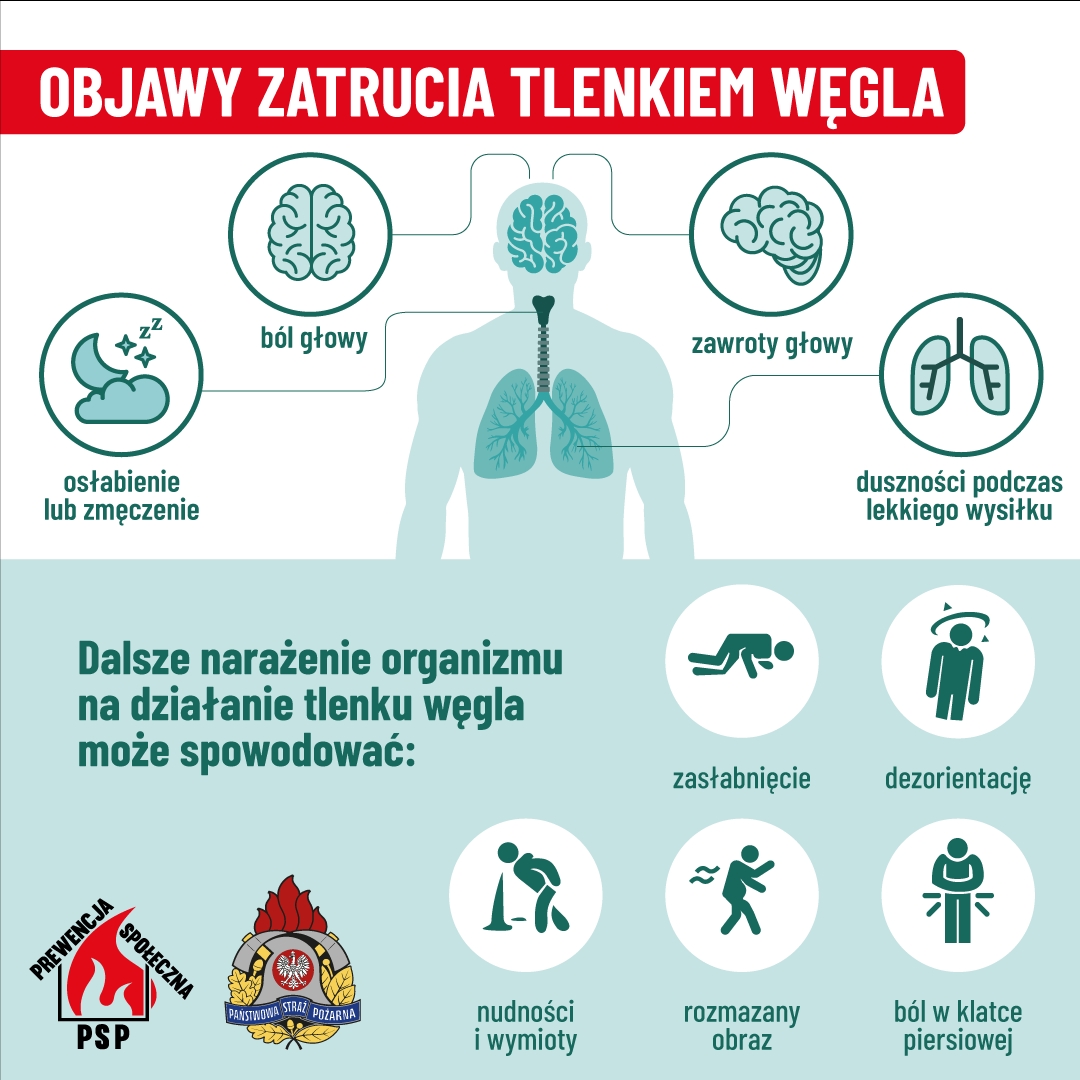 - W okresie grzewczym wzrasta ryzyko powstania pożarów i zatruć tlenkiem węgla w budynkach mieszkalnych. Źródłem emisji tlenku węgla są urządzenia grzewcze opalane drewnem, węglem, gazem, olejem opałowym.