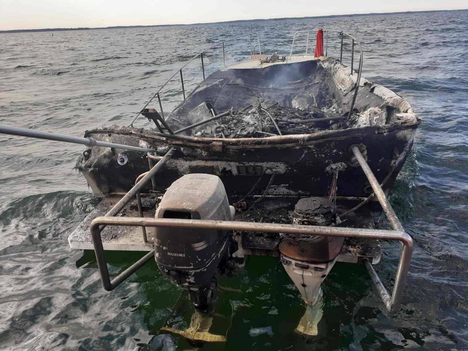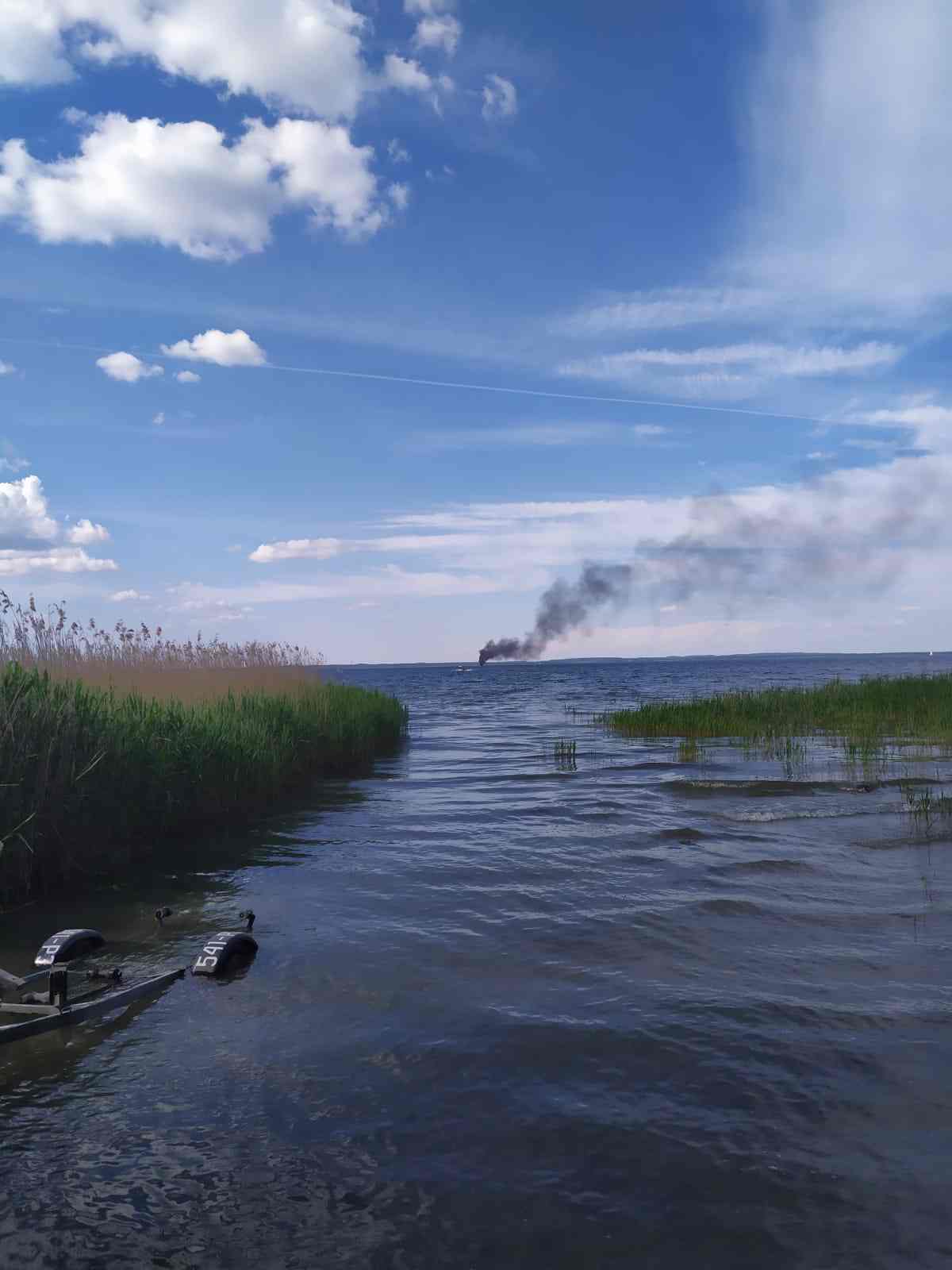 Groźny pożar łodzi motorowej na jez. Śniardwy.