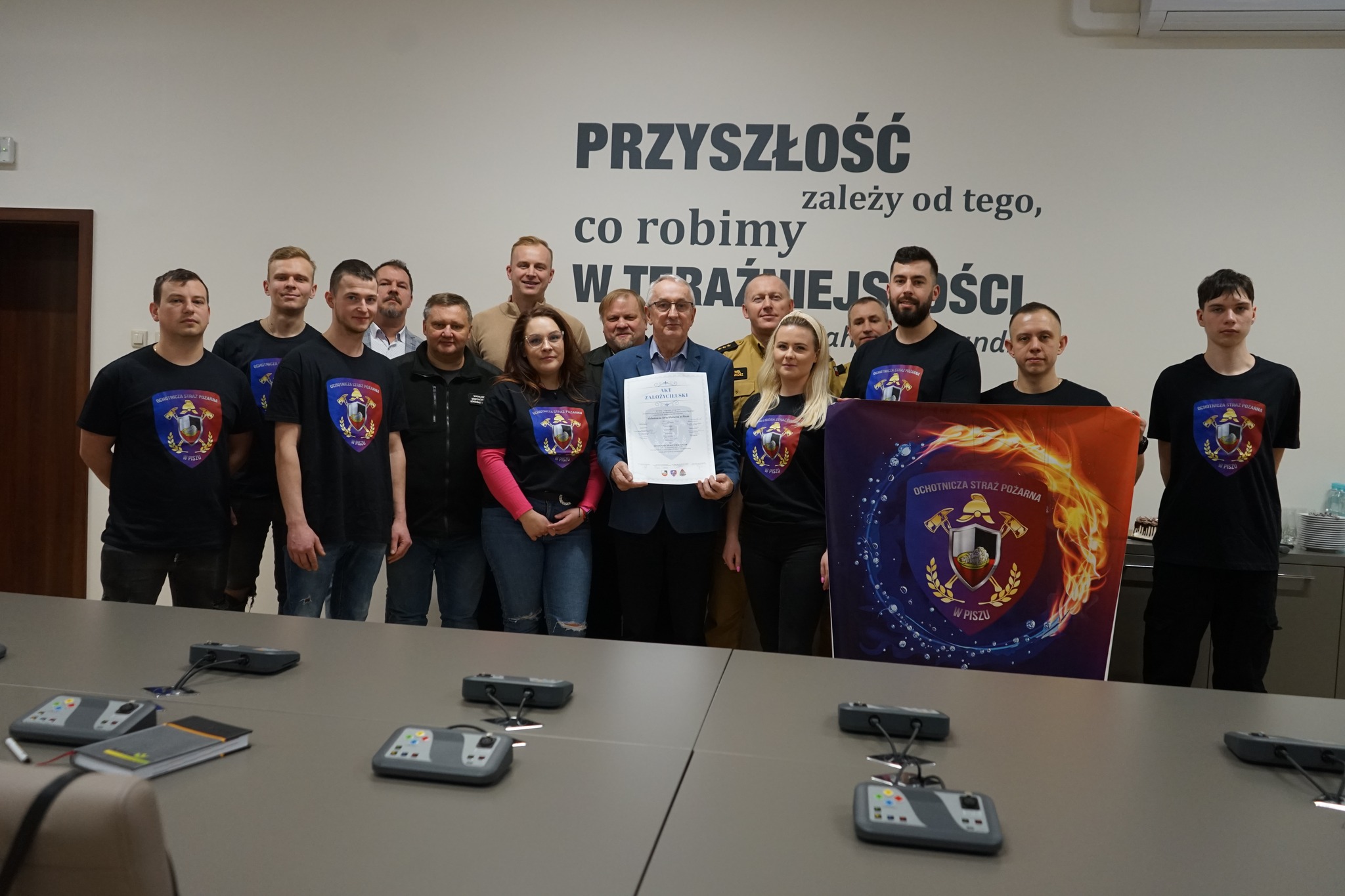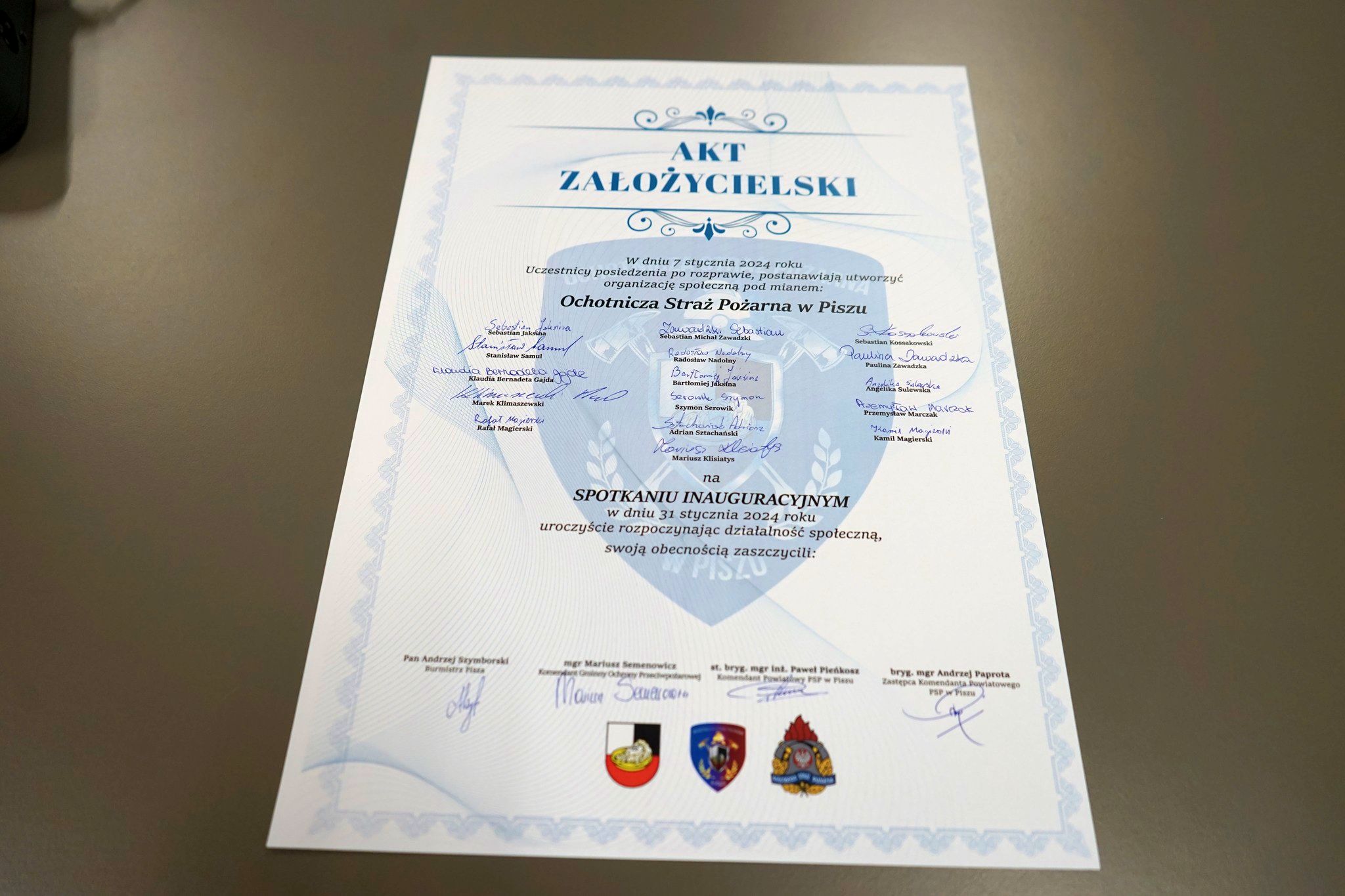 Z przyjemnością informujemy, iż 7 stycznia br. do życia została powołana Ochotnicza Straż Pożarna w Piszu. Obecnie w szeregach swoich zawiera 16 członków. Spotkanie inaugurujące działalność jednostki miało miejsce 31 stycznia 2024 r. w Urzędzie Miejskim w Piszu. W wydarzeniu uczestniczył Pan Andrzej Szymborski Burmistrz Pisza, Przewodniczący Rady Miasta Pan Edmund Lipnicki, Komendant Powiatowy PSP w Piszu st. bryg. mgr inż. Paweł Pieńkosz, zastępca Komendanta Powiatowego PSP w Piszu bryg. mgr Andrzej Paprota oraz Komendant Gminny Ochrony Przeciwpożarowej mgr Mariusz Semenowicz. Na spotkaniu podpisany został pamiątkowy akt założycielski. W trakcie spotkania omówione zostały strategiczne cele stowarzyszenia, plany na teraz, a także zamierzenia na przyszłość.