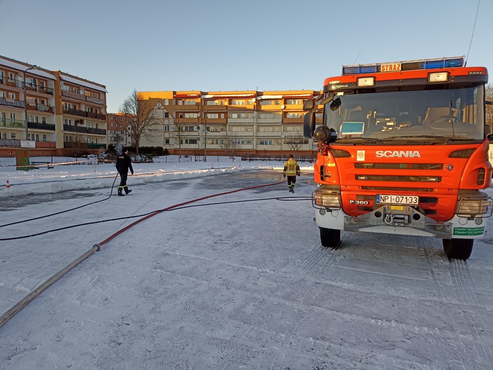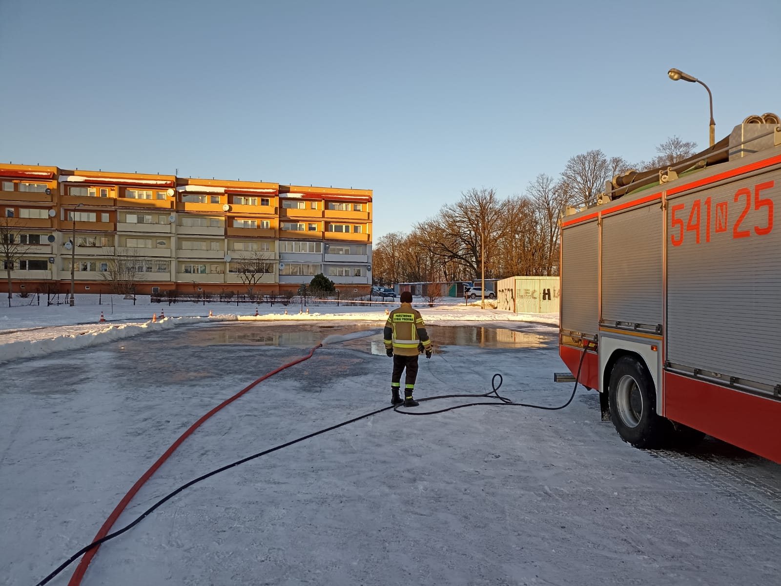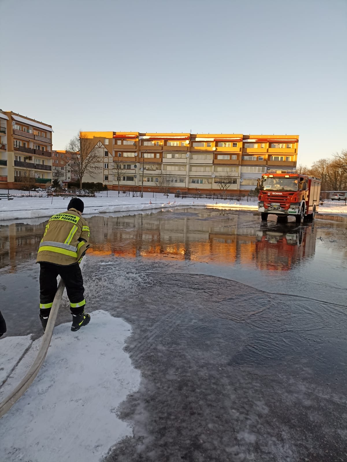 W sobotę strażacy wylewali wodę pod przyszłe lodowisko.