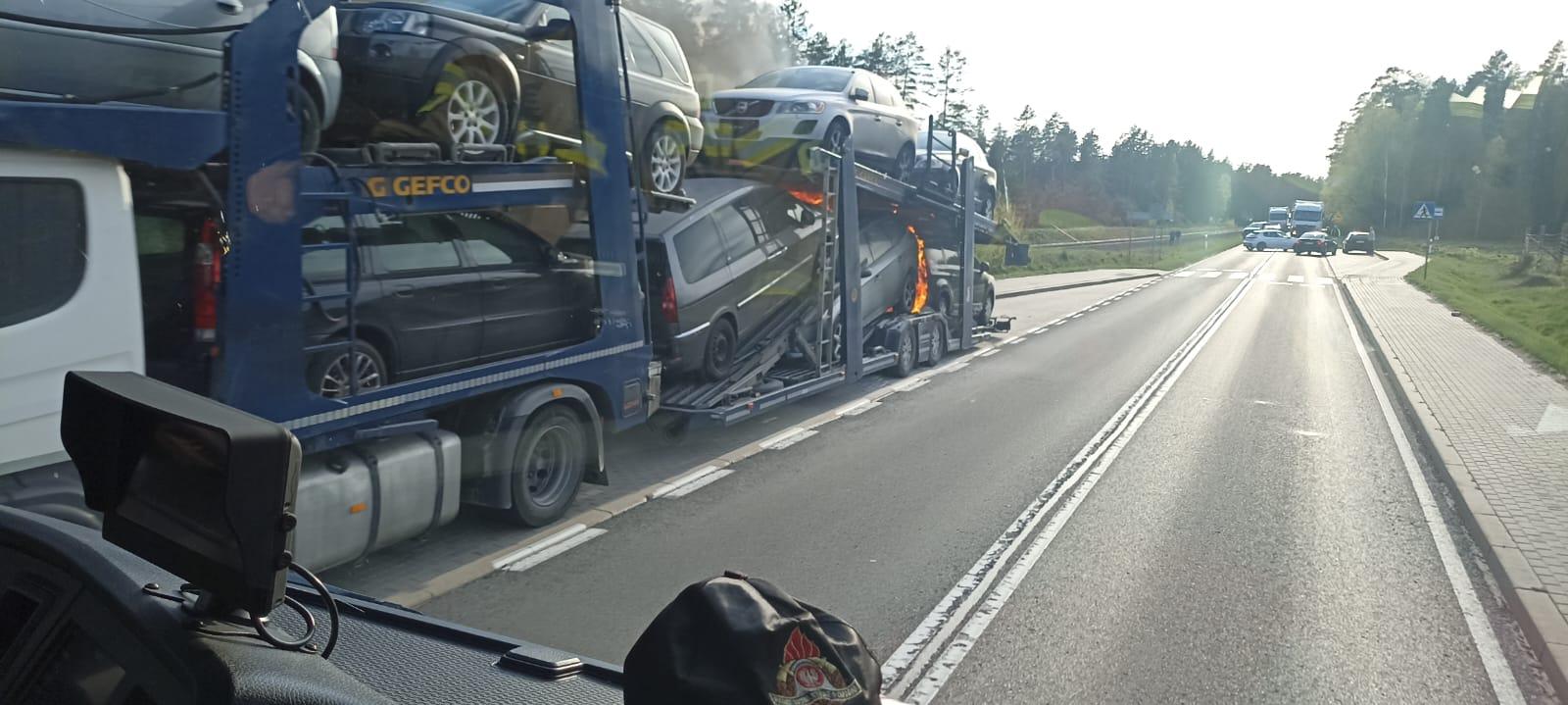 Pożar samochodu ciężarowego przewożącego samochody osobowe przy DK58