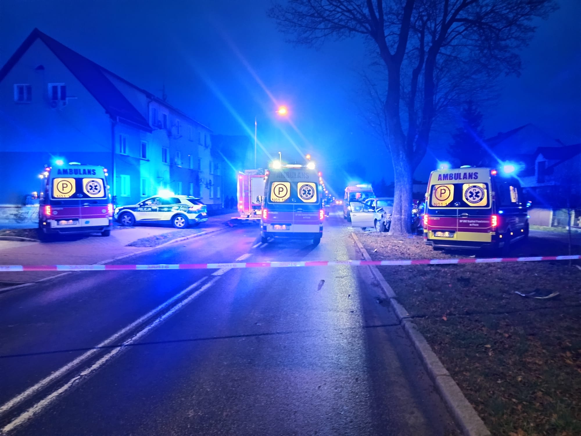 W dniu 24 listopada 2024 roku o godzinie 15:23 do Stanowiska Kierowania Komendanta Powiatowego w Piszu wpłynęło zgłoszenie o wypadku drogowym na ul. Wojska Polskiego w Piszu. Po dojeździe na miejsce zdarzenia zastępów Straży Pożarnej zastano samochód osobowy, który uderzył w przydrożne drzewo. Pojazdem podróżowały cztery osoby: dwie osoby dorosłe oraz dwoje dzieci. Działania zastępów polegały na zabezpieczeniu miejsca zdarzenia, ewakuowaniu poszkodowanych z pojazdu, pomocy ratownikom medycznym w udzielaniu pierwszej pomocy oraz odłączeniu akumulatora. Następnie zabezpieczono lądowisko dla helikoptera Lotniczego Pogotowia Ratunkowego (LPR), który przetransportował najciężej poszkodowane dziecko do szpitala w Ełku. Pozostałe trzy osoby, po wstępnym przebadaniu przez Zespół Ratownictwa Medycznego, zostały przewiezione karetkami do szpitali w Piszu i w Ełku na dalsze obserwacje. Na czas działań odcinek drogi był całkowicie zablokowany. W działaniach brały udział zastępy z KP i JRG Pisz w sile ośmiu ratowników, działania trwały blisko dwie godziny.