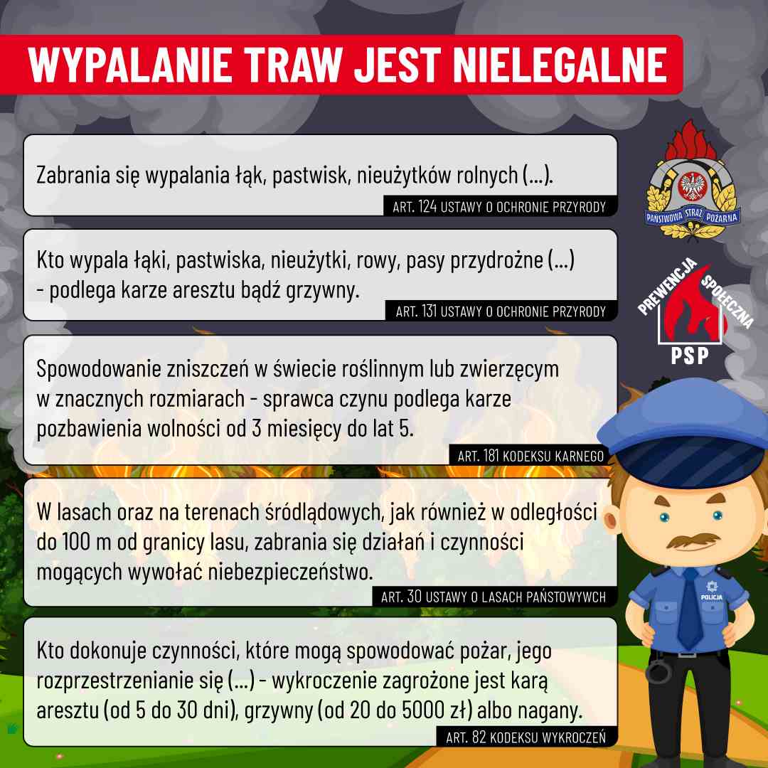 Wypalanie traw jest zabronione. Kodeks wykroczeń przewiduje za to karę grzywny w wysokości nawet do 5 tys. zł. Jeśli wypalanie traw spowoduje pożar, w którym zagrożone zostanie życie lub zdrowie ludzkie, można nawet trafić do więzienia na okres od roku do 10 lat.