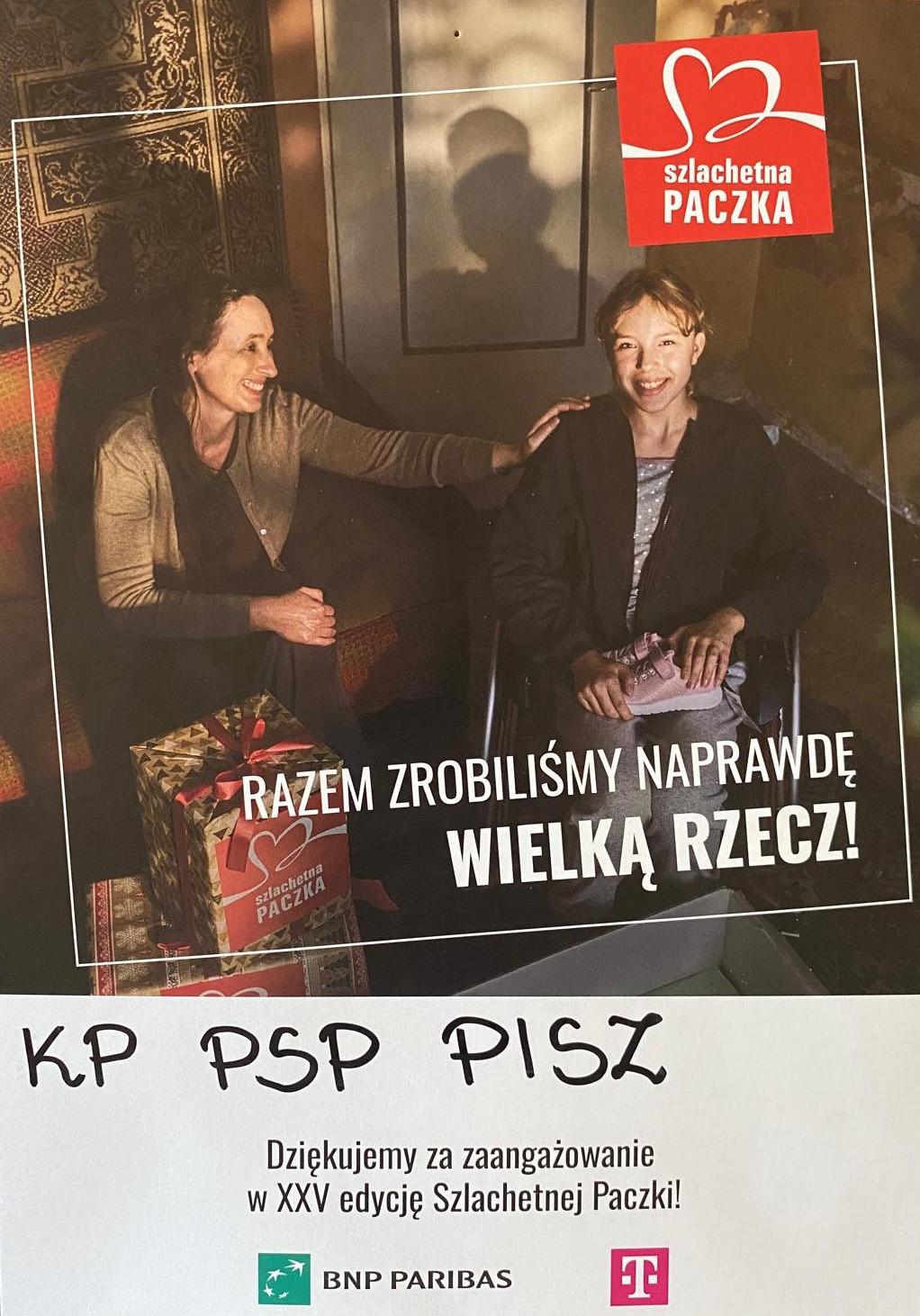 Po raz kolejny strażacy i pracownicy cywilni Komendy Powiatowej Państwowej Straży Pożarnej w Piszu uczestniczyli w projekcie „Szlachetna Paczka”. Jest to projekt, w ramach, którego można pomóc materialnie wybranej osobie lub rodzinie. Kwota, jaką udało się zebrać w tym roku wyniosła blisko 4900 zł. Wśród prezentów znalazła się miedzy innymi żywność trwała, chemia gospodarcza, koce, ręczniki, pralka, a także zabawki oraz przybory szkolne. Przekazanie miało miejsce 13 grudnia w miłej i świątecznej atmosferze.