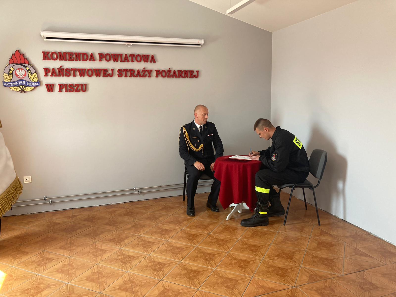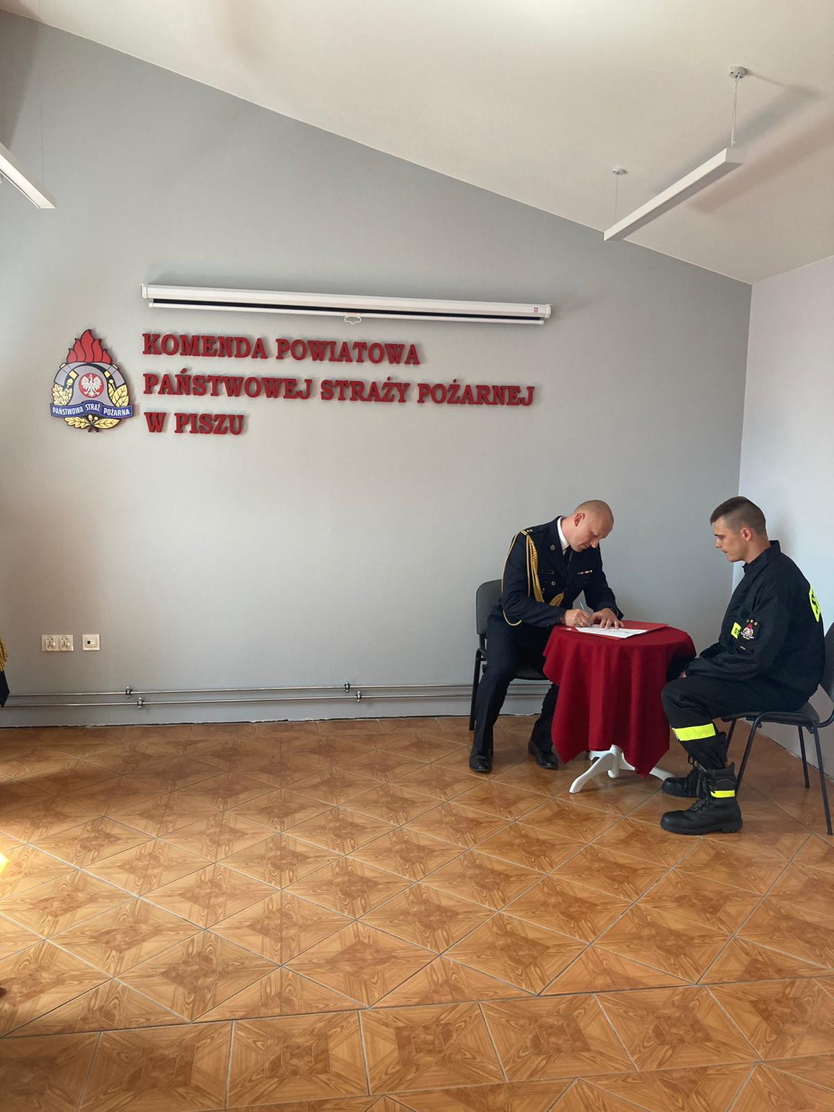 Na zakończenie uroczystości Komendant Powiatowy oraz nowoprzyjęty strażak złożyli podpisy pod aktami ślubowania, pieczętując ten ważny moment w karierze zawodowej.