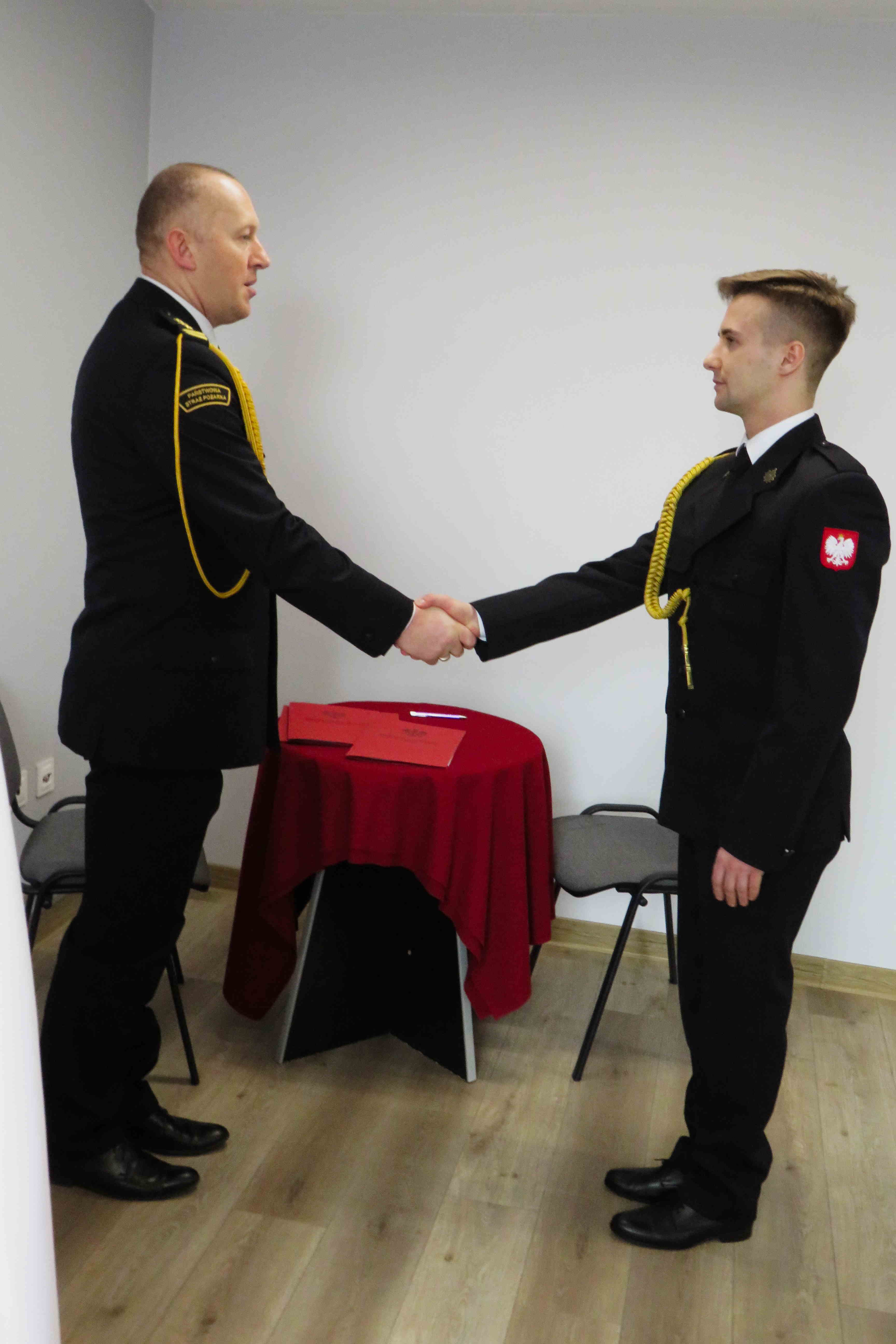Na zakończenie ślubowania Komendant Powiatowy oraz nowoprzyjęty strażak złożyli podpisy pod aktami ślubowania, pieczętując ten ważny moment w karierze zawodowej.